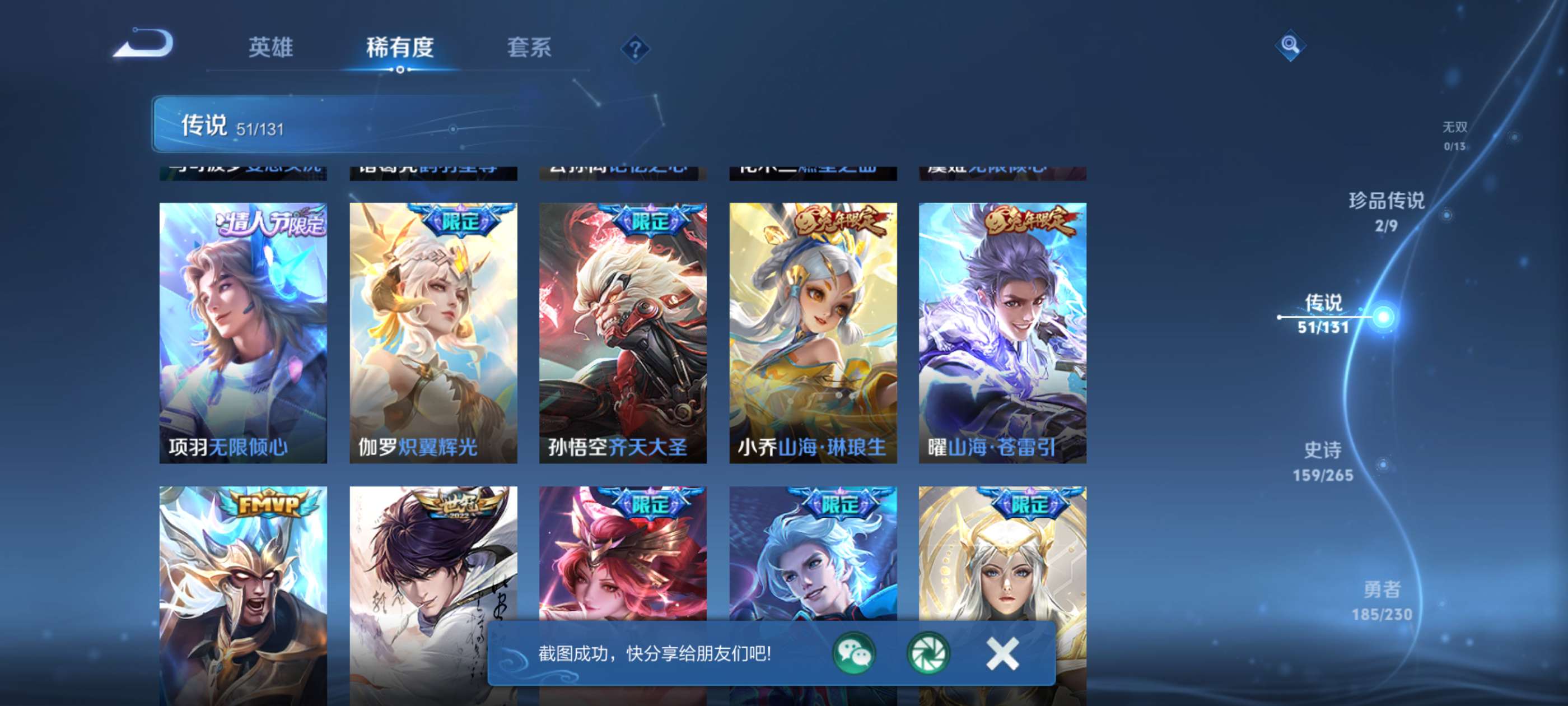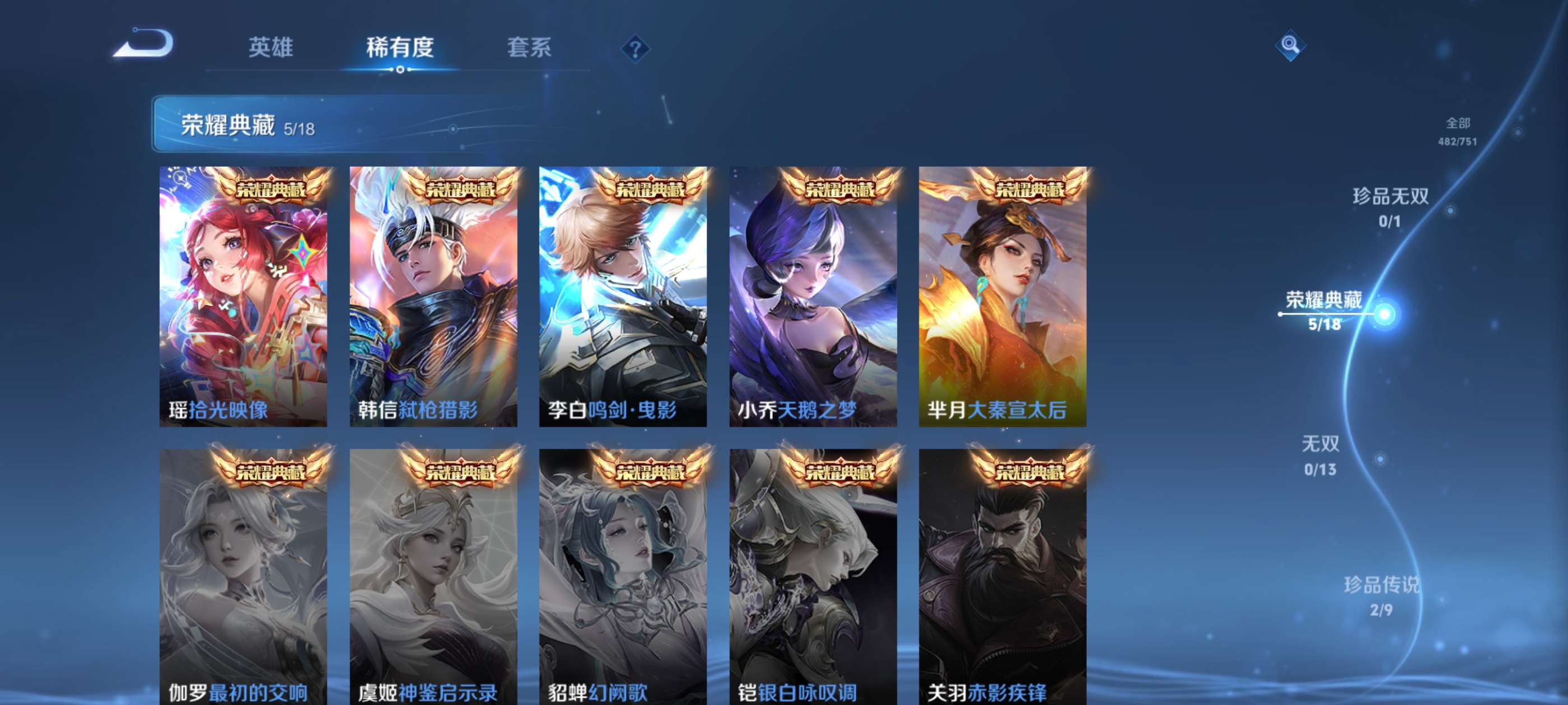 皮肤482 英雄127 非凡王者 荣耀典藏5 珍品传说2 传说51 其他皮肤189-国标贵族十退游了,便宜出
