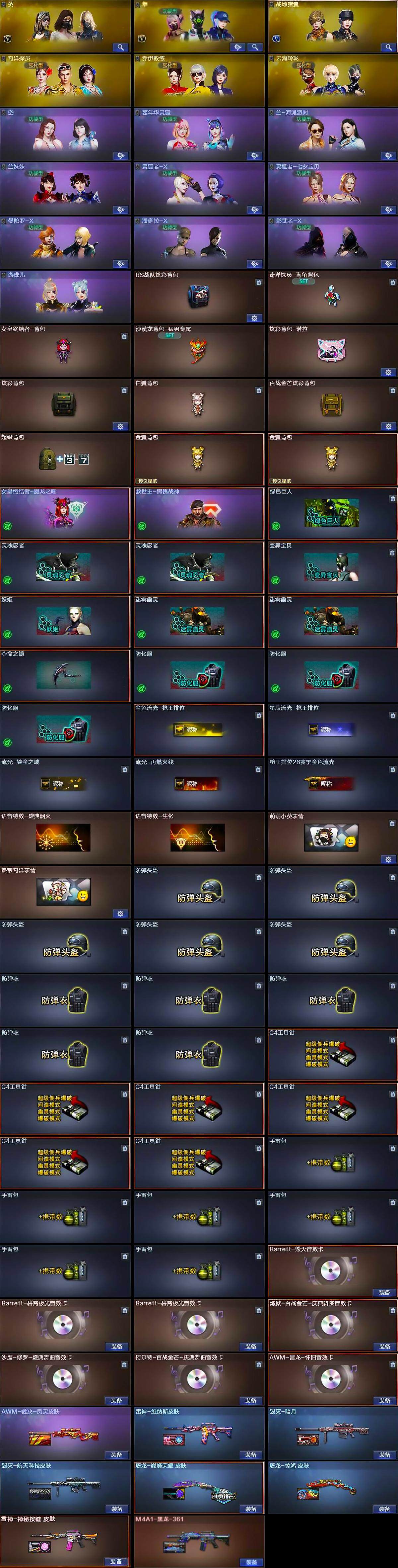 【音效卡】:Barrett-毁灭音效卡,Barrett-碧霄极光音效卡*2,炼狱-百战金芒-庆典舞曲音效卡,沙鹰-修罗-盛典舞曲音效卡,柯尔特-百战金芒-庆典舞曲音效卡,AWM-昌龙-怀旧音效卡