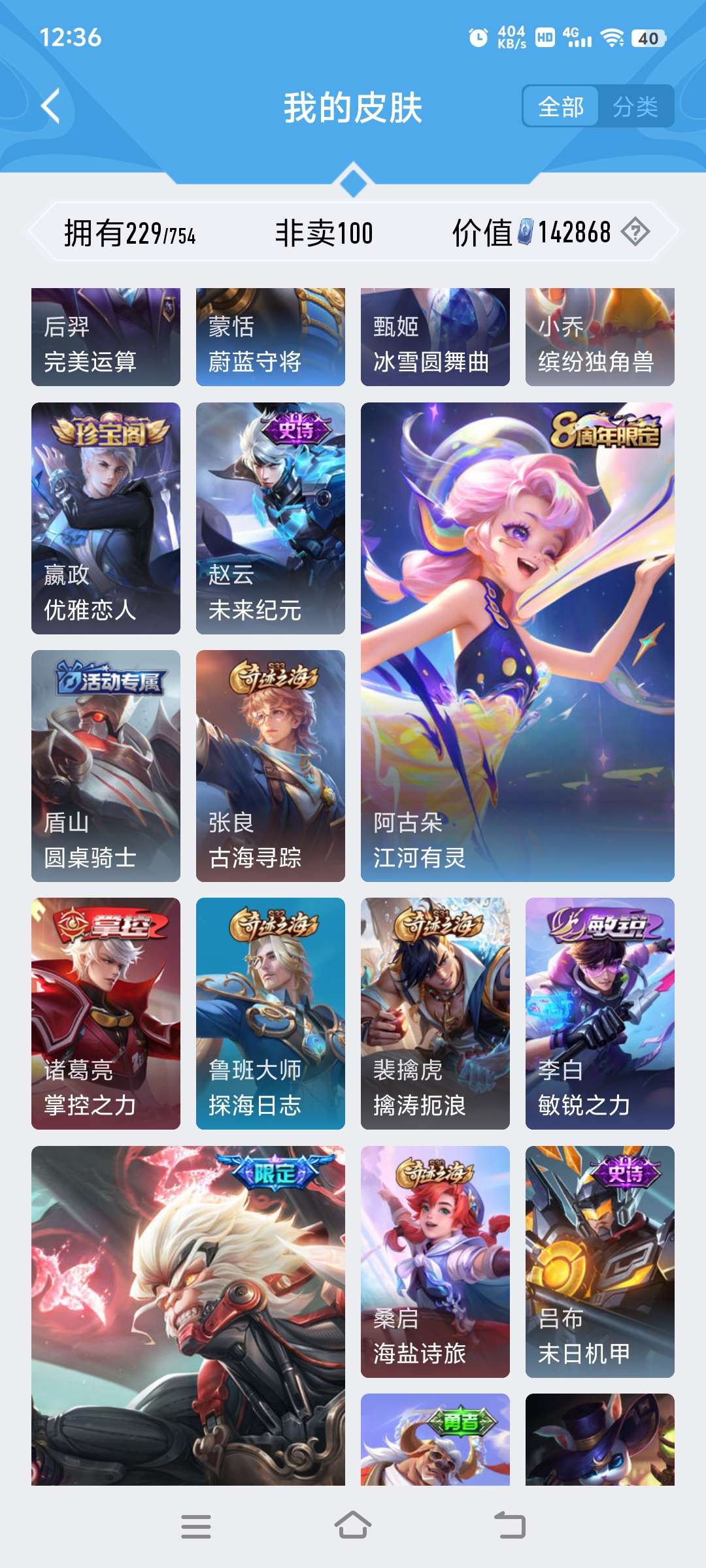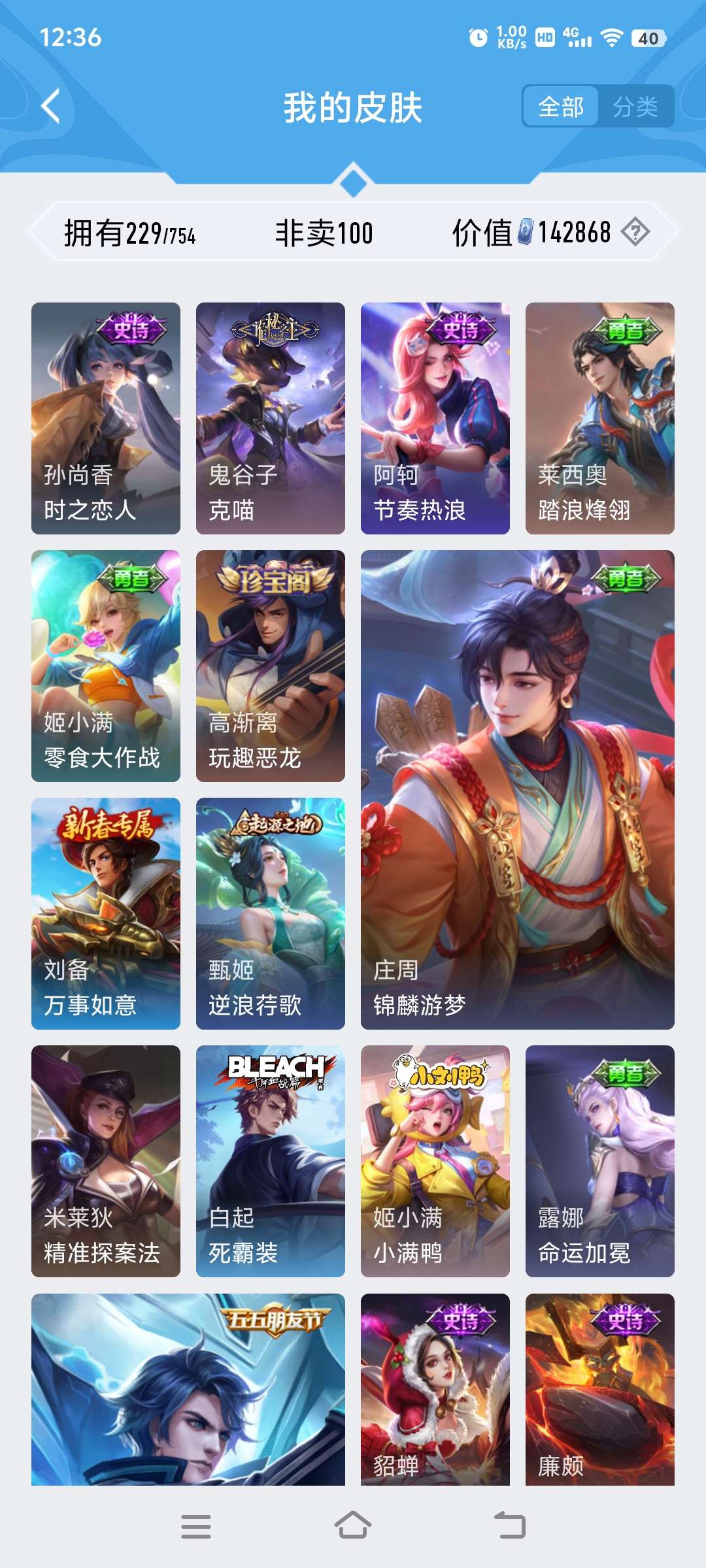 皮肤229 英雄126 非凡王者 珍品传说1 传说4 其他皮肤89-十年号,便宜出了