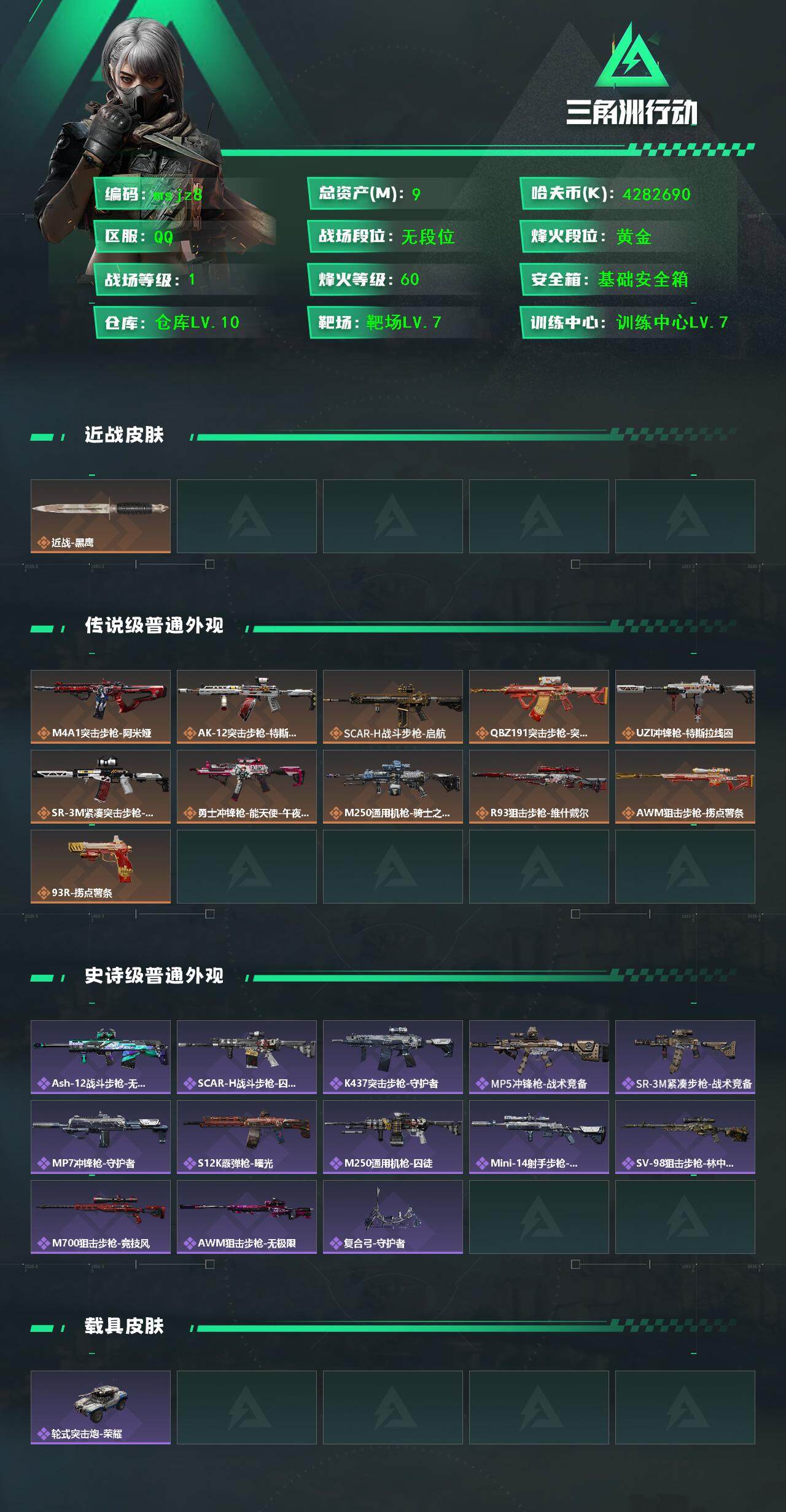 9m总资产-4282690k哈伏币-60烽火等级-黄金-1战场等级-无军衔