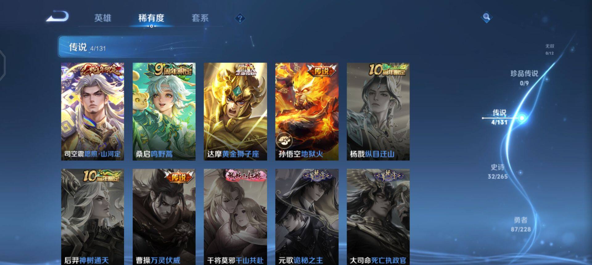 【传说皮肤】:司空震愿照山河定,桑启鸣野蒿,达摩黄金狮子座,孙悟空地狱火