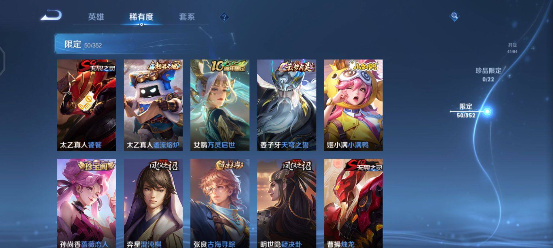 【限定皮肤】:大乔绒语心约,姜子牙天穹之誓,狄仁杰阴阳师,赵云皇家上将,孙尚香蔷薇恋人,鲁班七号狮舞东方,芈月重明,周瑜