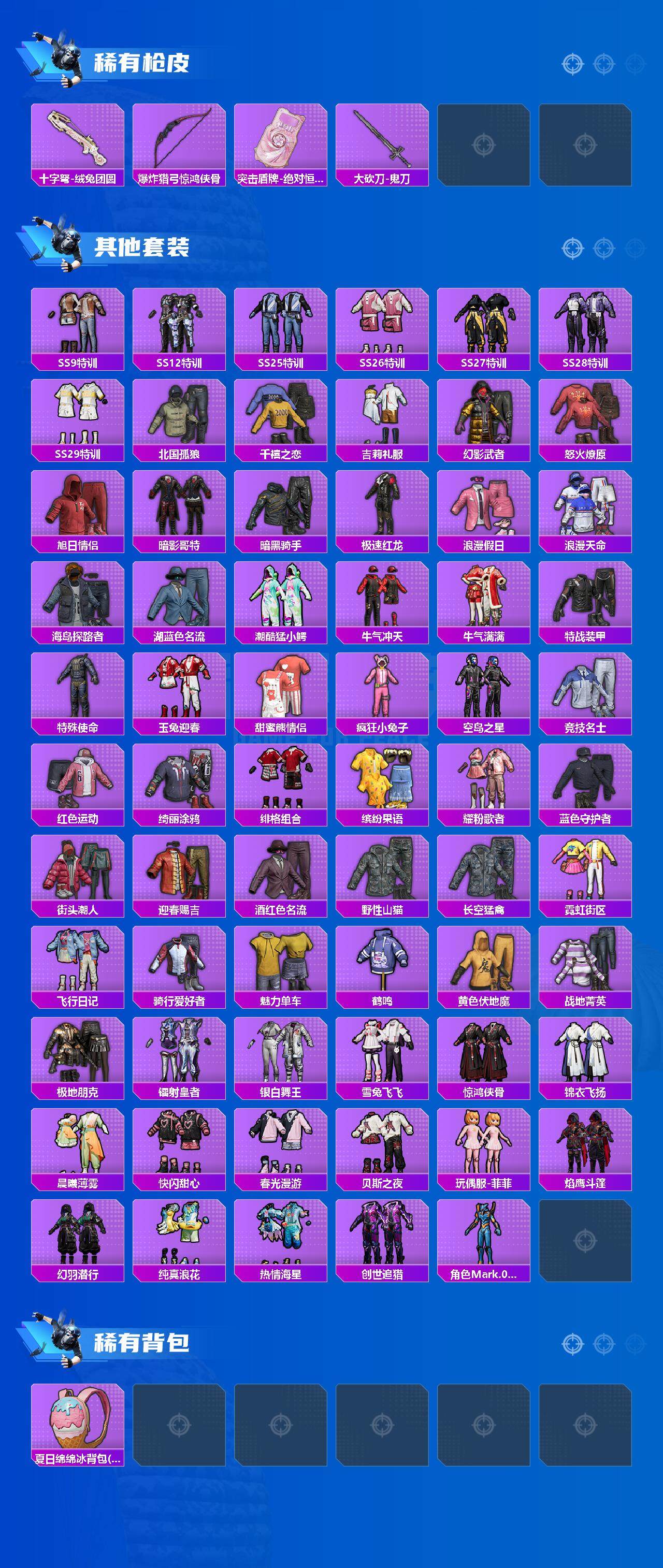 【粉色套装】:粉装-仲夏莫吉托,粉装-勇猛狮王,粉装-射星猎手,粉装-无畏白羊,角色-异瞳寒姬