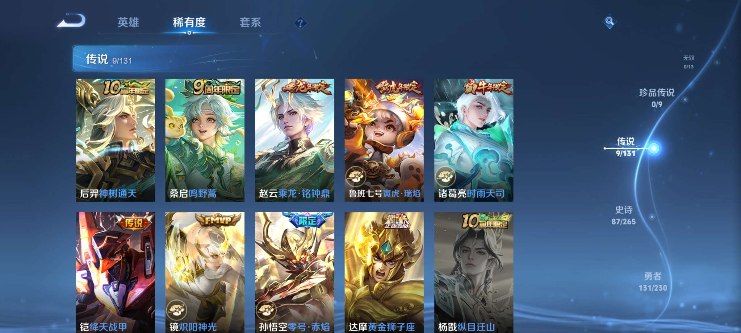 皮肤292 英雄126 荣耀王者 珍品传说1 传说9 其他皮肤121-贵7差点贵8,近300皮肤,限定皮肤多