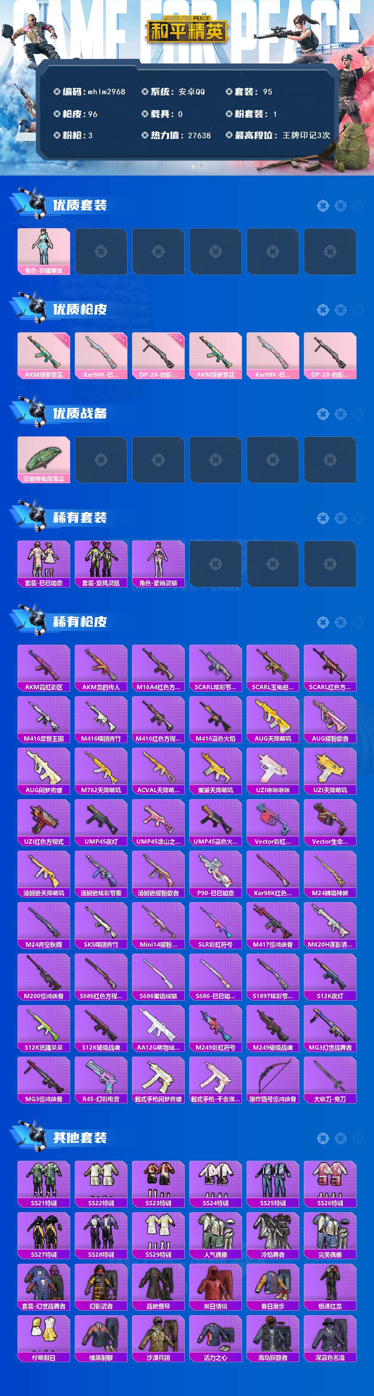 【mhlm2968】安卓 手Q-1粉装-3特效枪-0载具-1粉色飞行器-27638热力值-3王牌印记-95套装-96枪皮