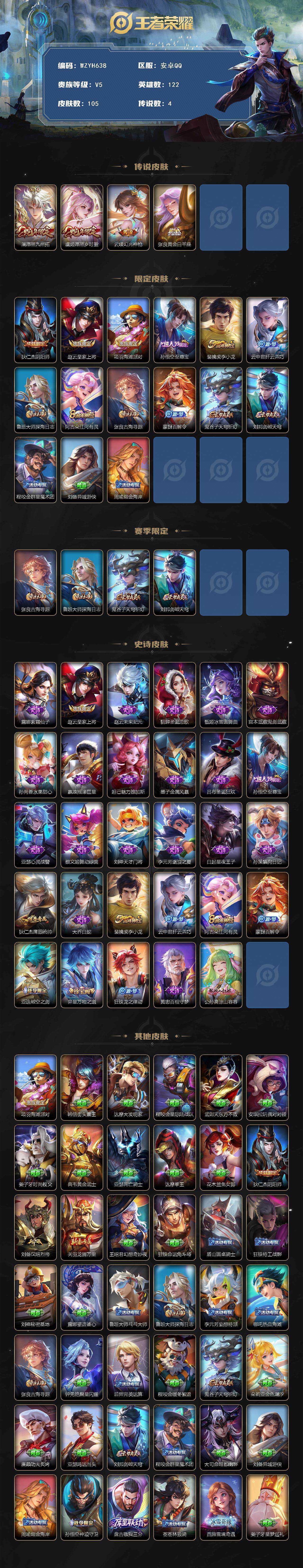 【WZYH638】贵族5/皮肤105/传说4/史诗29/英雄122/澜-愿照·九州拓/虞姬-愿照·岁时盈/云缨-幻光神枪/张良-黄金白羊座/狄仁杰-阴阳师/赵云-皇家上将/项羽-海滩派对/孙悟空-至尊宝/裴擒虎-李小龙/云中君-纤云弄巧/鲁班大师-探海日志/阿古朵-江河有灵/张良-古海寻踪/蒙犽-百解令/鬼谷子-天穹祈灯/刘邦-剑破天穹/程咬金-群星魔术团/刘备-异域游侠/周瑜-熔金海岸/露娜-紫霞仙子/赵云-未来纪元/貂蝉-圣诞恋歌/甄姬-冰雪圆舞曲/宫本武藏-鬼剑武藏/孙尚香-水果甜心/嬴政
