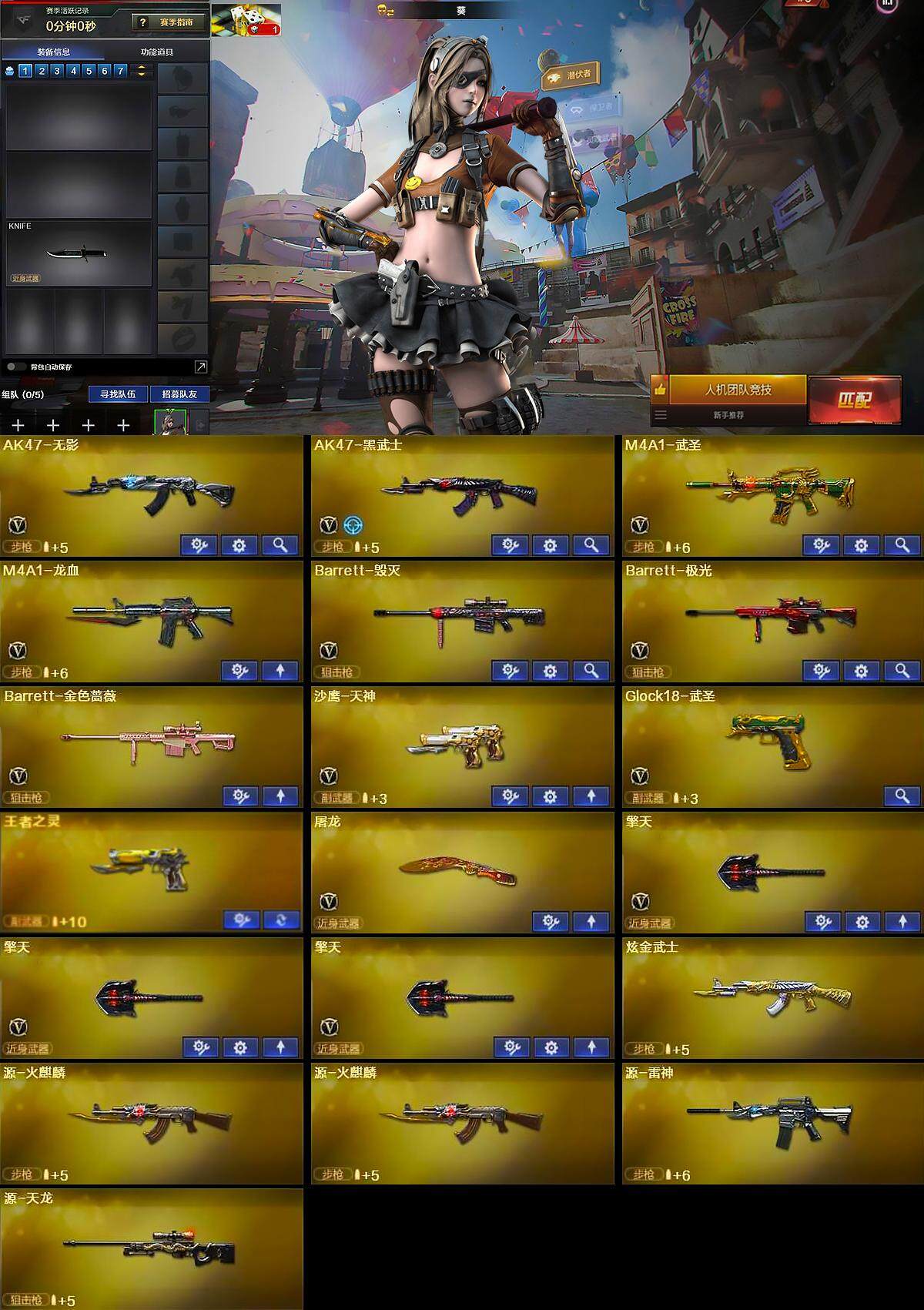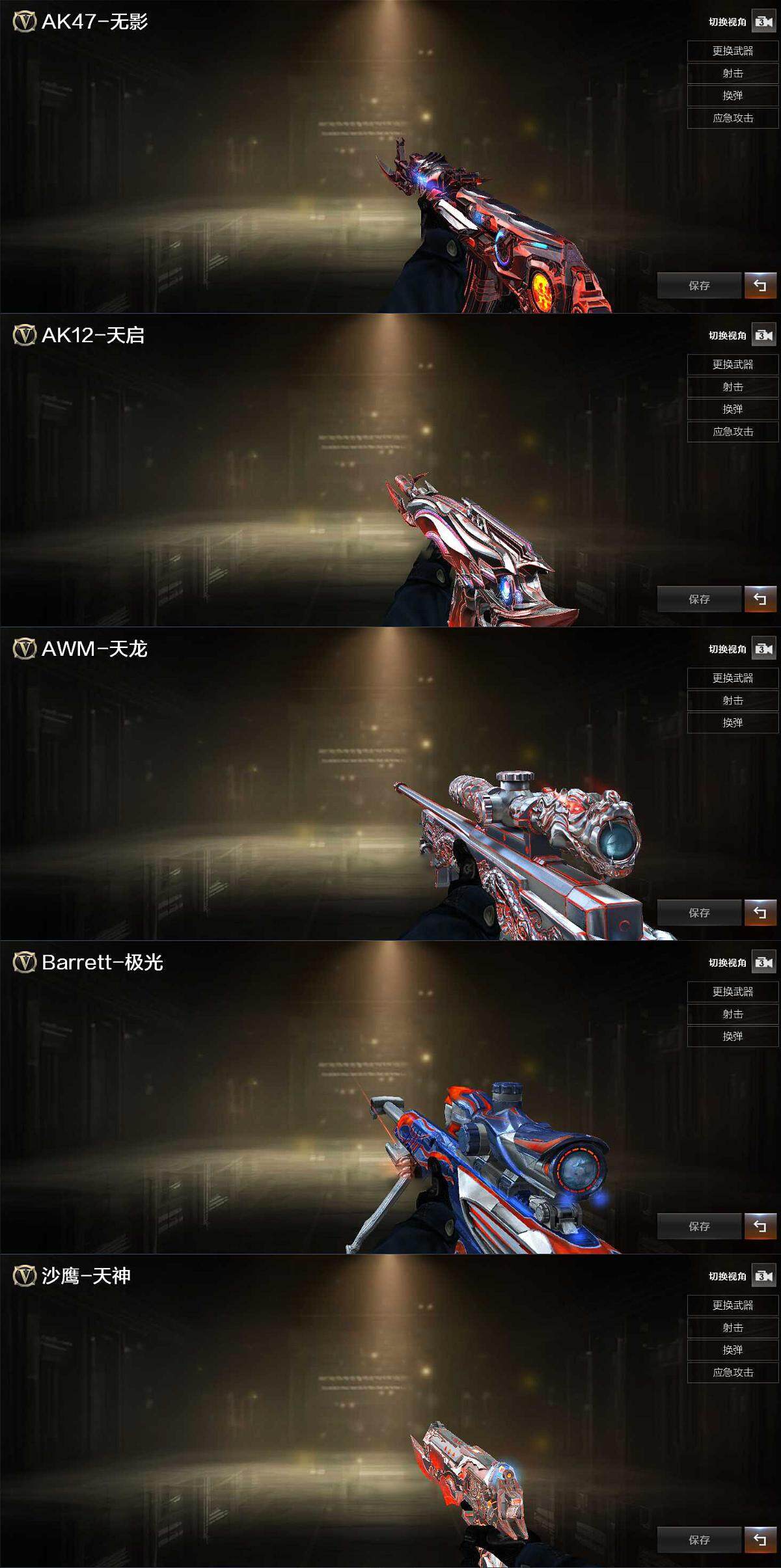 【英雄级武器】:AK47-无影,AK47-黑武士,M4A1-武圣,M4A1-龙血,Barrett-毁灭,Barrett-极光,Barrett-金色蔷薇,沙鹰-天神,Glock18-武圣,屠龙,擎天*3