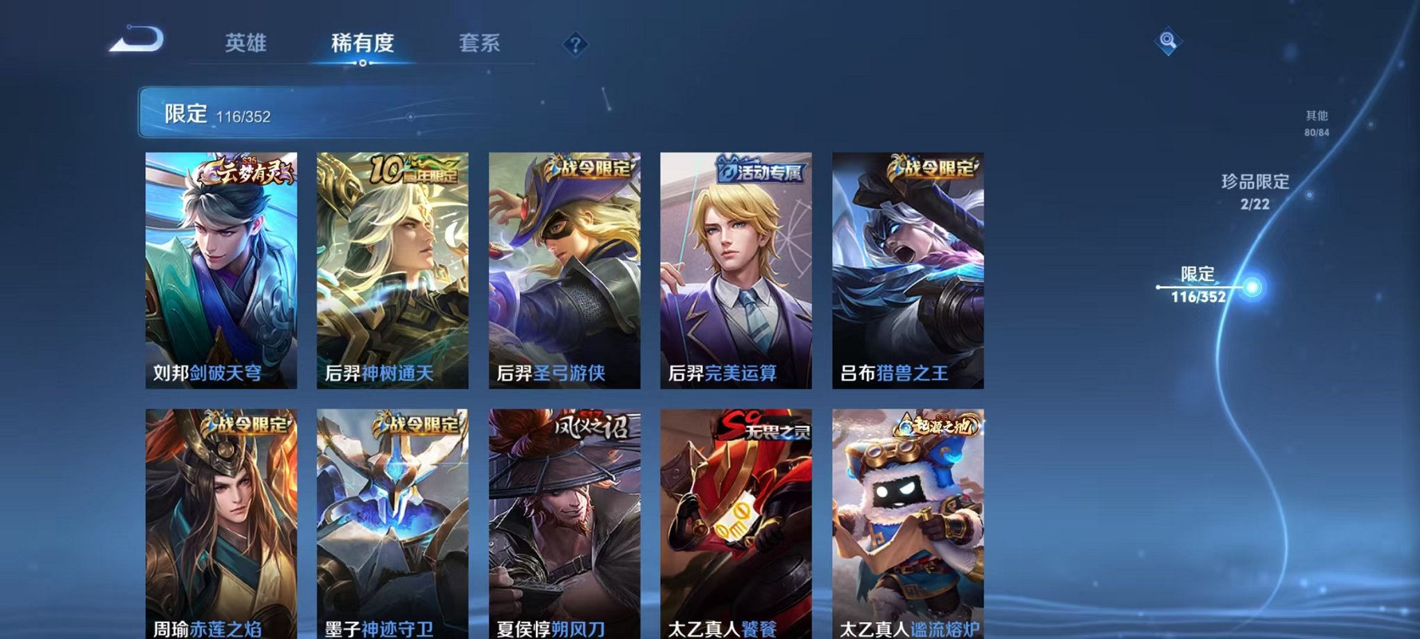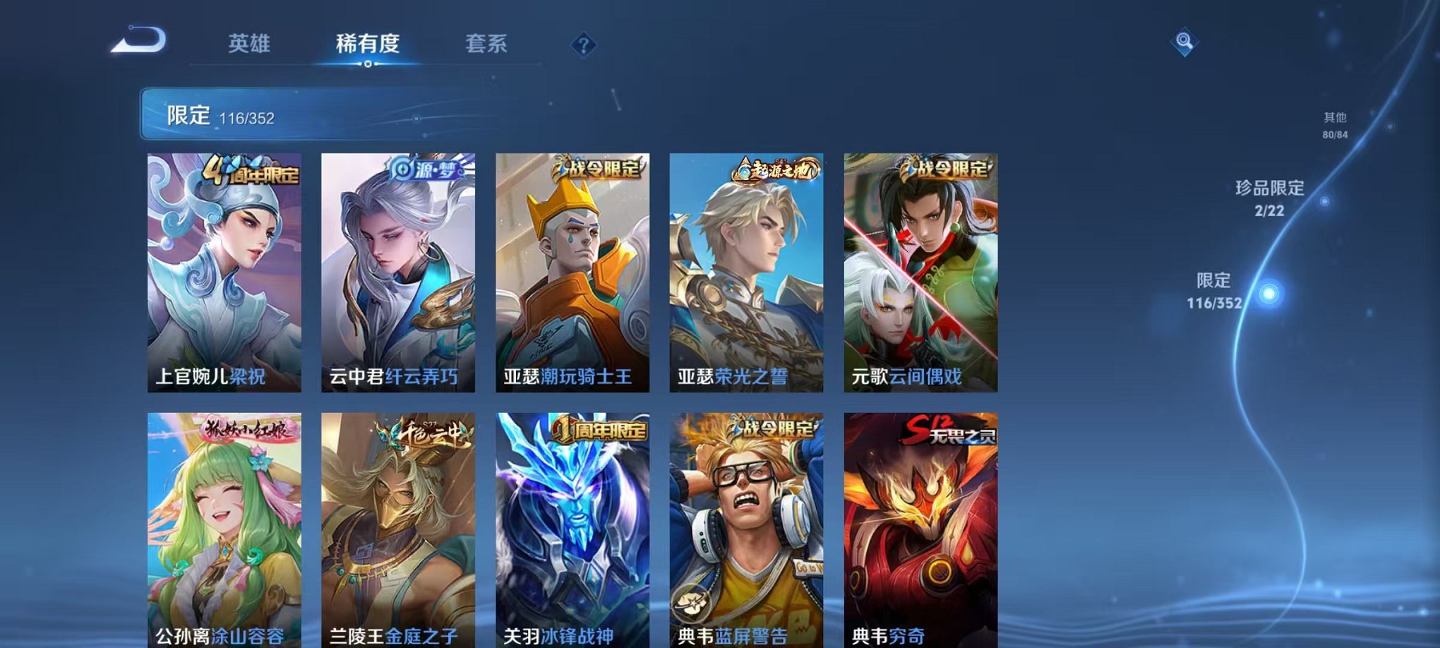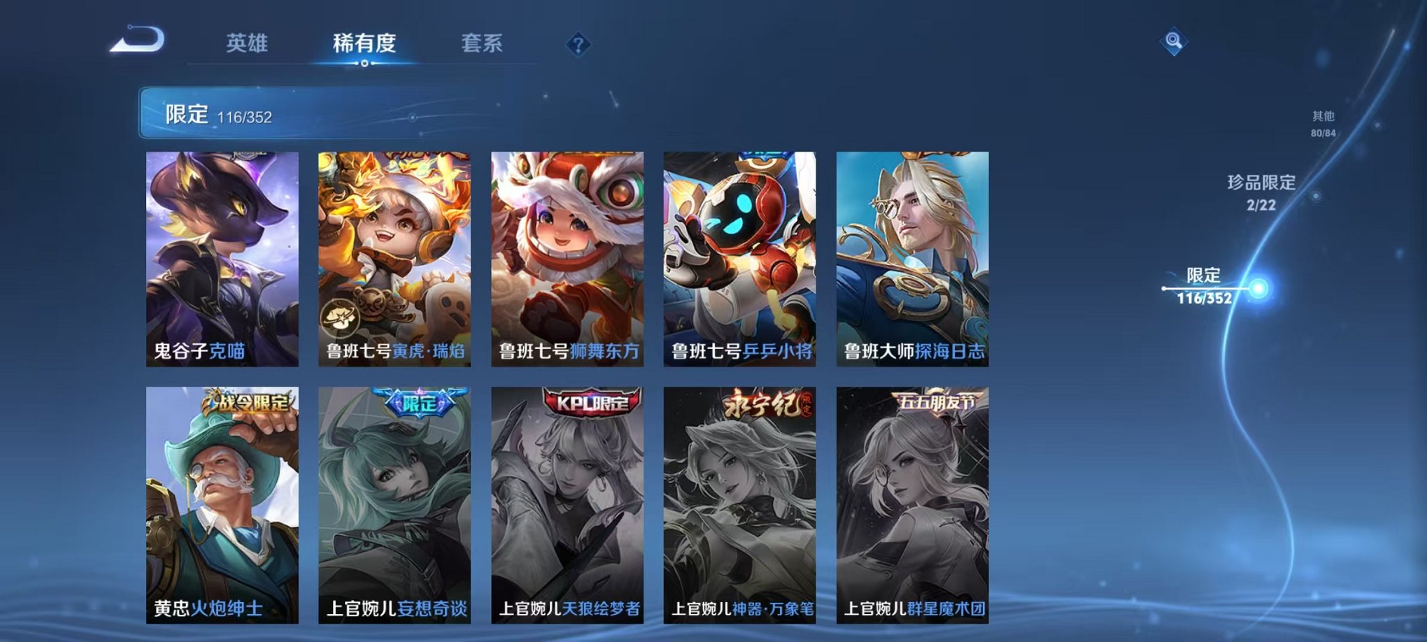 皮肤346 英雄127 非凡王者 荣耀典藏1 珍品传说1 传说10 其他皮肤142-
