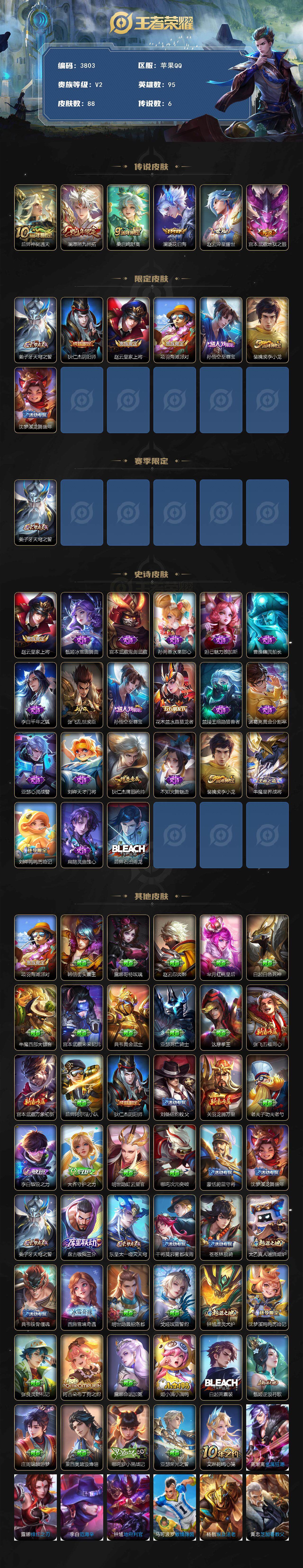 营地账号:/苹果Q-V2-最强王者段位-95英雄-88皮肤-6传说-21史诗