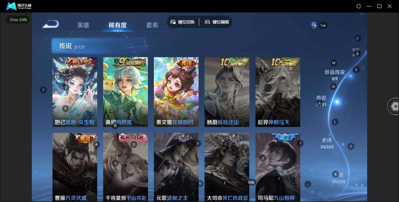 实名: 可修改 贵族等级: V5 英雄数: 103 皮肤数: 93 传说皮: