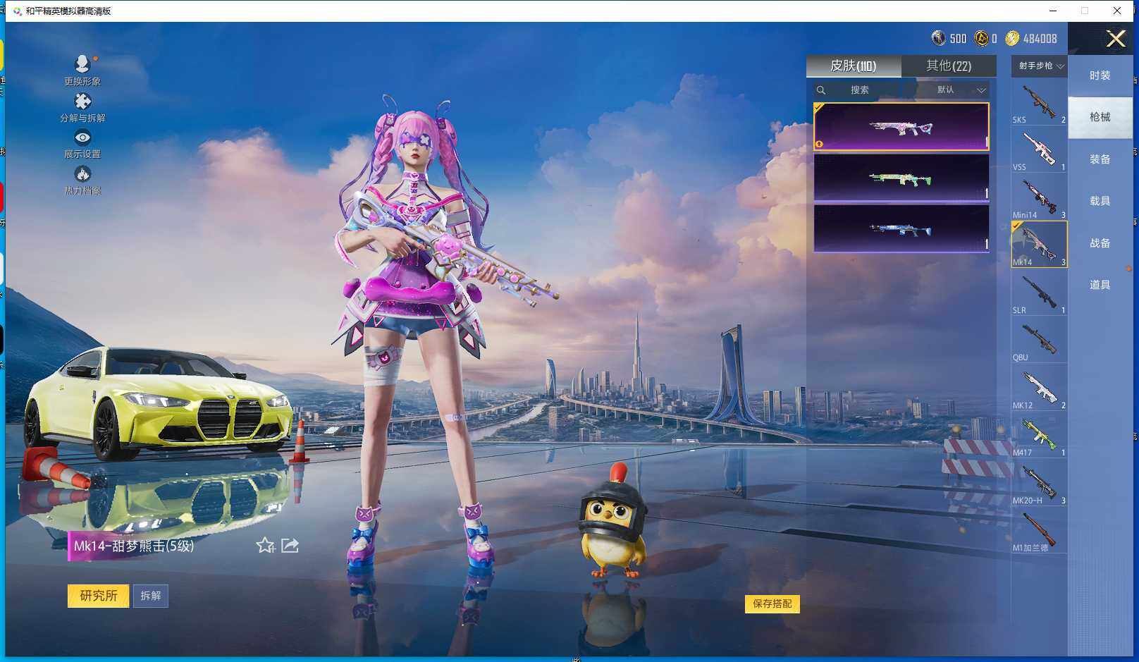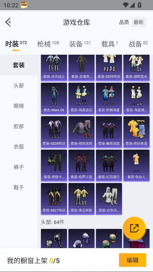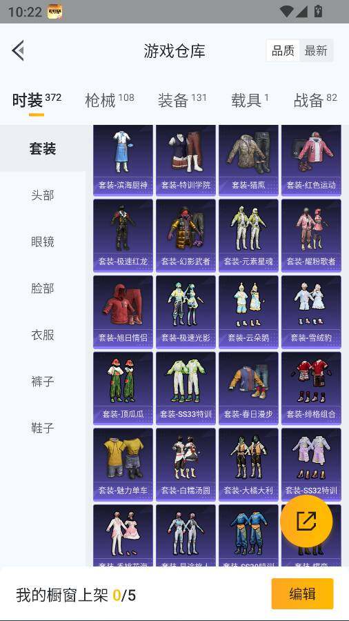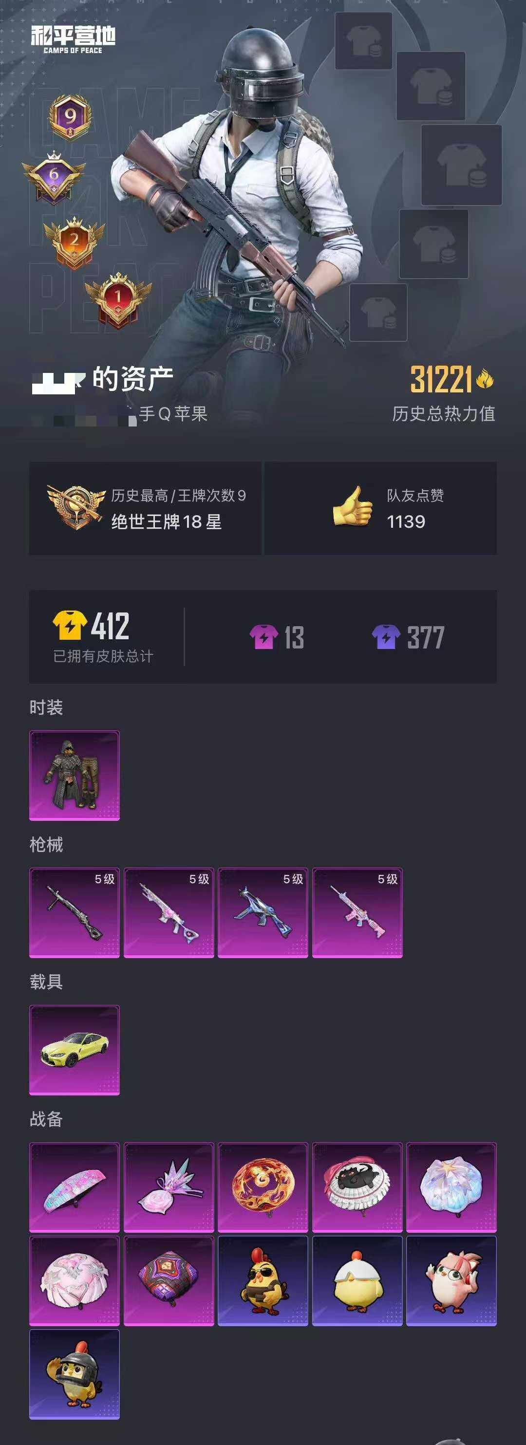 时装数: 91 载具数: 1 枪械数: 108 战备数: 82 热门装扮: 极限特训,呆萌铁蟹,迅捷狂鲨 载具: 宝马M4(圣保罗黄) 稀有枪皮: M416-电玩时刻(五级),UMP45-量子极限(五级),Mk14-甜梦熊击(五级),DP-28-豹影疾电(五级)