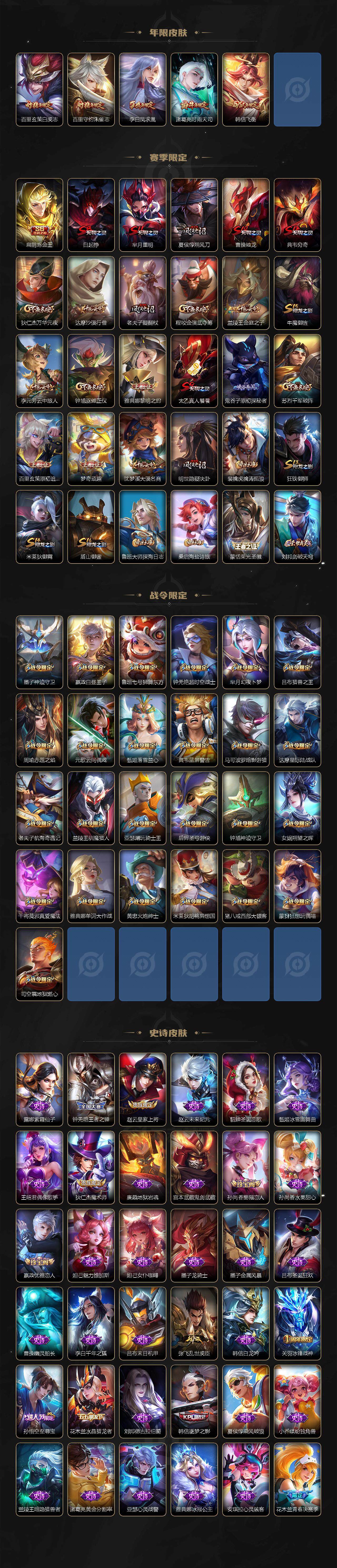 【传说皮肤】:后羿神树通天,夏侯惇霜北刀,吕布怒海麟威,赵云淬星耀世,诸葛亮时雨天司,李信一念神魔,干将莫邪久胜战神,达摩黄金狮子座,百里玄策白虎志,李白凤求凰,宫本武藏地狱之眼