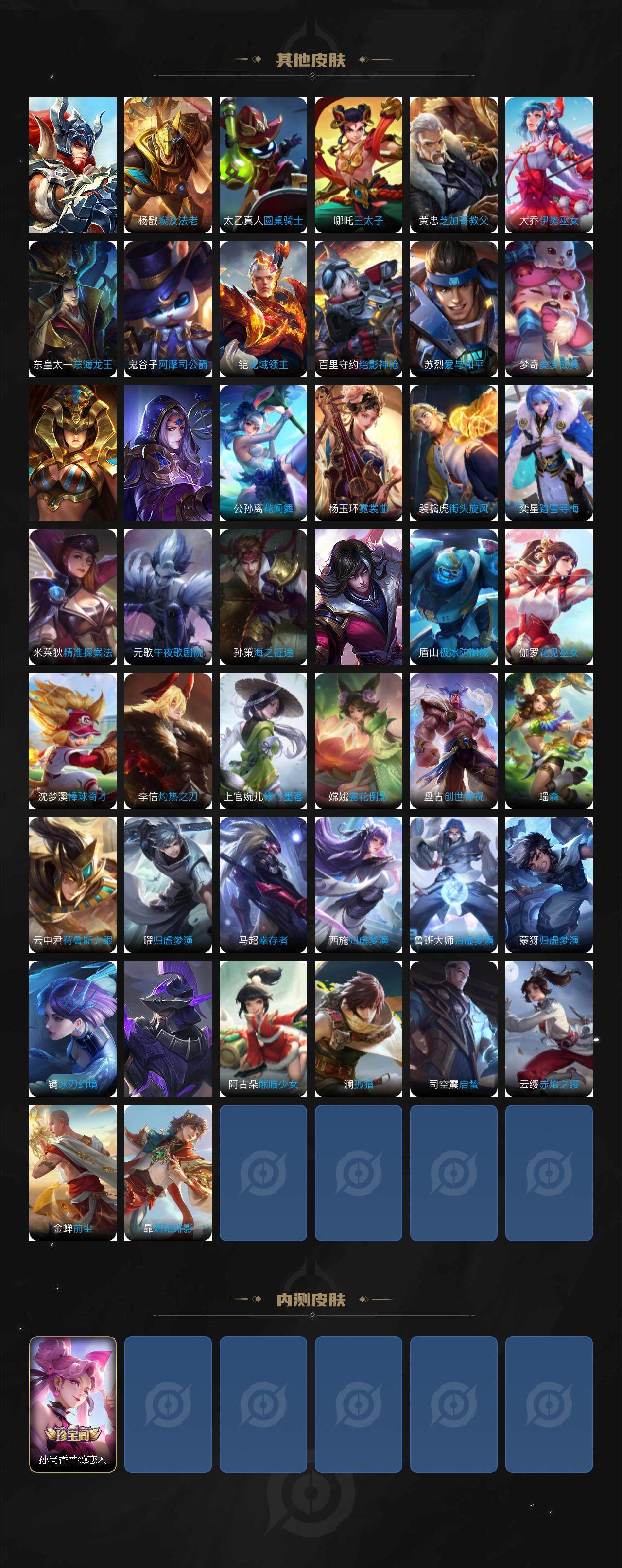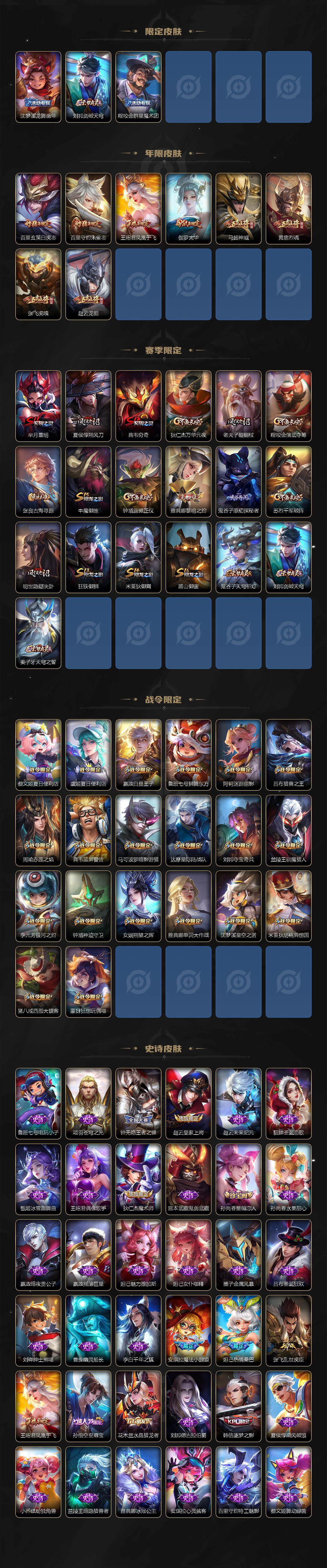 【传说皮肤】:澜愿照九州拓,云缨幻光神枪,桑启鸣野蒿,典韦战鼓燎原,露娜霜月吟,西施游龙清影,镜炽阳神光,虞姬启明星使,李信一念神魔,伽罗太华,貂蝉猫影幻舞,虞姬云霓雀