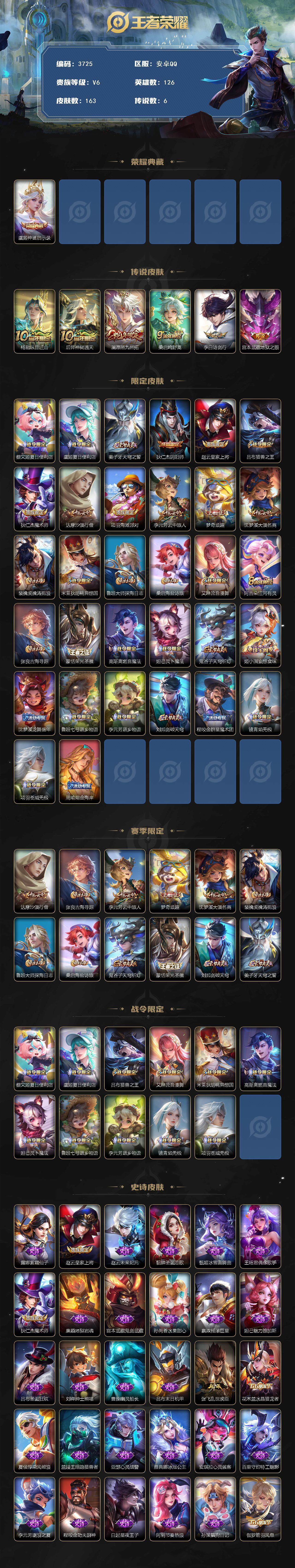 安卓Q-V6-最强王者段位-126英雄-163皮肤-1典藏皮肤-6传说-55史