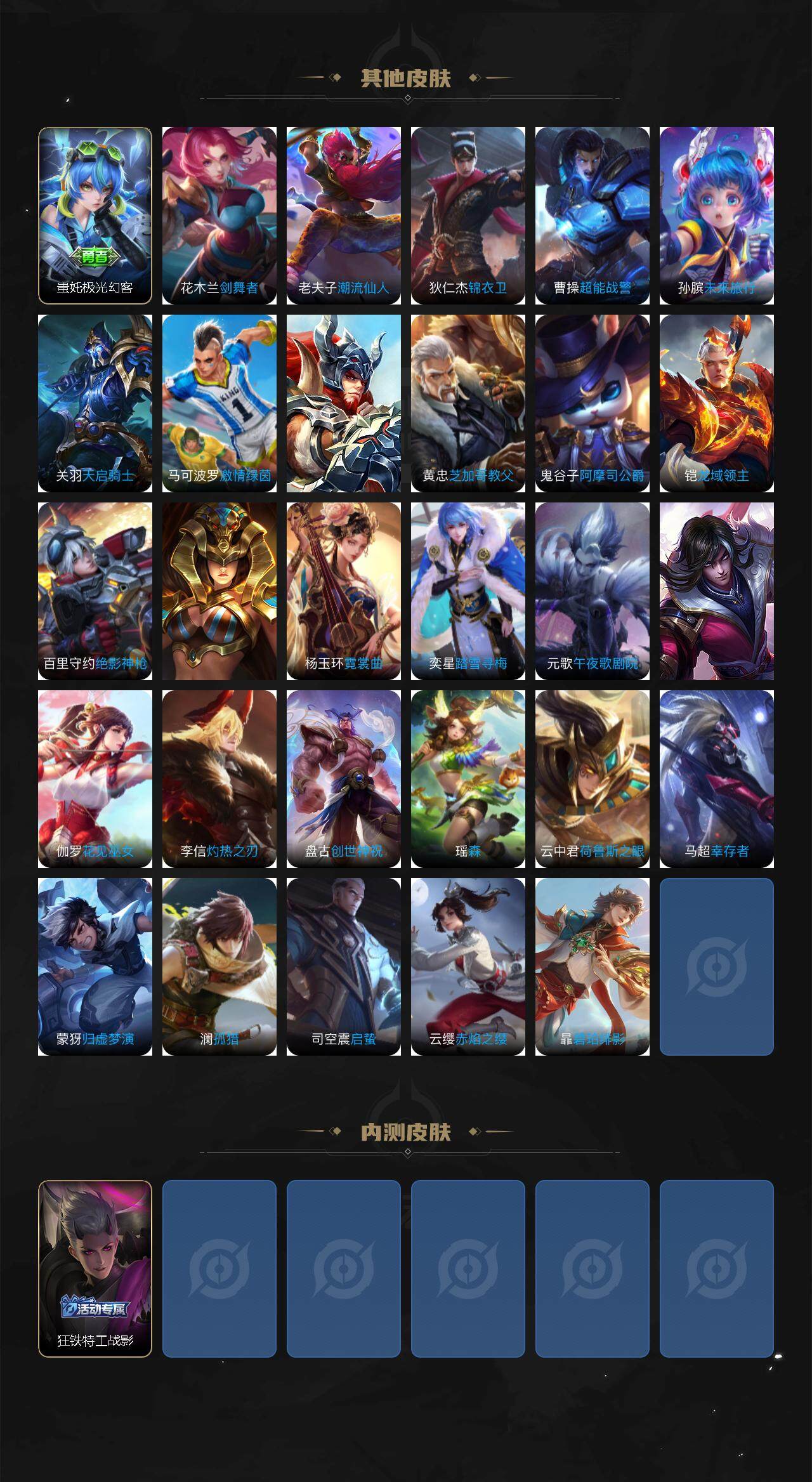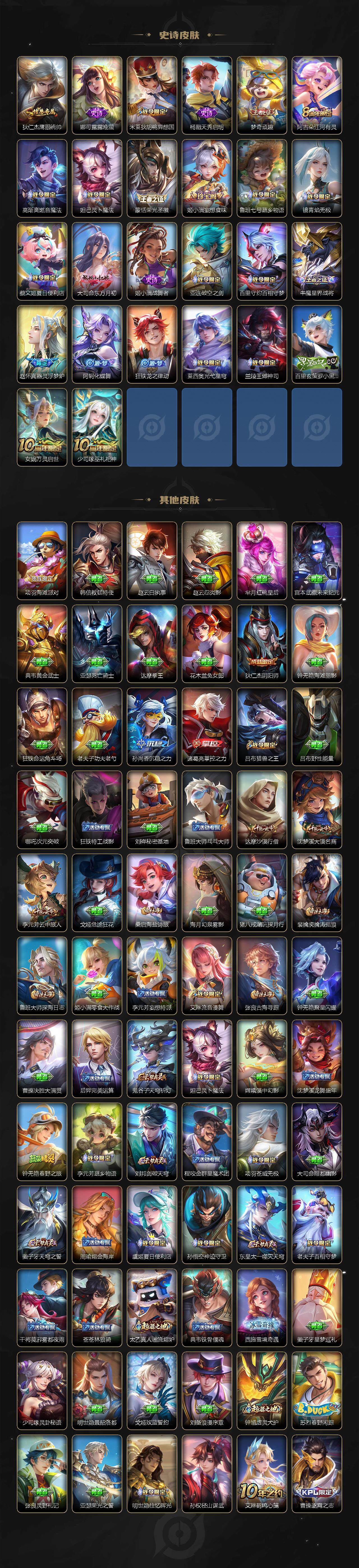 【限定皮肤】:蔡文姬夏日便利店,虞姬夏日便利店,姜子牙天穹之誓,狄仁杰阴阳师,赵云皇家上将,吕布猎兽之王,狄仁杰魔术师,达摩沙漠行僧