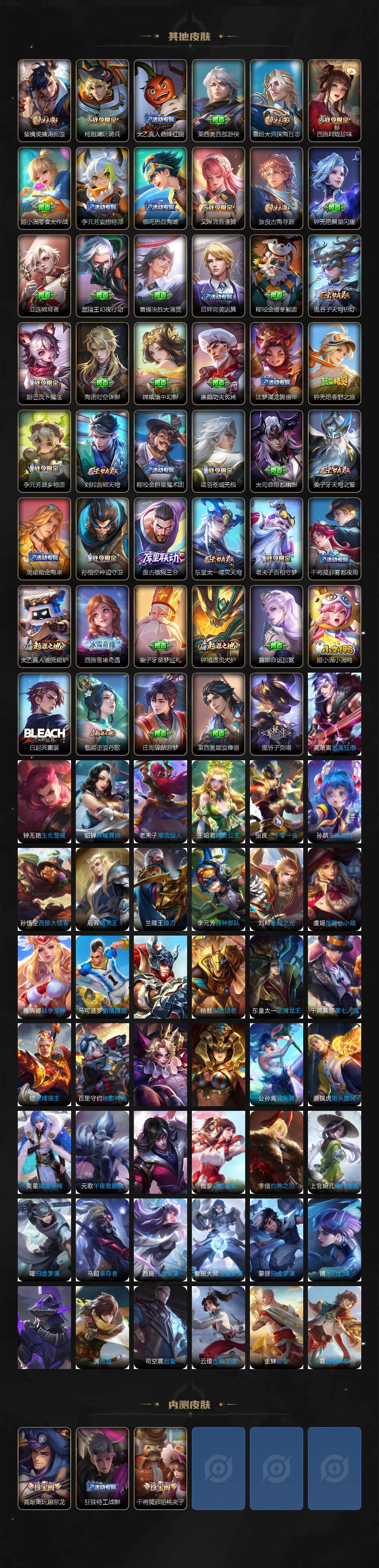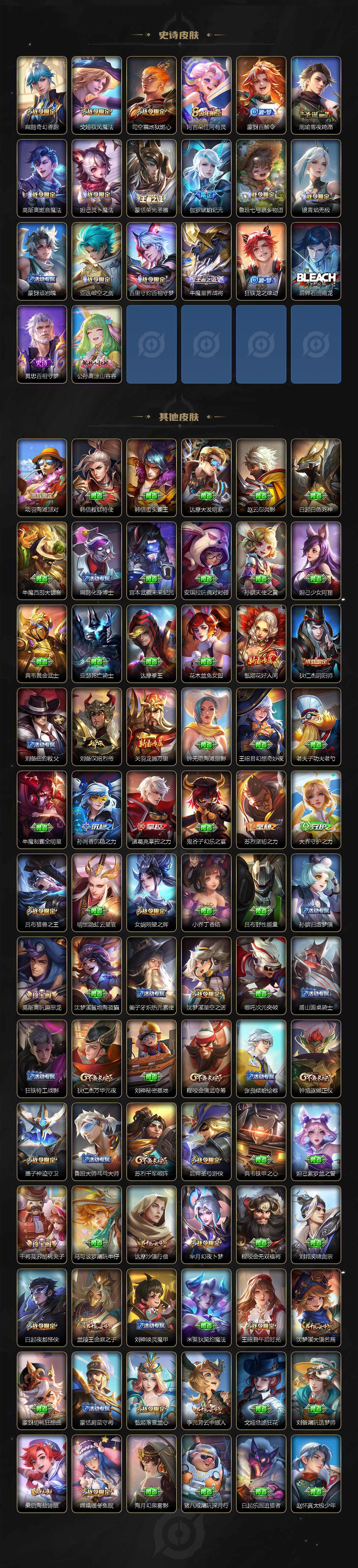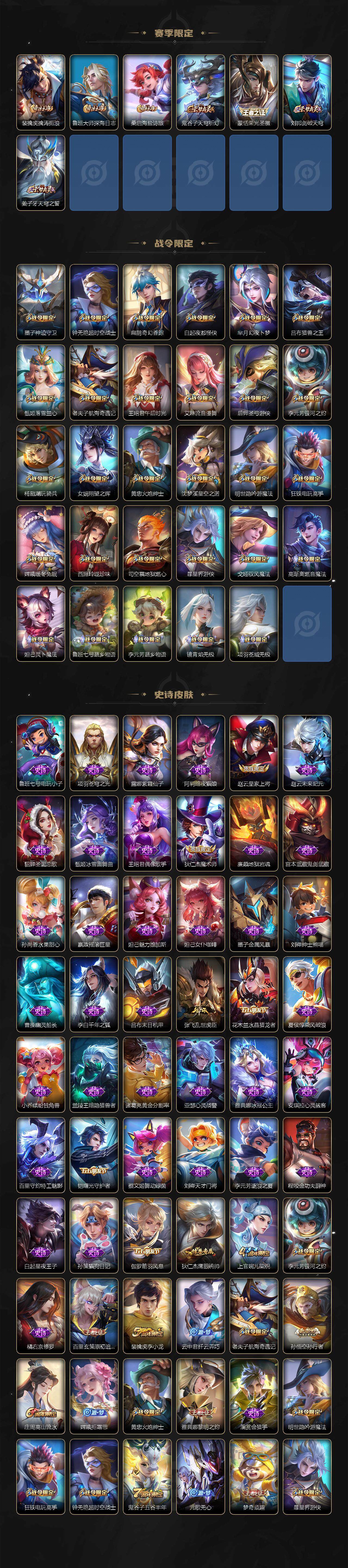 【限定皮肤】:蒙犽顽岩魄,姜子牙天穹之誓,狄仁杰阴阳师,赵云皇家上将,墨子神迹守卫,鲁班七号寅虎瑞焰,庄周高山流水,高渐离玩趣恶龙,钟无艳超时空战士,扁鹊奇幻香踪,