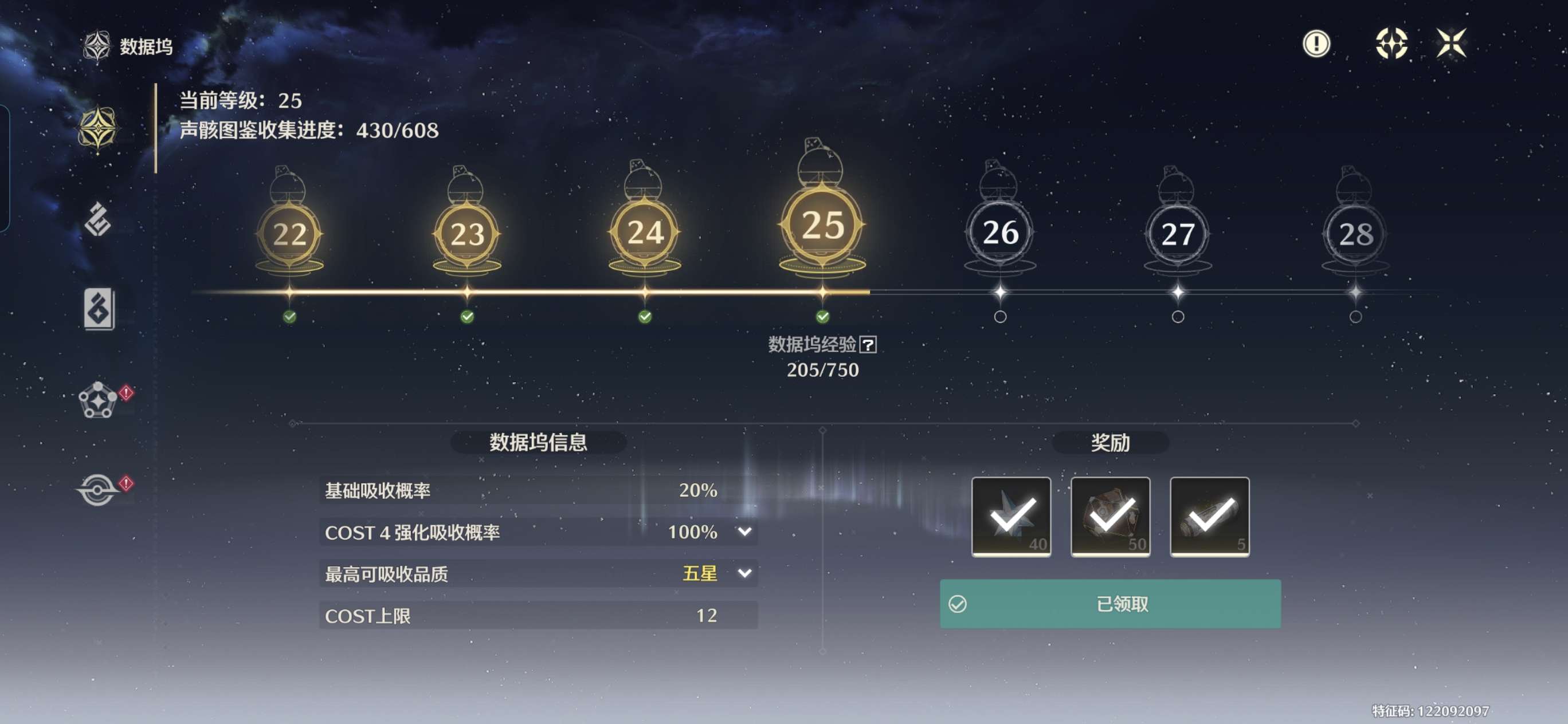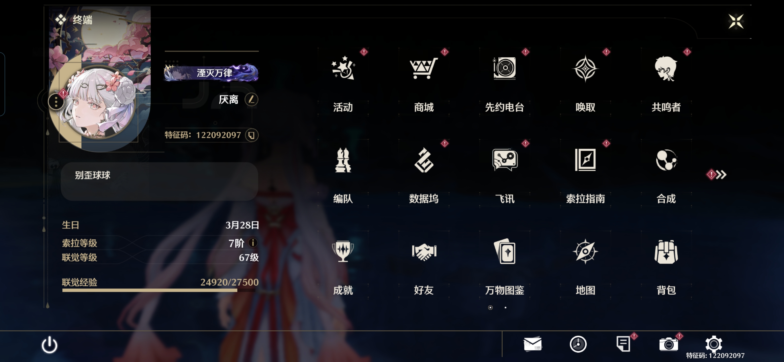 【等级:67 黄数:22 五星角色:9个 1命卡提希娅,0命卡卡罗,1命坎特蕾拉,1命今汐 命椿