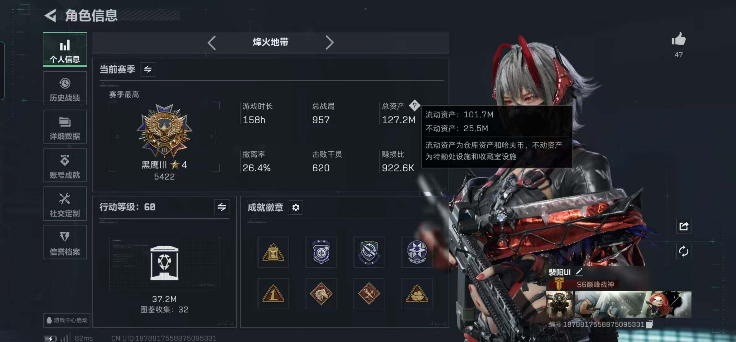 127m总资产-7040k哈伏币-60烽火等级-黑鹰-14战场等级-列兵