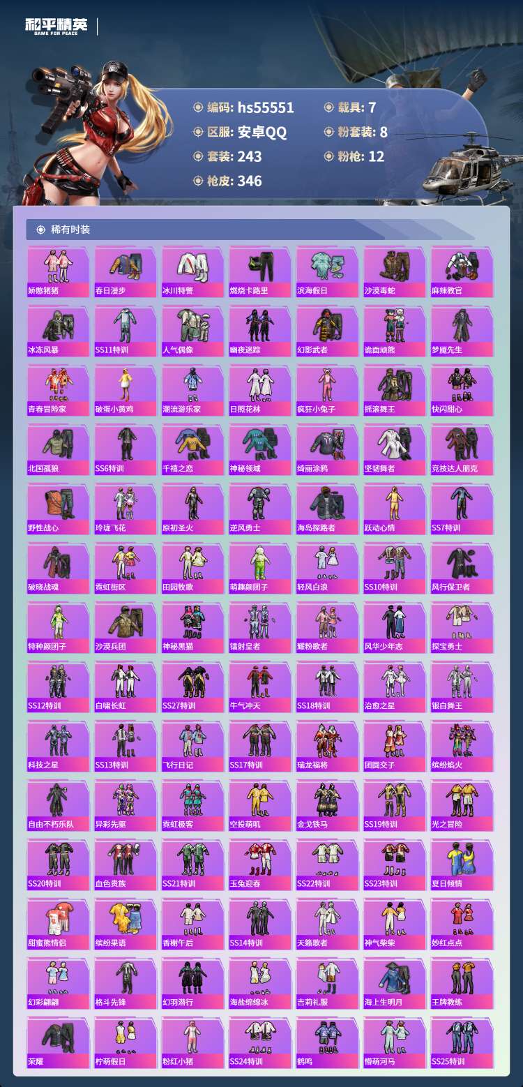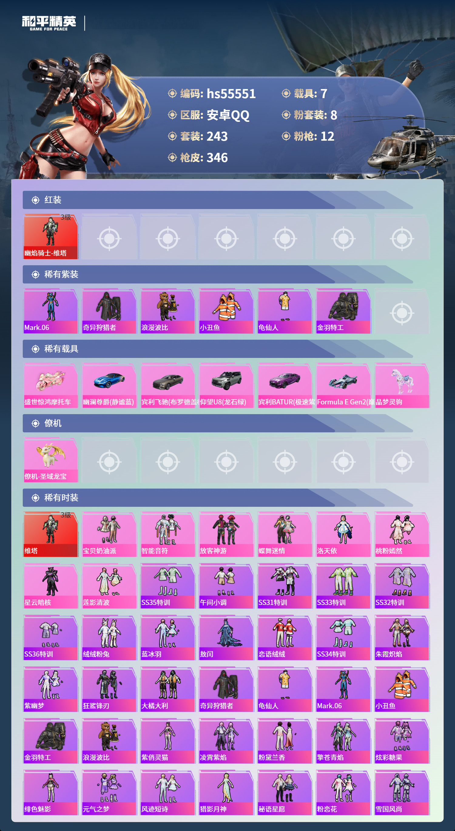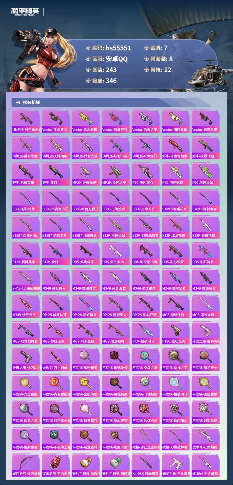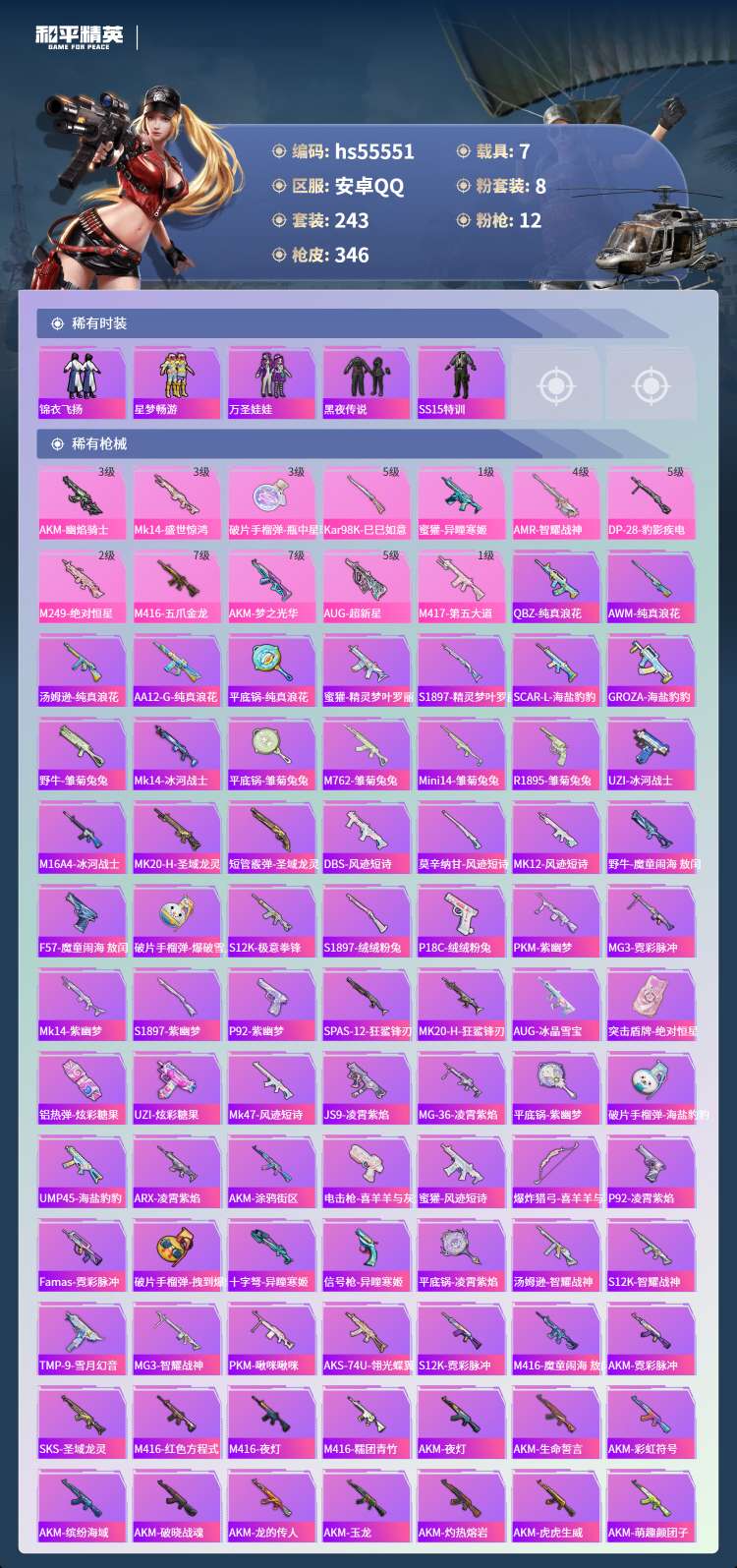 hs55551 安卓手Q-19王牌印记-1红装-8粉装-12特效枪-7载具-117671热力值-24