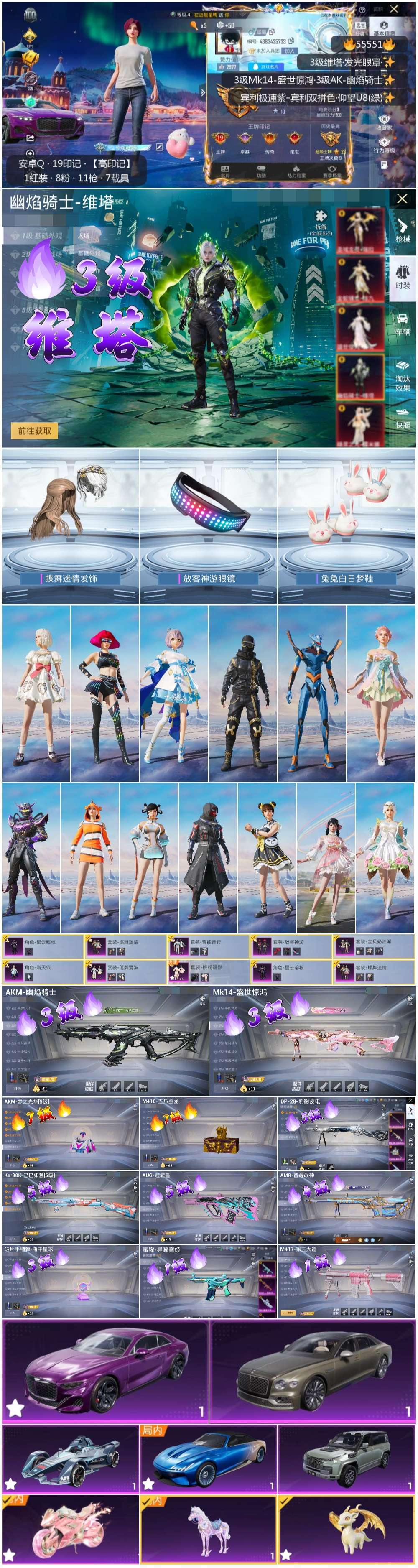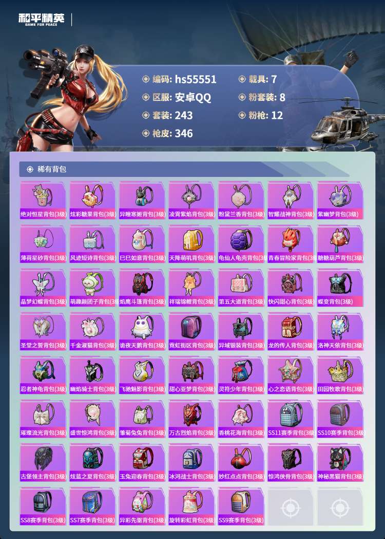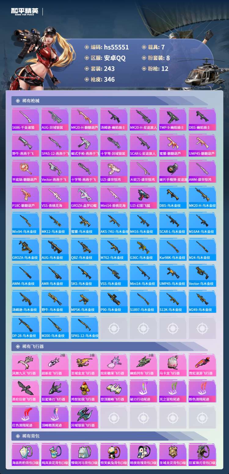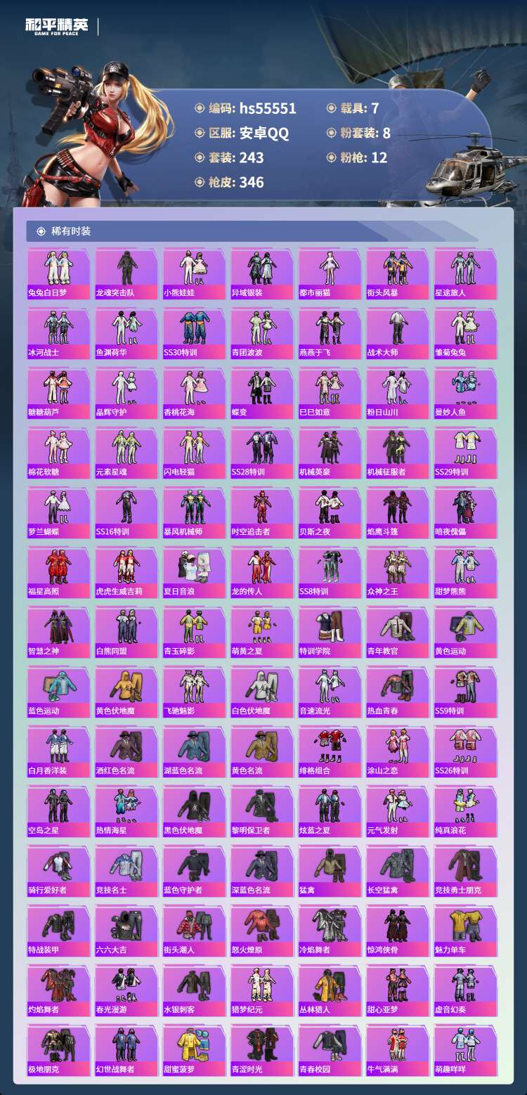 hs55551 安卓手Q-19王牌印记-1红装-8粉装-12特效枪-7载具-117671热力值-24