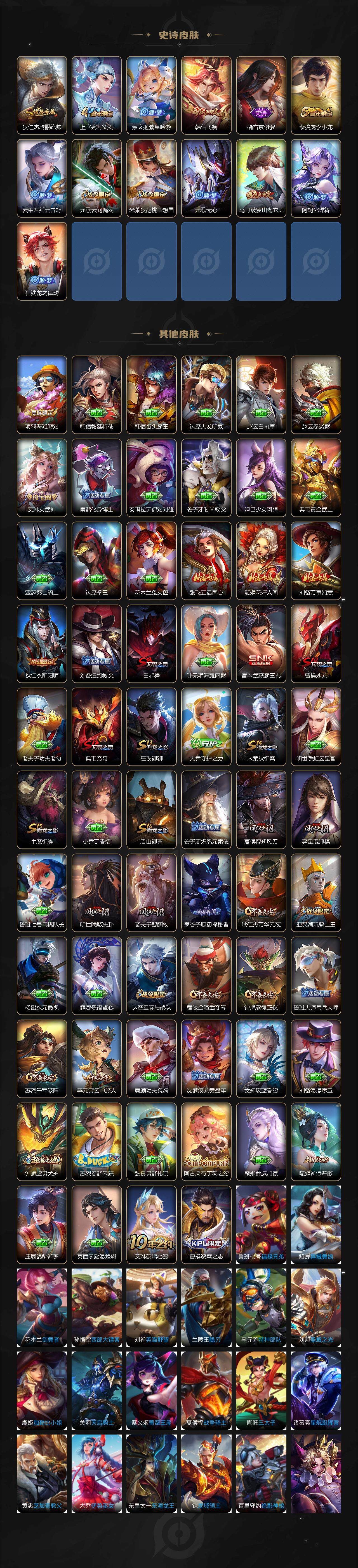 【限定皮肤】:白起狰,狄仁杰阴阳师,赵云皇家上将,元歌云间偶戏,元歌无心,夏侯惇朔风刀,曹操烛龙,典韦穷奇,马可波罗山海玄木吟,狄仁杰魔术师,