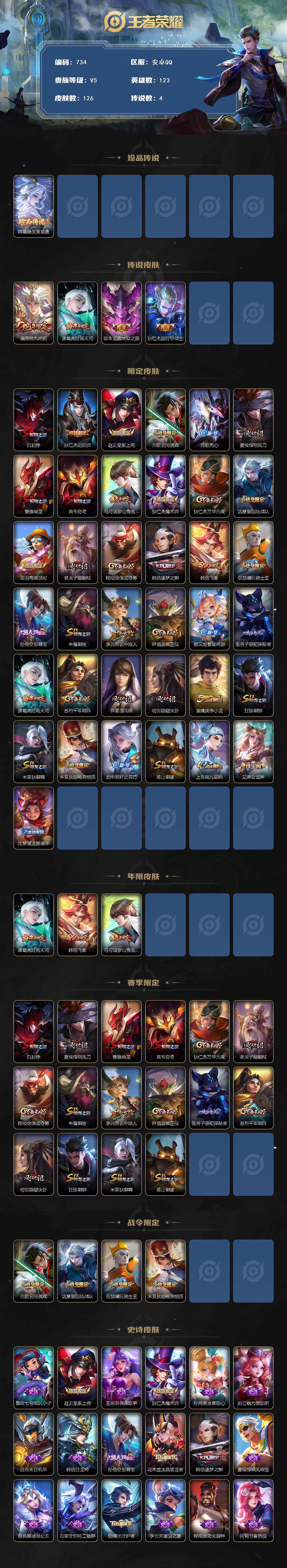 1895287 王者荣耀账号 安卓Q-V5-永恒钻石IV段位-123英雄-126皮肤-1珍品传说-4传说-31史诗