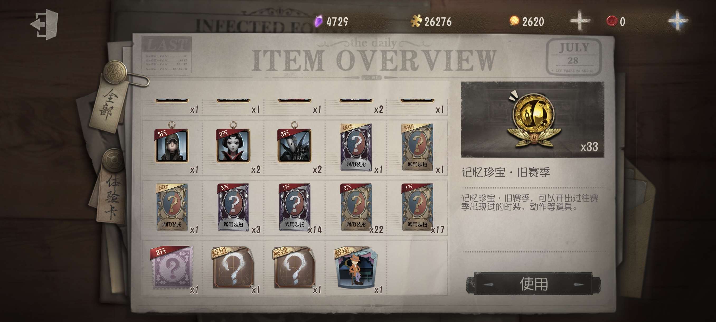 4700紫薯,89骰子,3角色解锁卡,1紫皮解锁卡,33旧珍宝