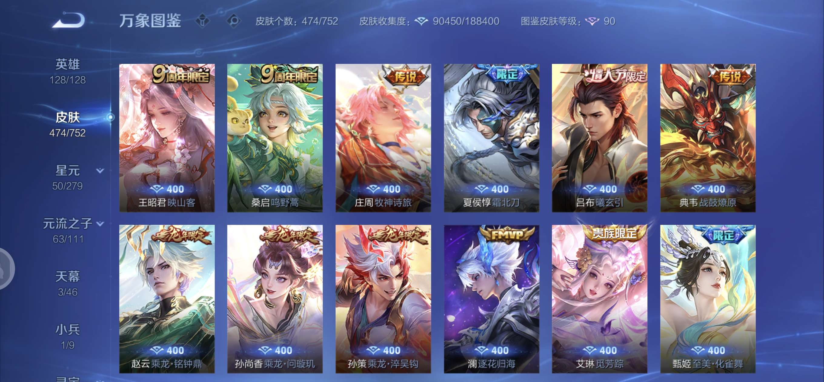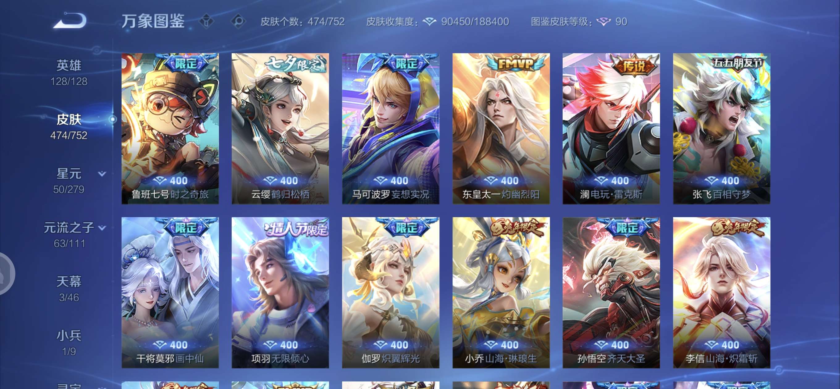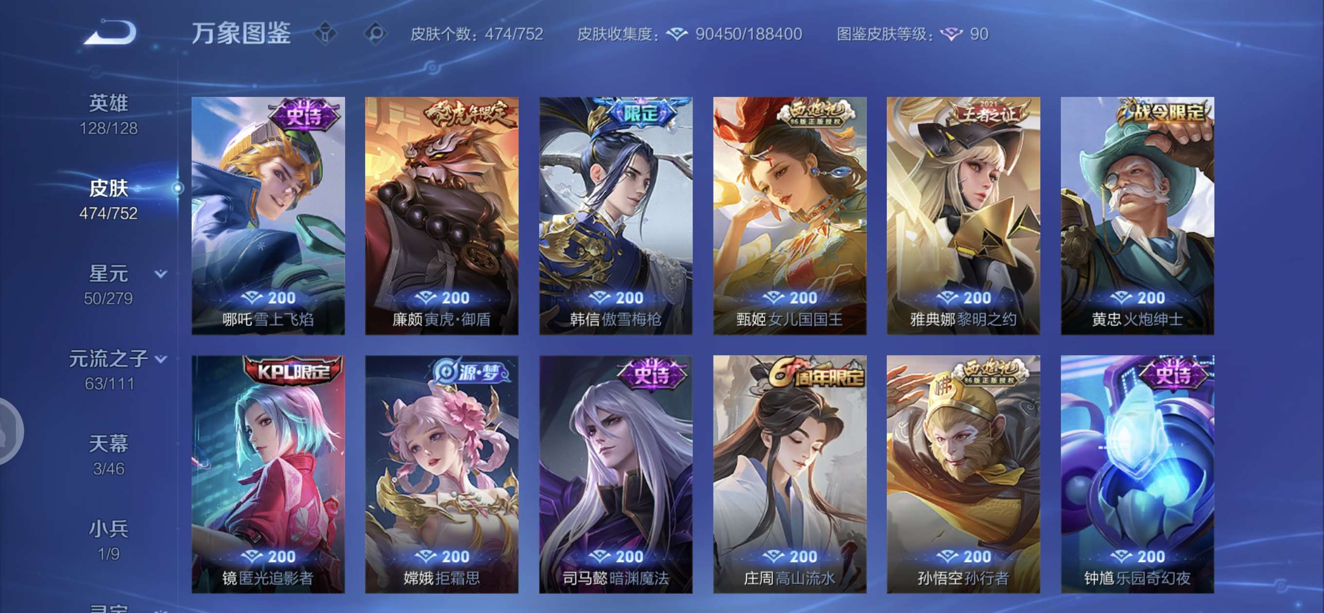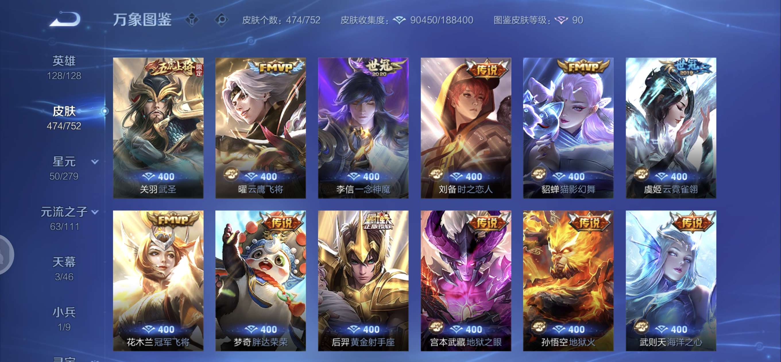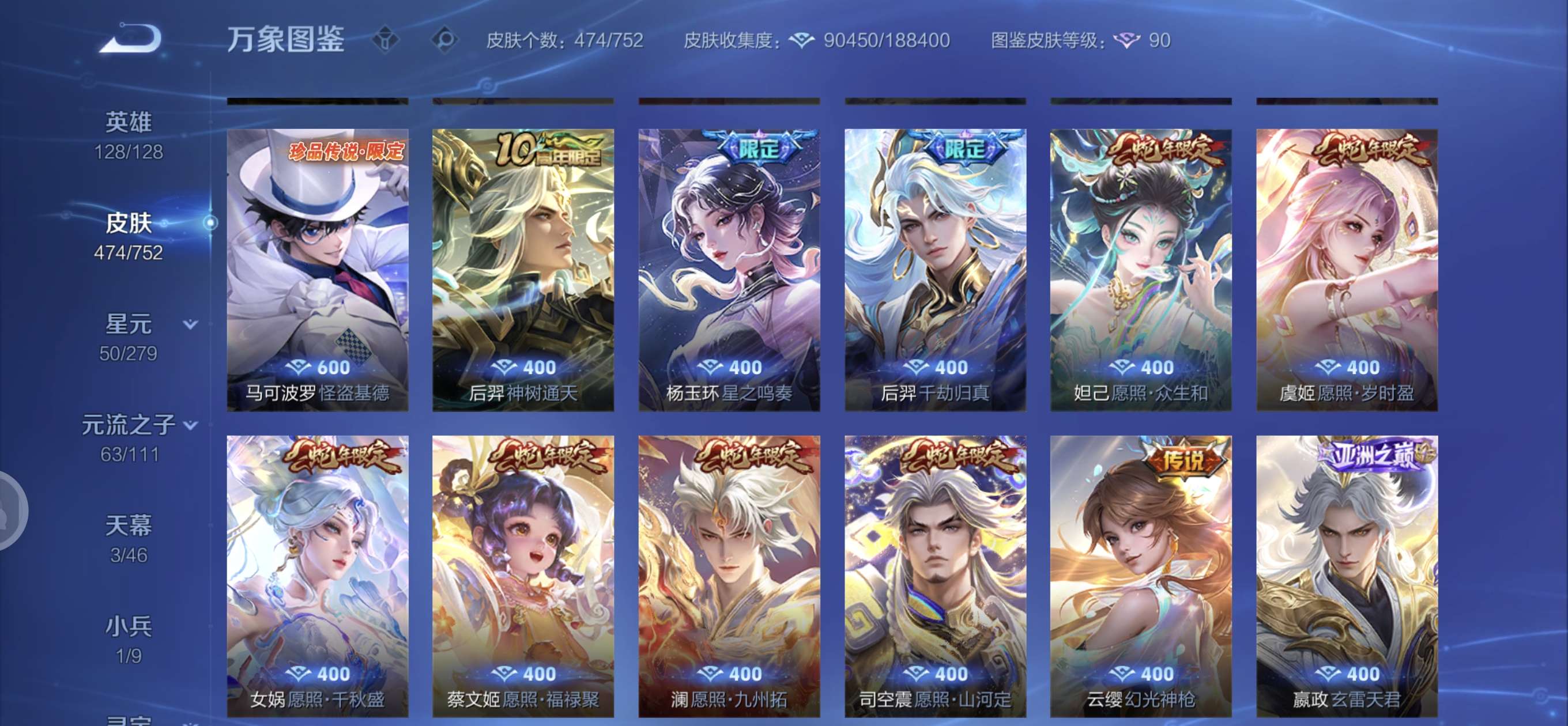 皮肤474 英雄128 至圣王者 荣耀典藏3 无双皮肤4 珍品传说6 传说71 其他皮肤172-全英雄皮肤很多荣誉贵族