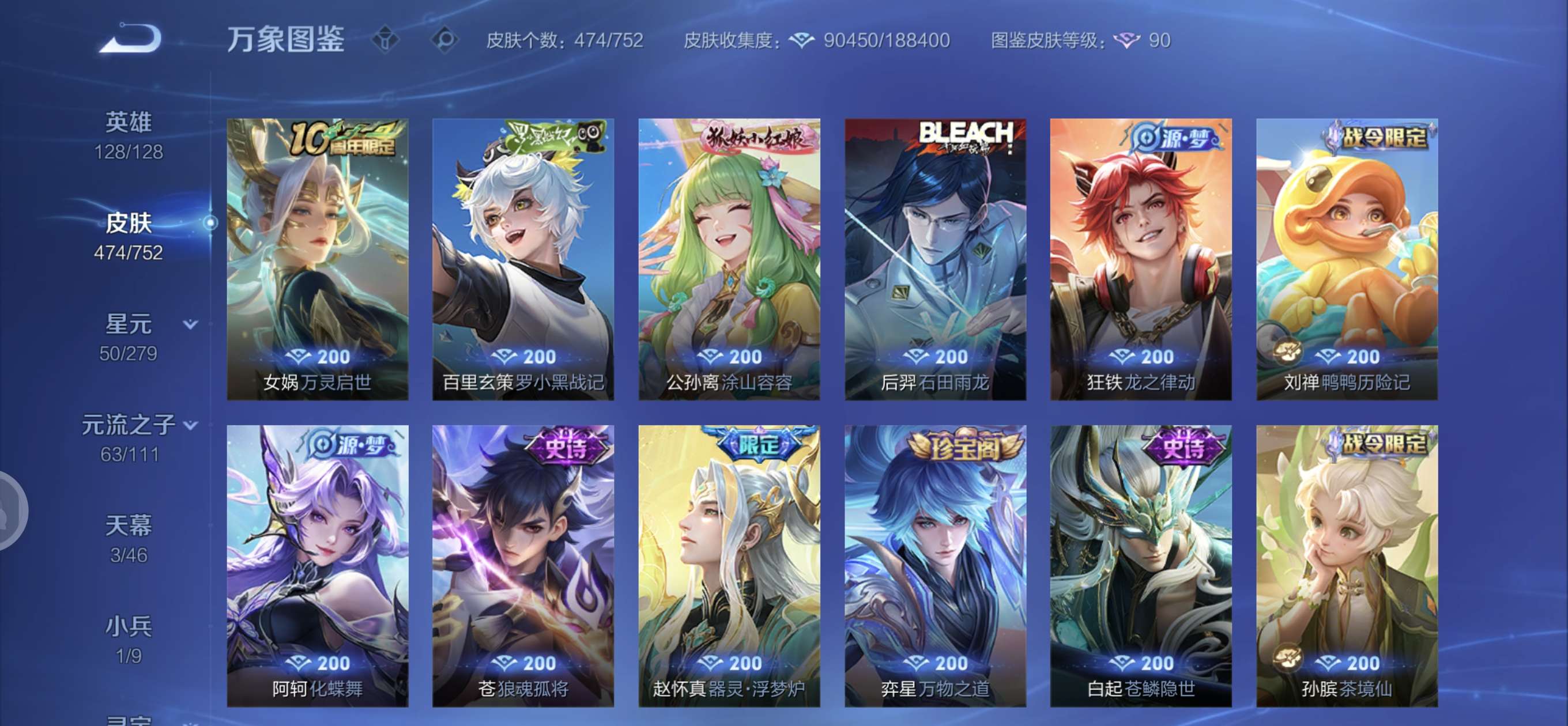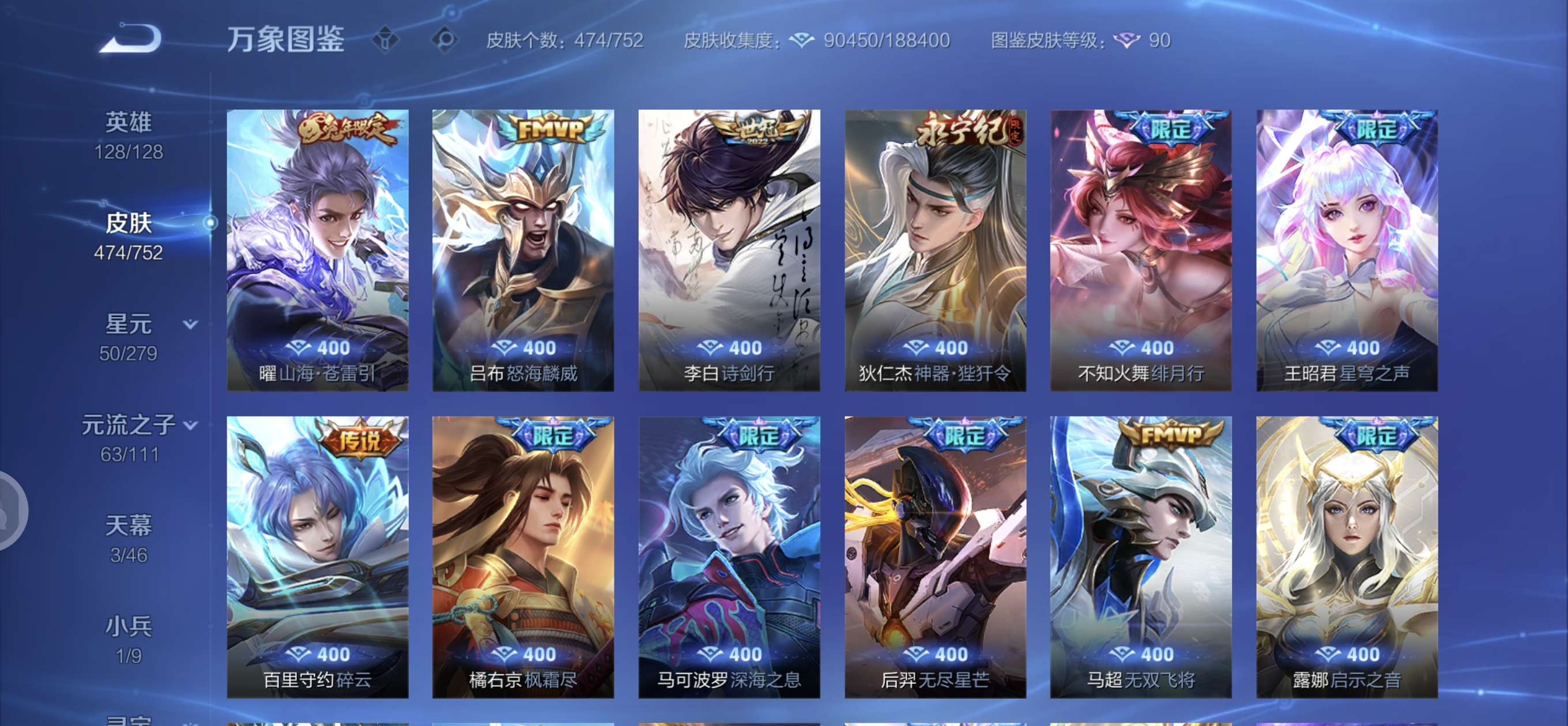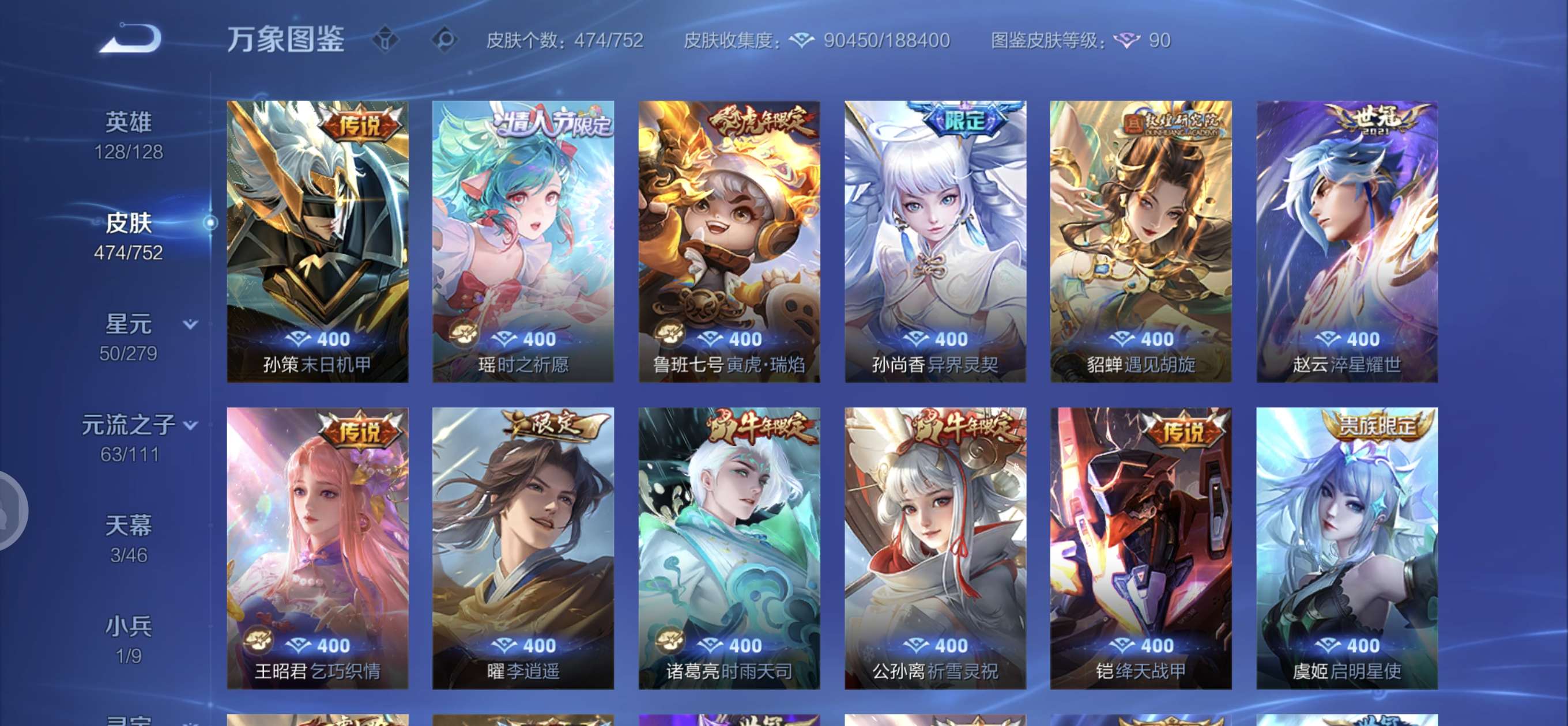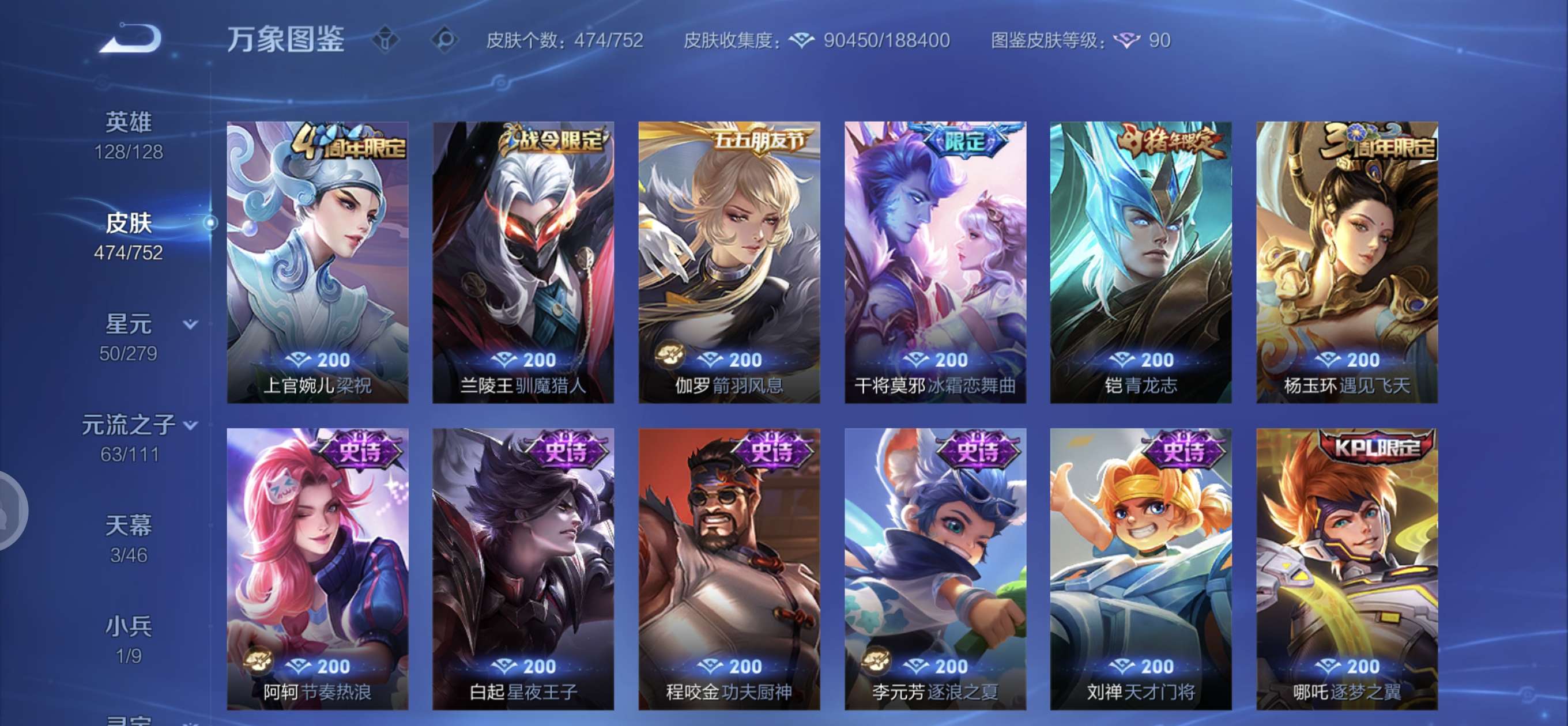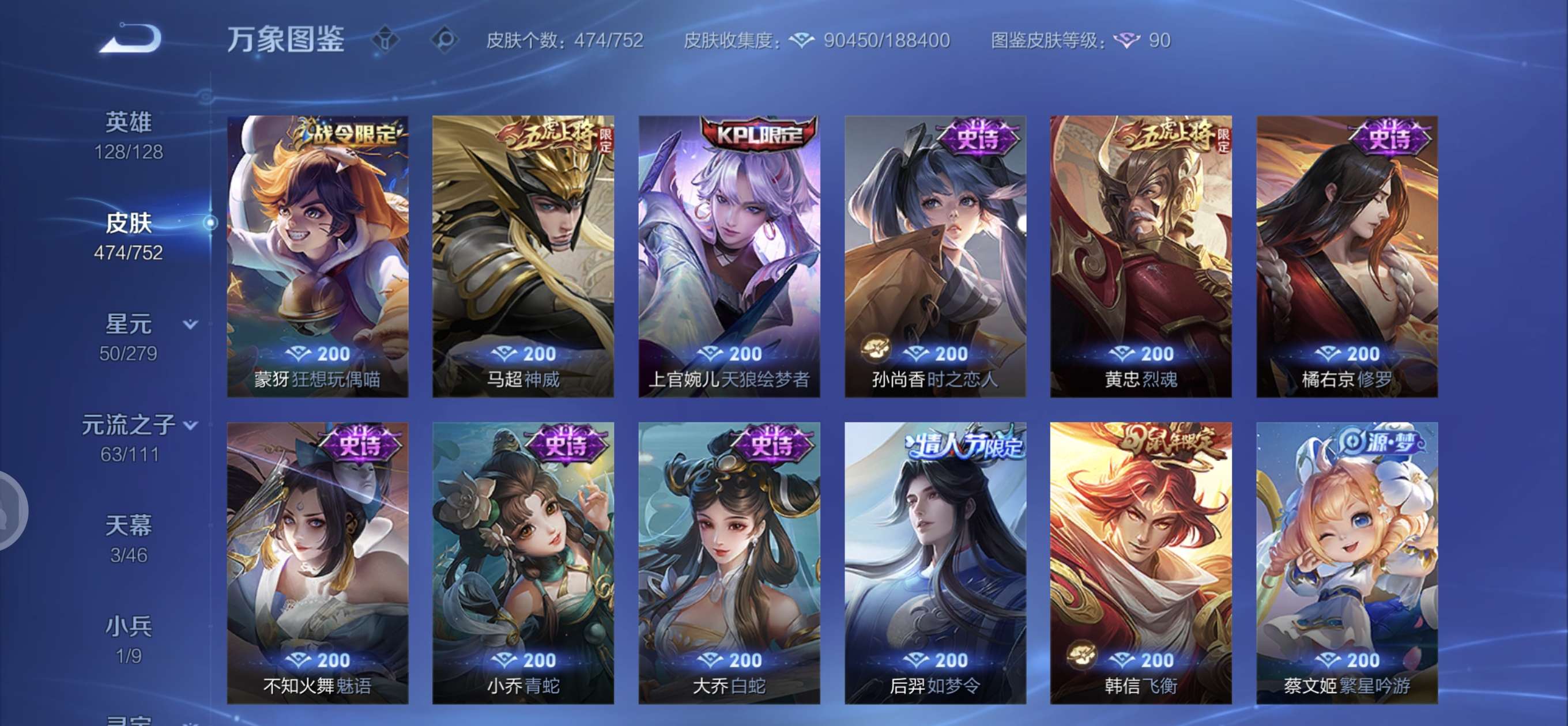 皮肤474 英雄128 至圣王者 荣耀典藏3 无双皮肤4 珍品传说6 传说71 其他皮肤172-全英雄皮肤很多荣誉贵族