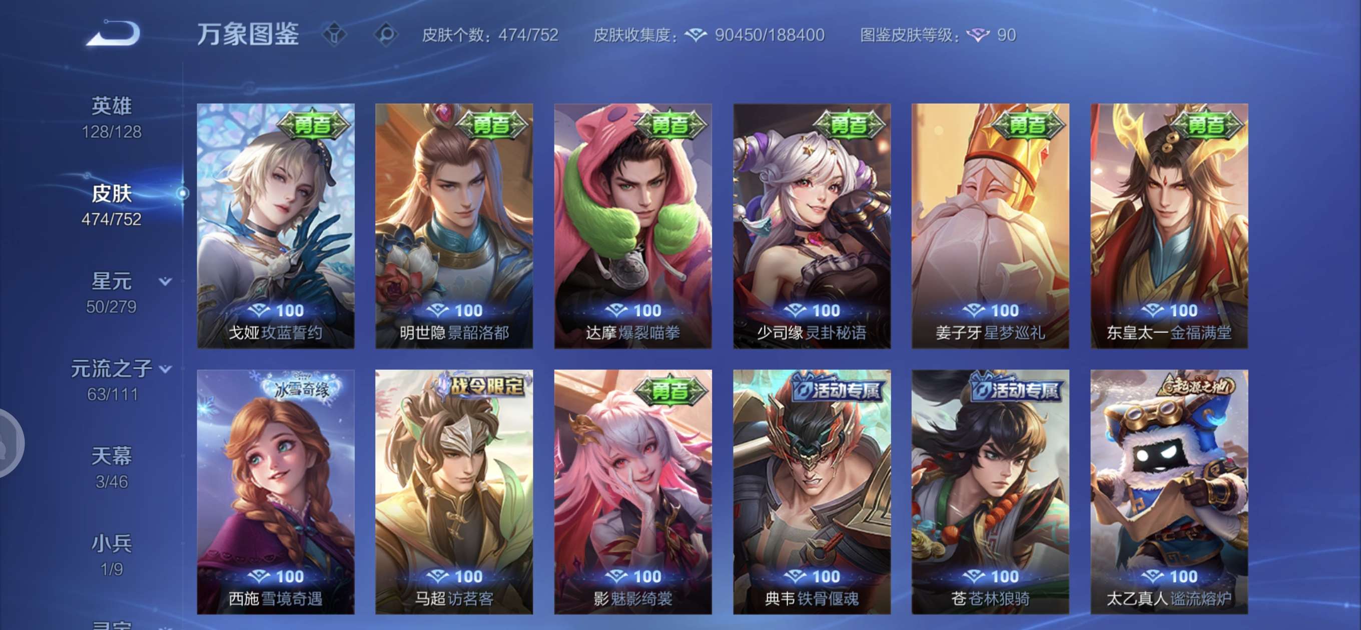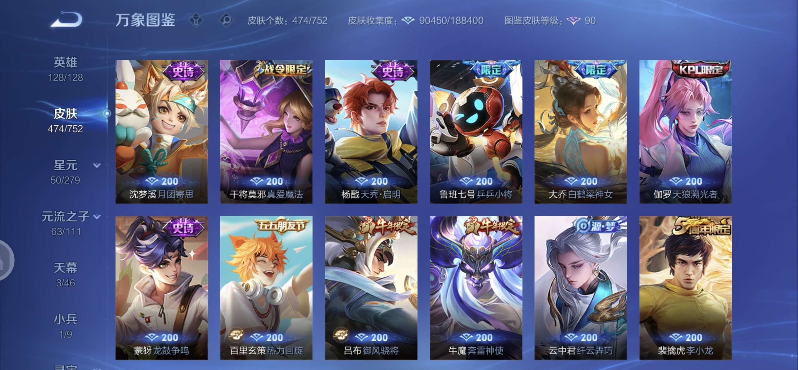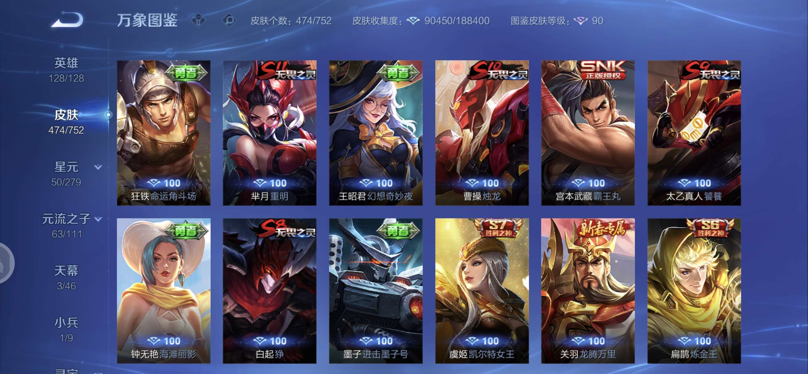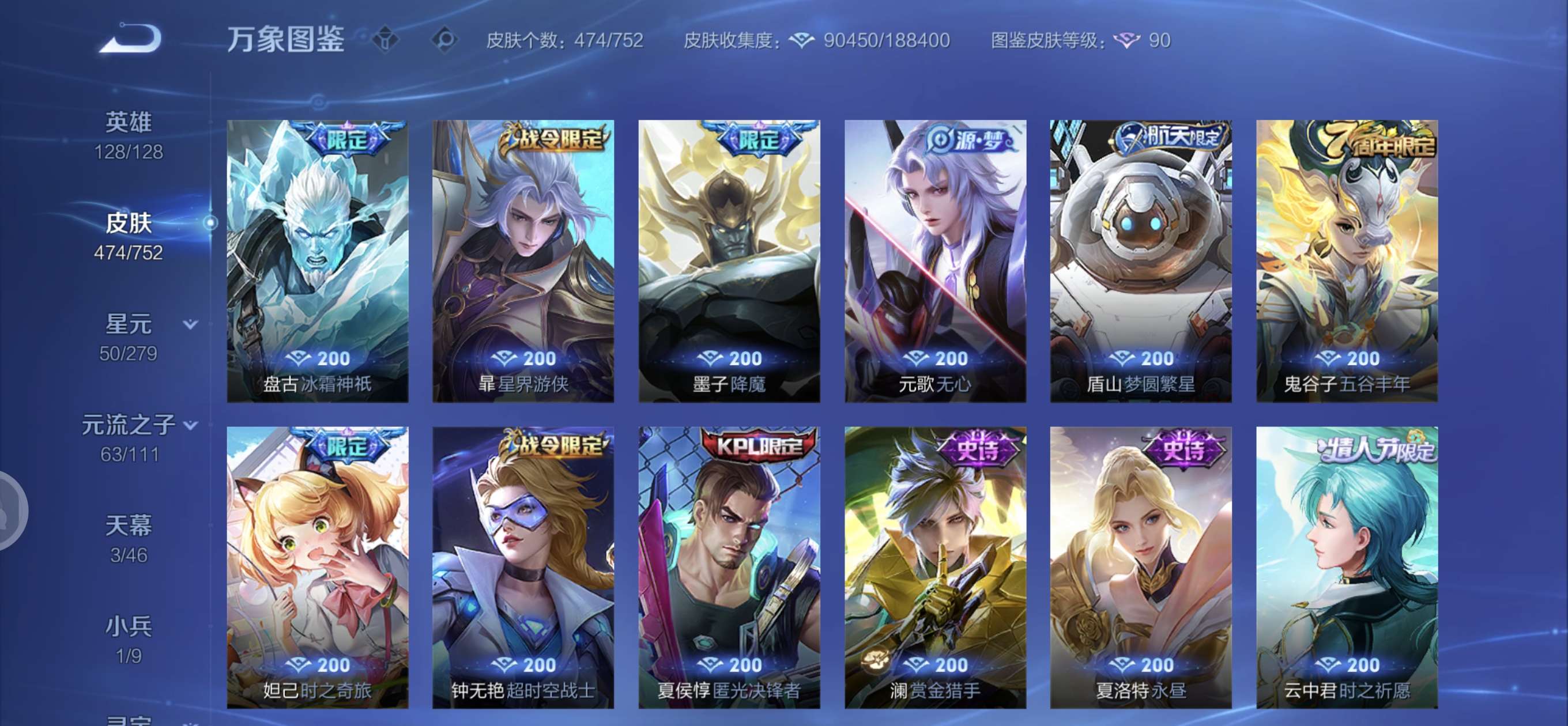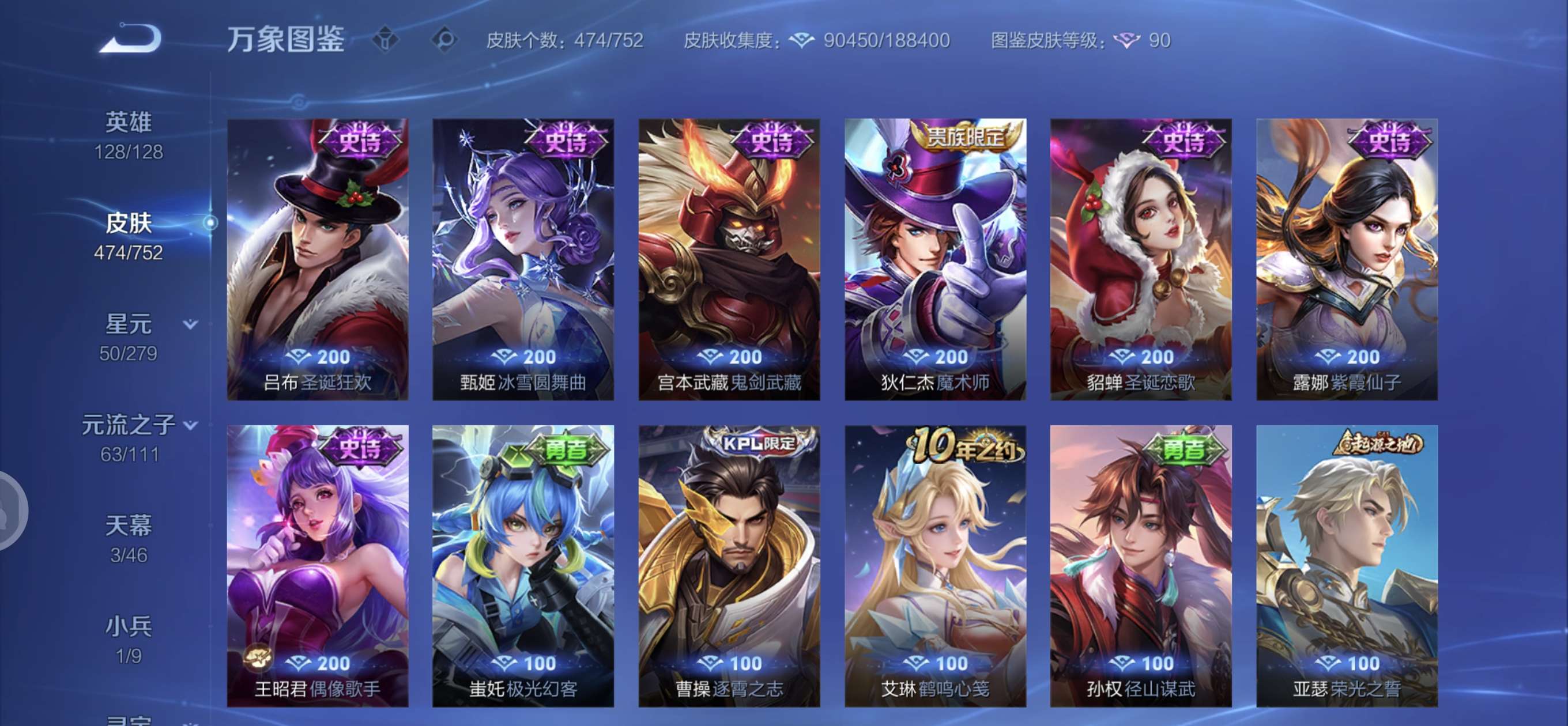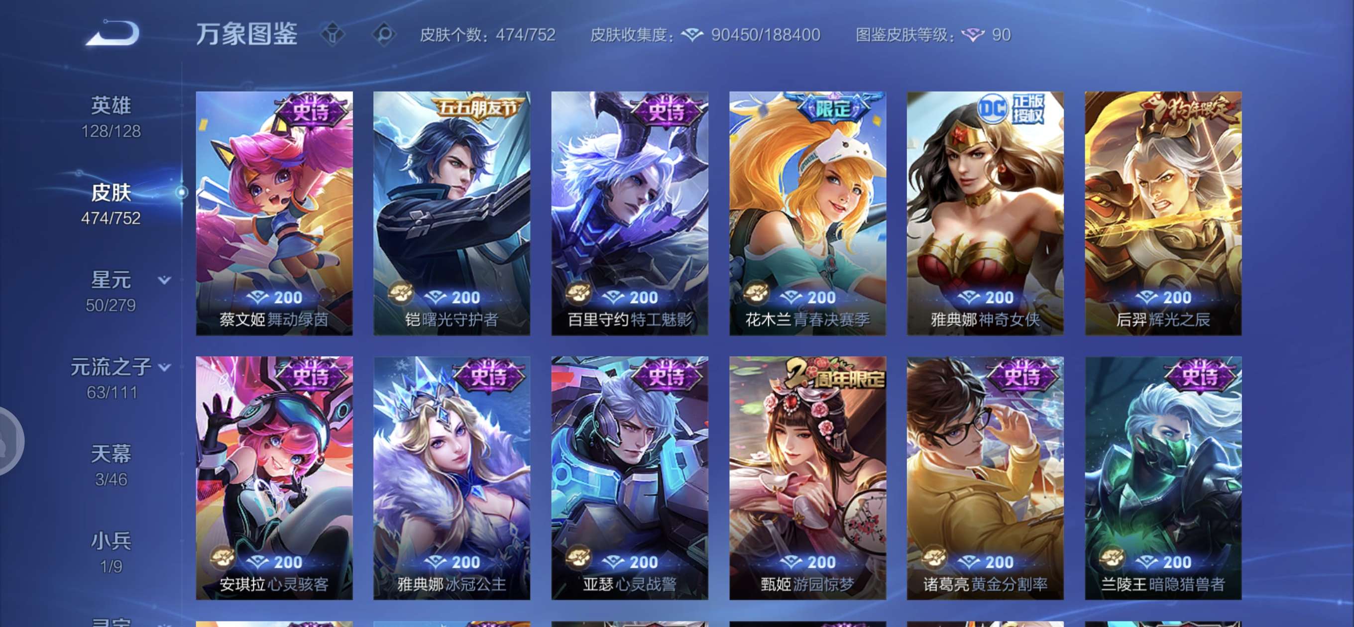皮肤474 英雄128 至圣王者 荣耀典藏3 无双皮肤4 珍品传说6 传说71 其他皮肤172-全英雄皮肤很多荣誉贵族