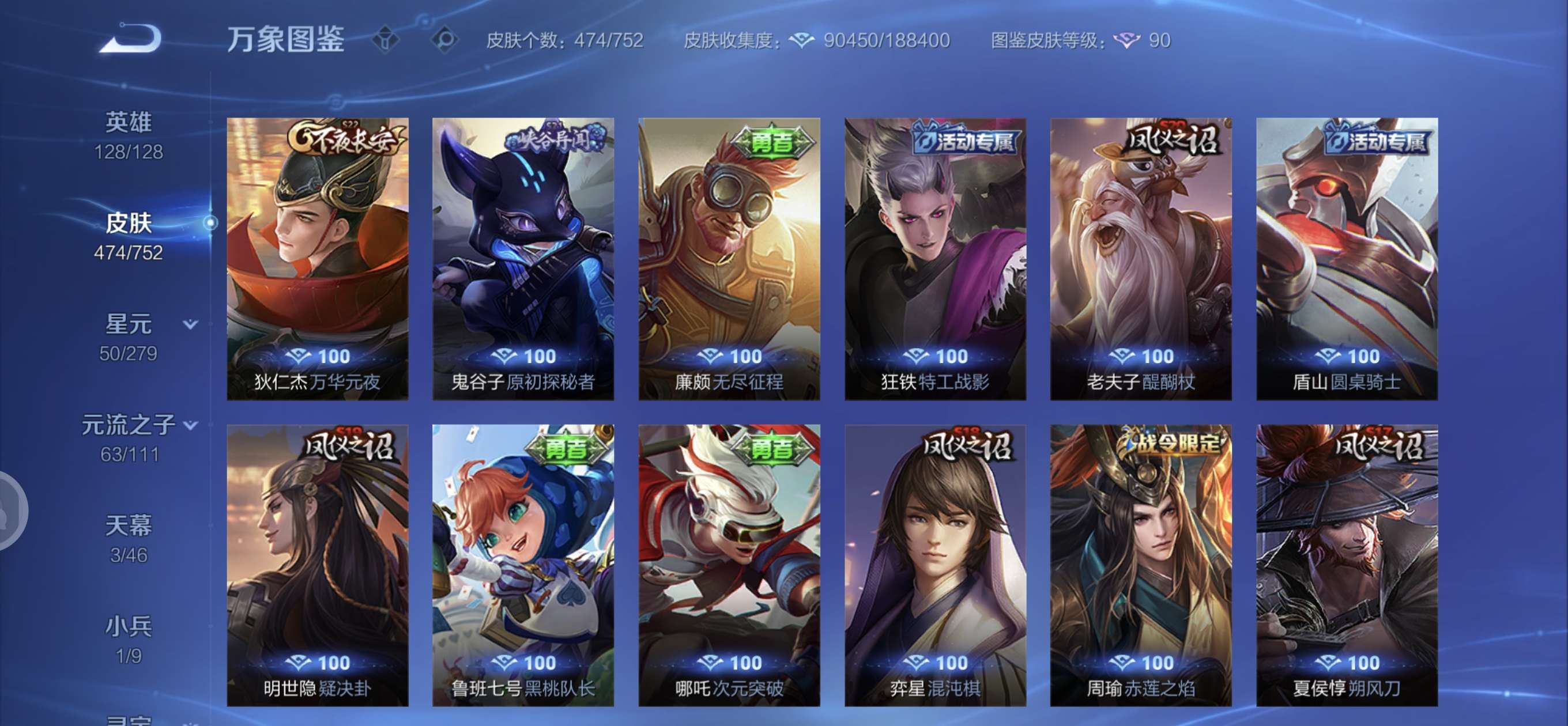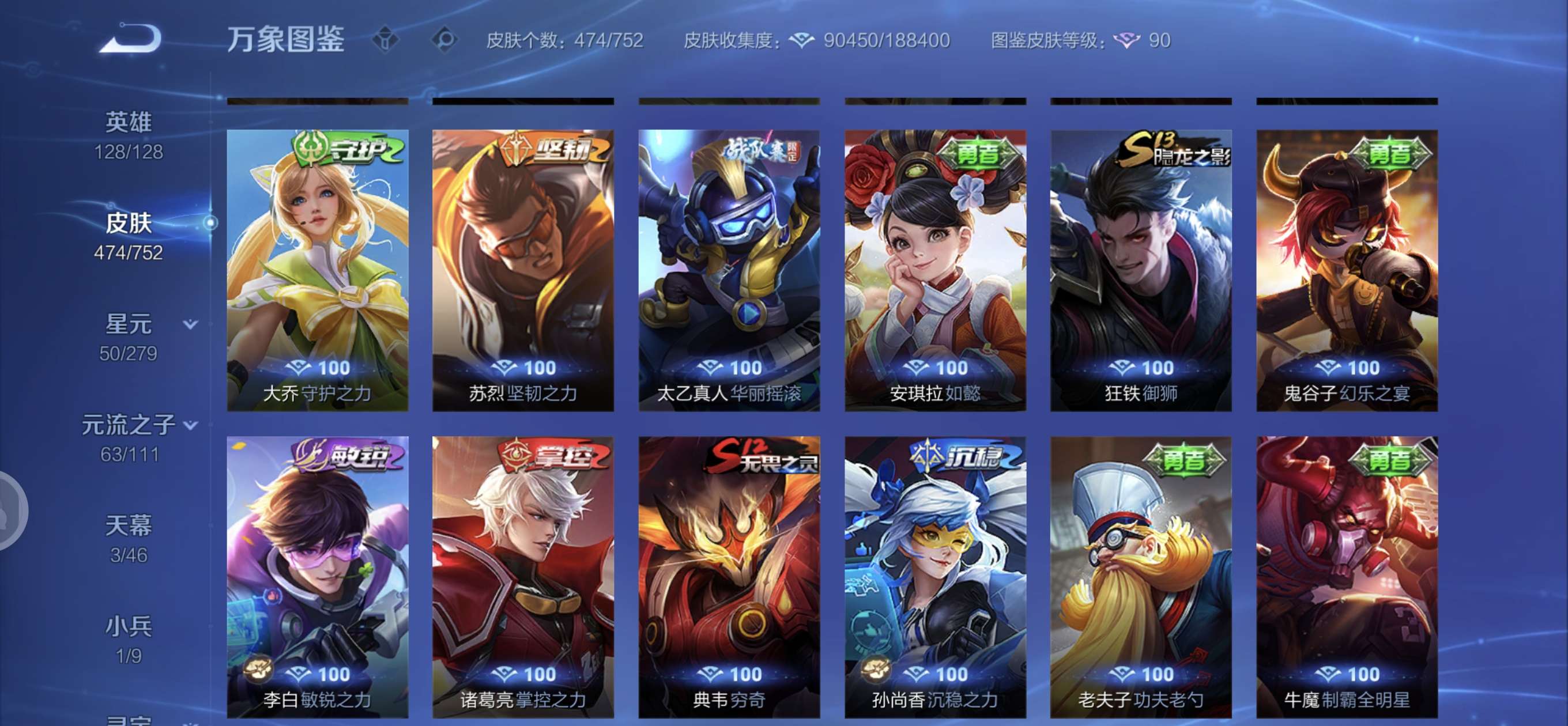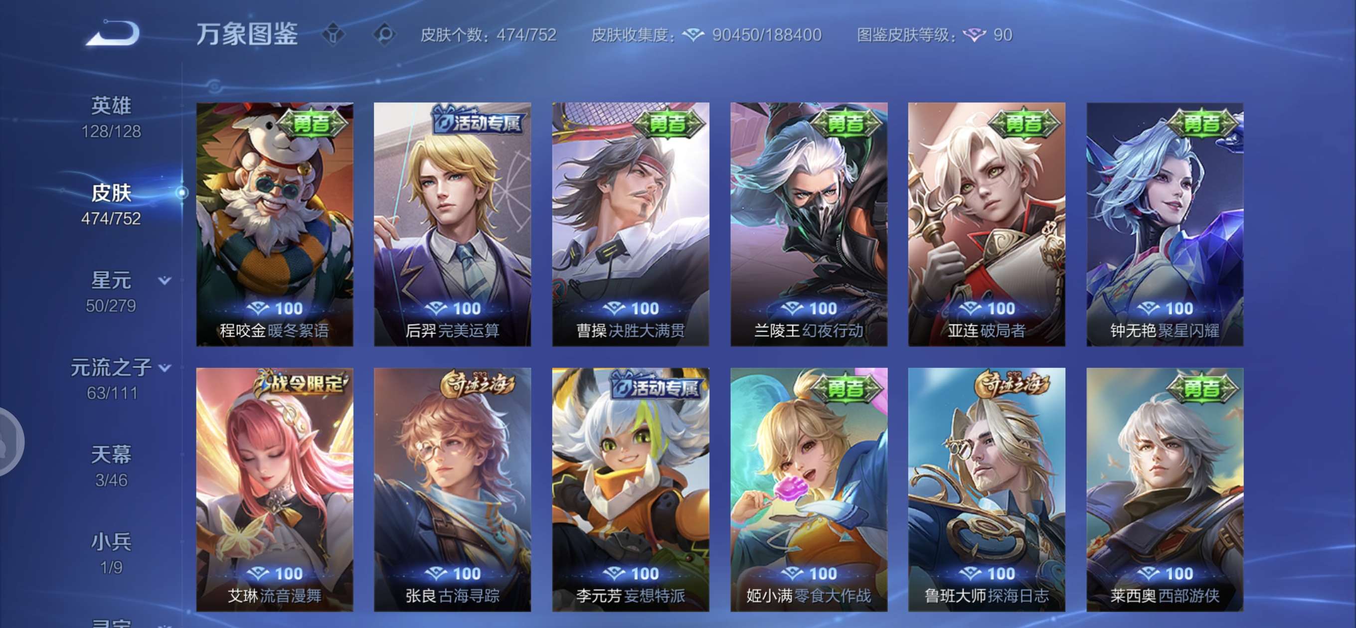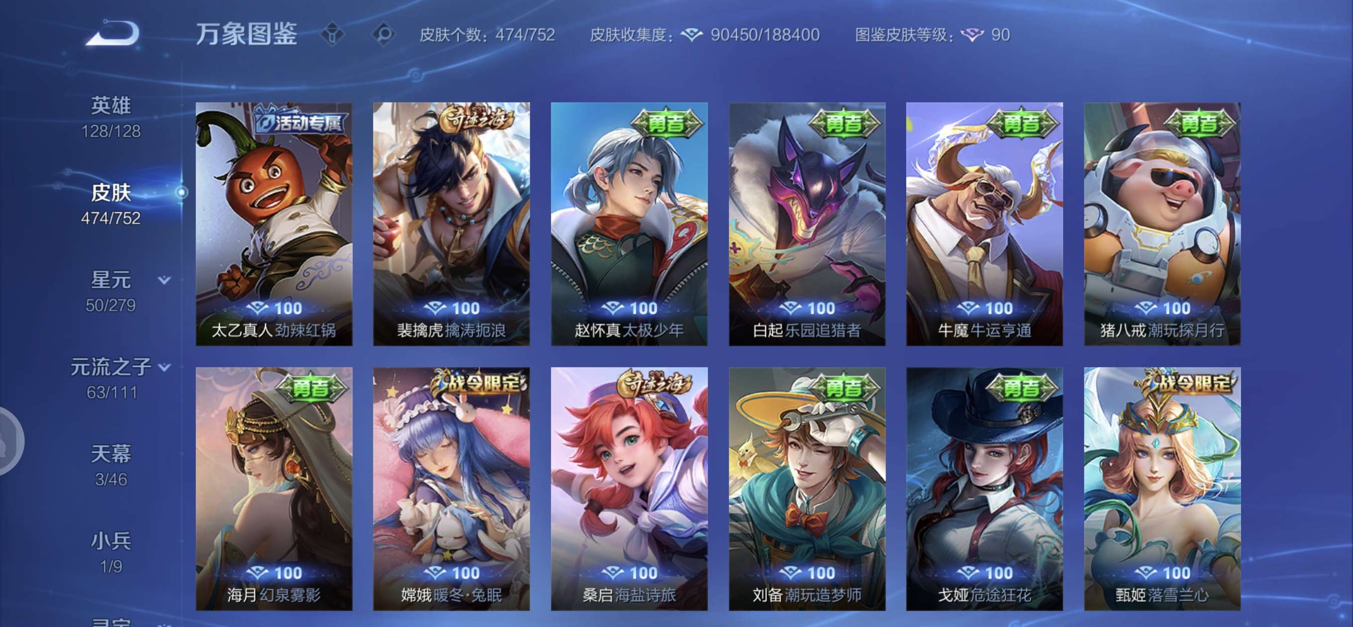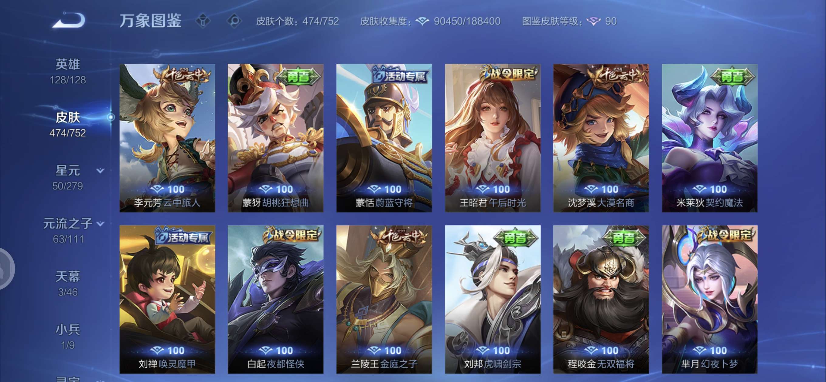 皮肤474 英雄128 至圣王者 荣耀典藏3 无双皮肤4 珍品传说6 传说71 其他皮肤172-全英雄皮肤很多荣誉贵族