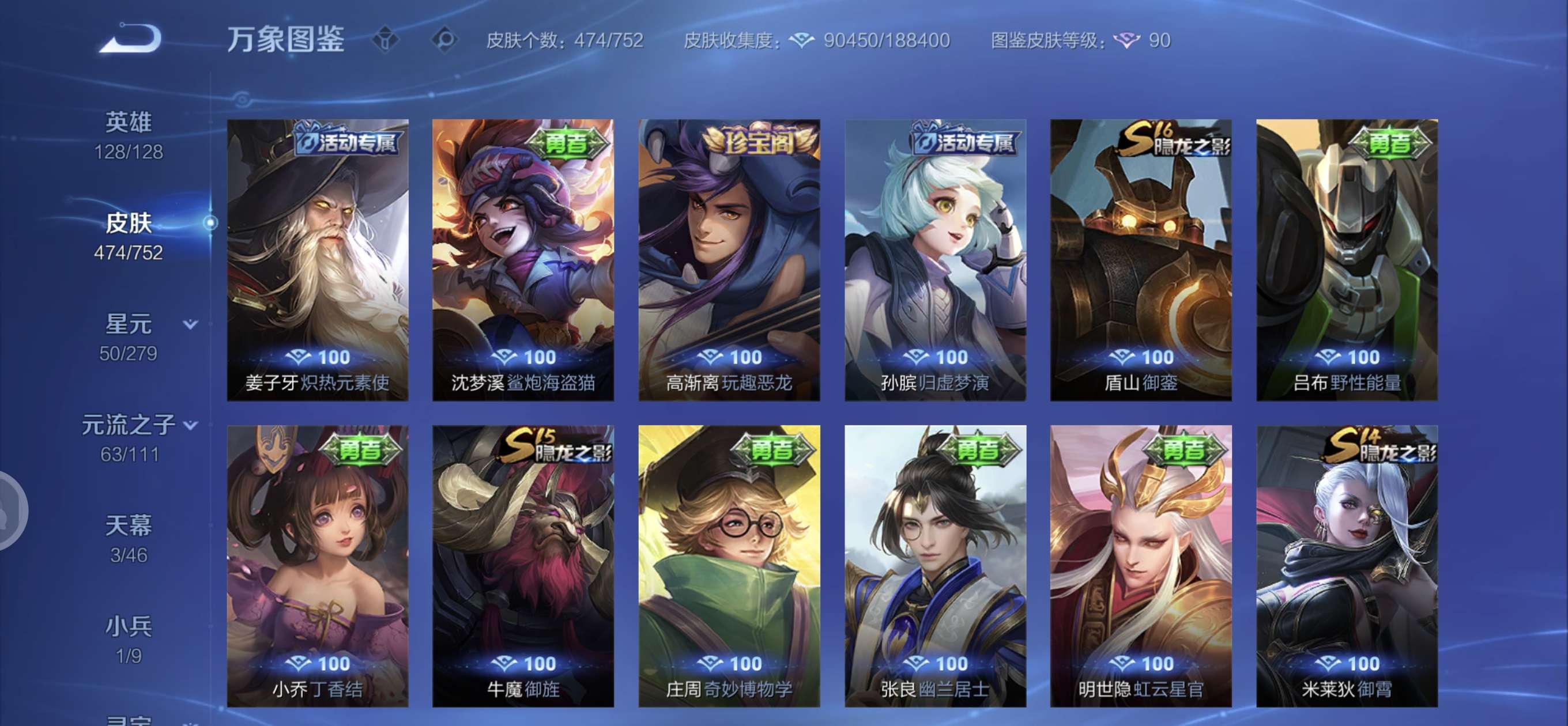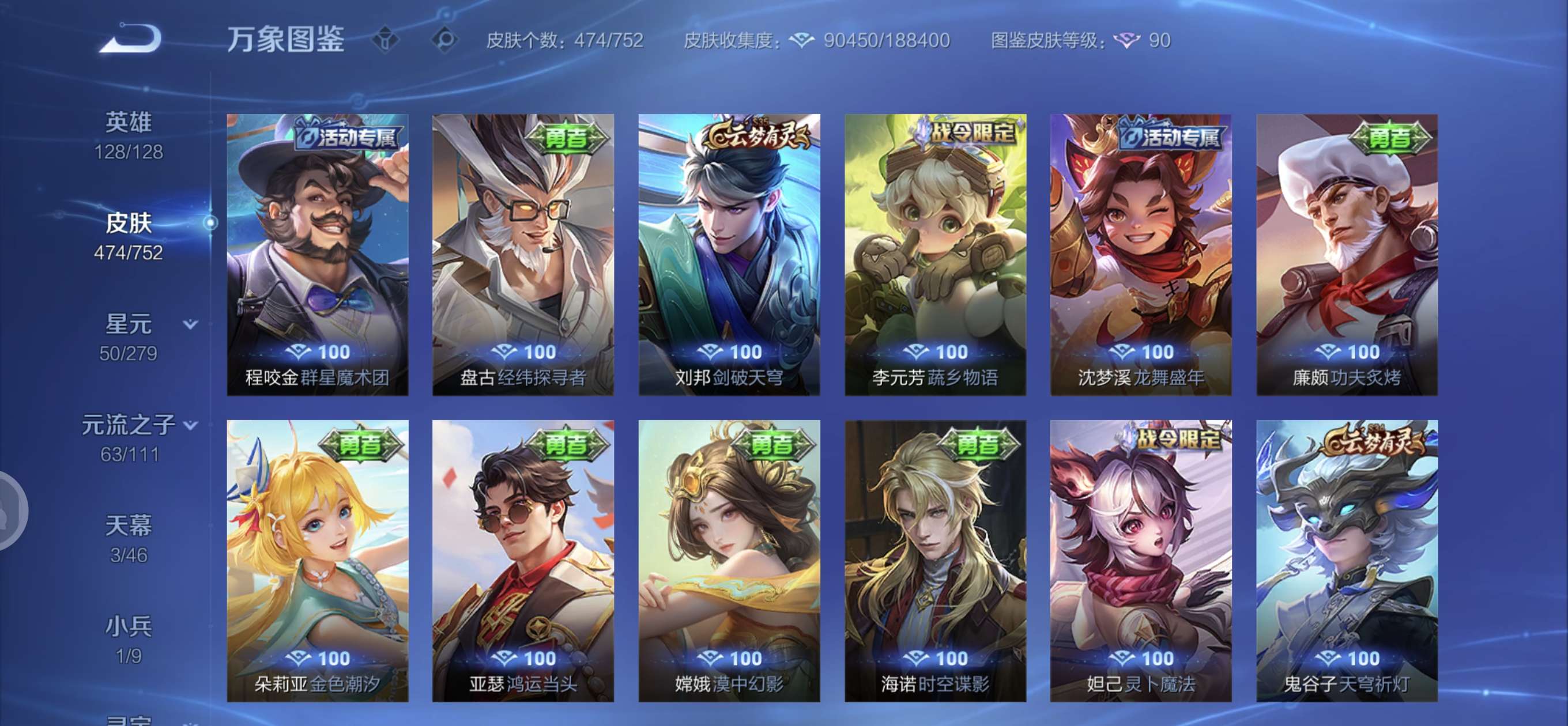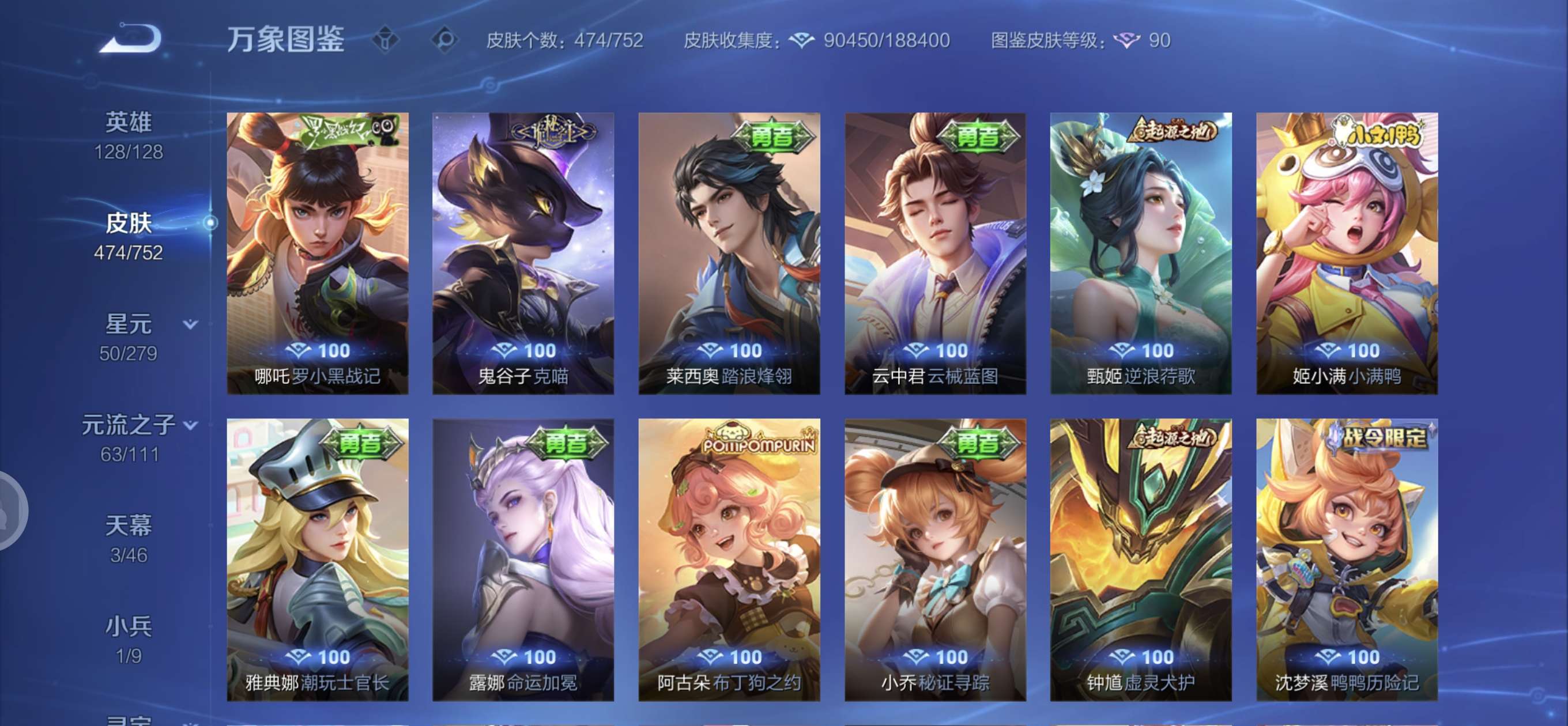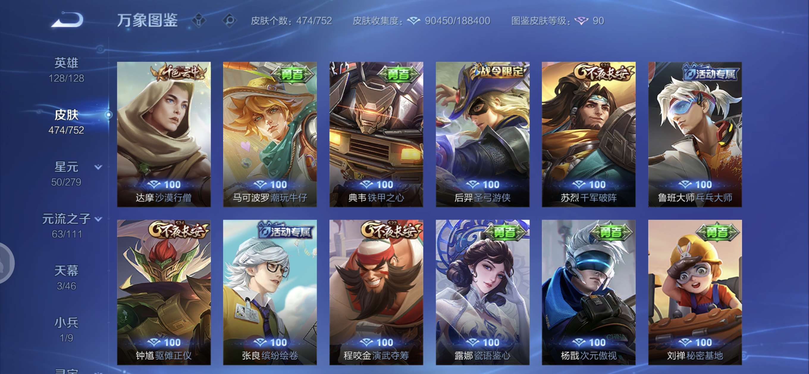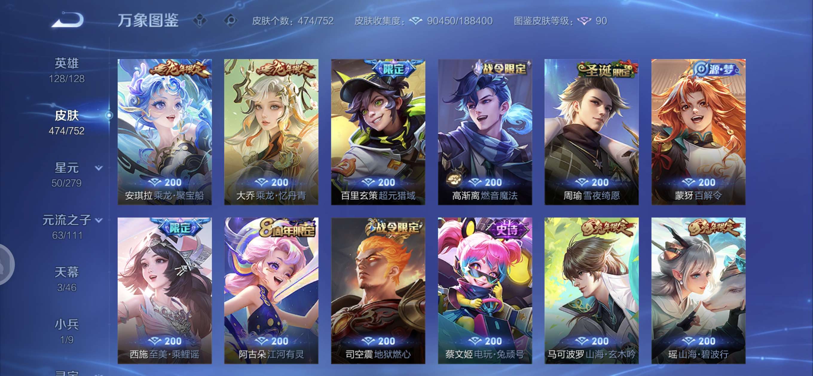 皮肤474 英雄128 至圣王者 荣耀典藏3 无双皮肤4 珍品传说6 传说71 其他皮肤172-全英雄皮肤很多荣誉贵族