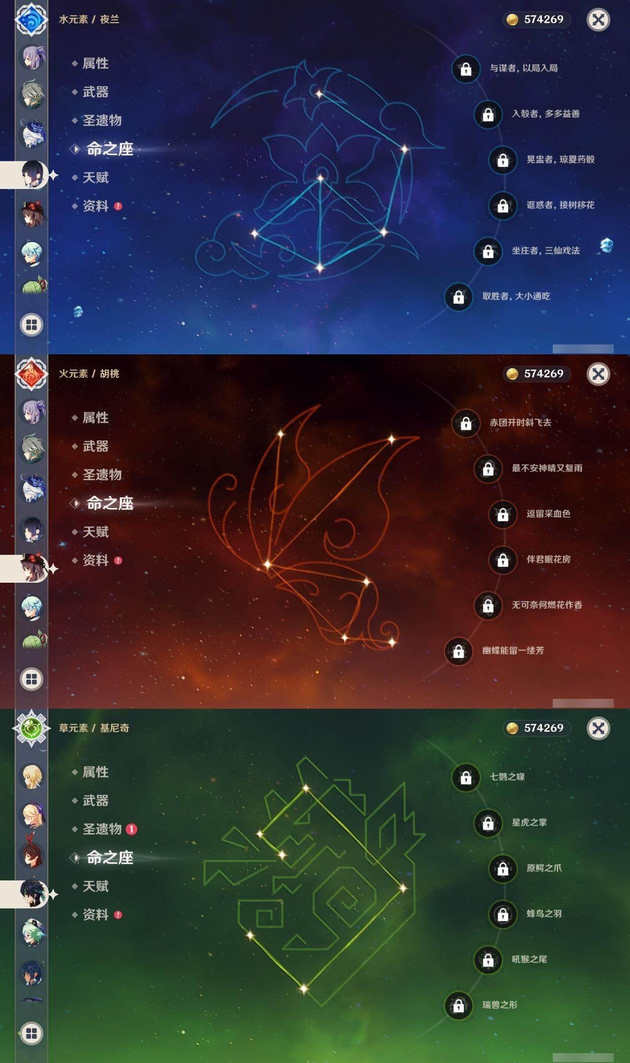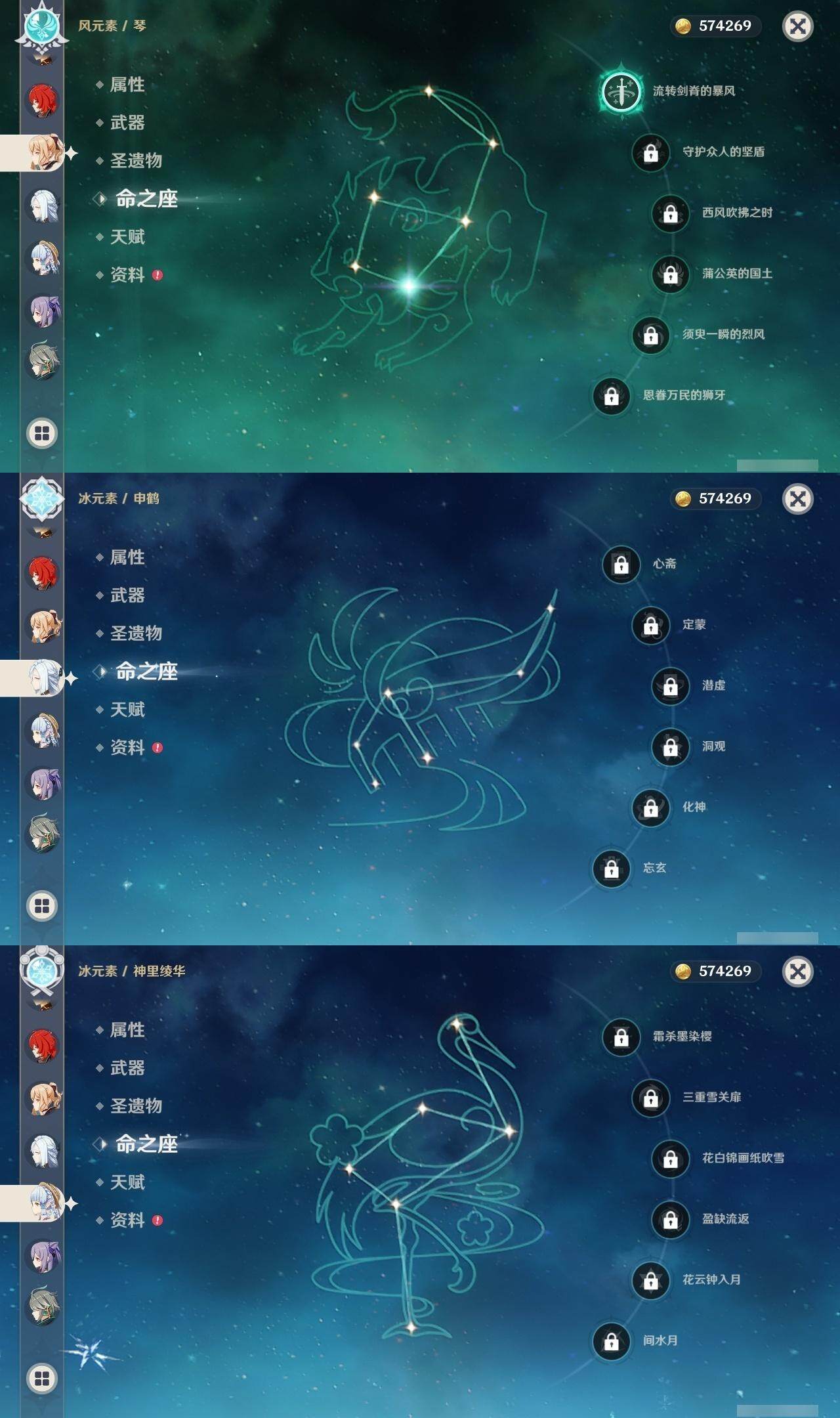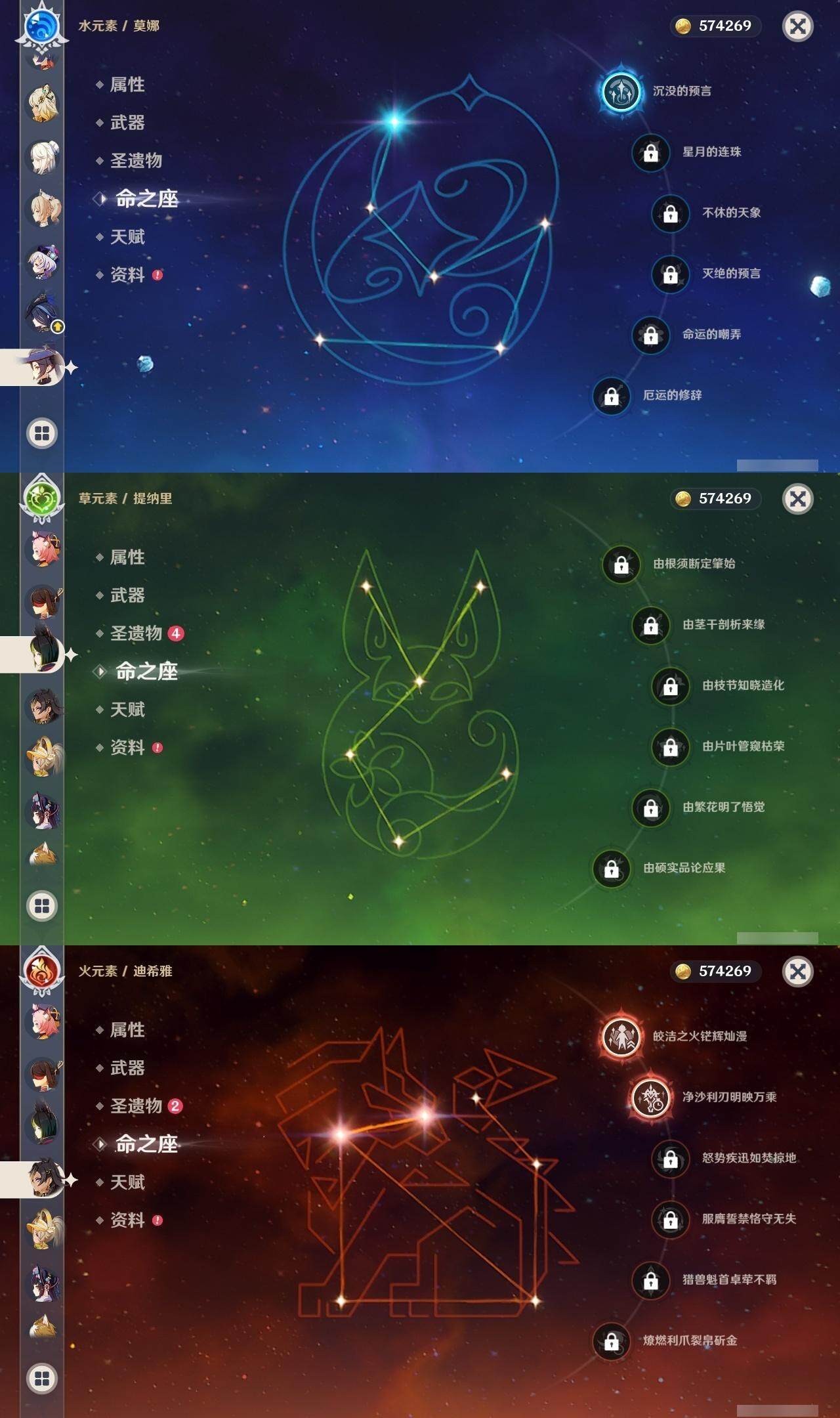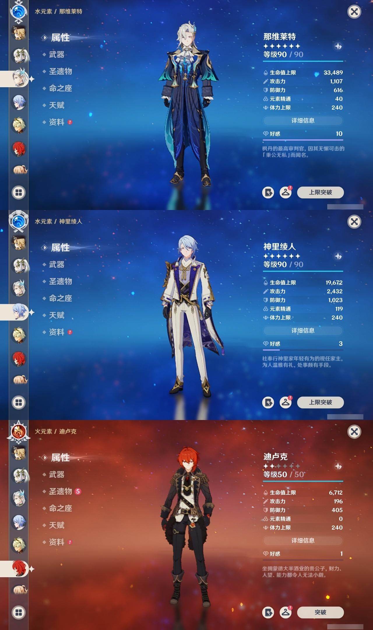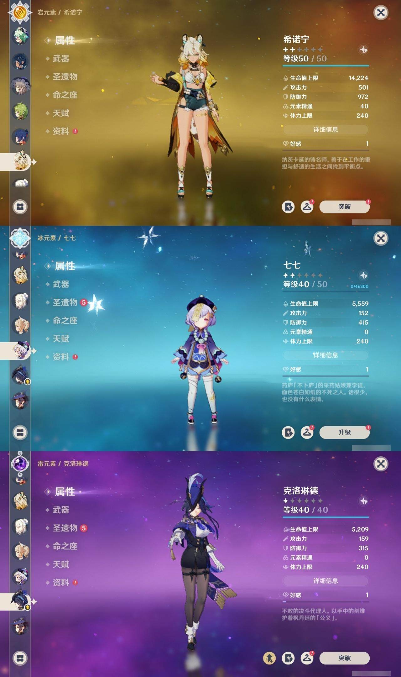 0命克洛琳德,0命娜维娅,0命芙宁娜,0命那维莱特,2命迪希雅,0命艾尔海森,0命纳西妲,0命提纳里,0命夜兰,0命神里绫人,0命申鹤,0命神里绫华,0命钟离,0命胡桃,0命宵宫,0命温迪,0命可莉,2命刻晴,2命七七,1命琴,1命莫娜,0命迪卢克,0命基尼奇,0命希诺宁,精1静水流涌之辉,精1万世流涌大典,精1圣显之钥,精1雾切之回光,精1