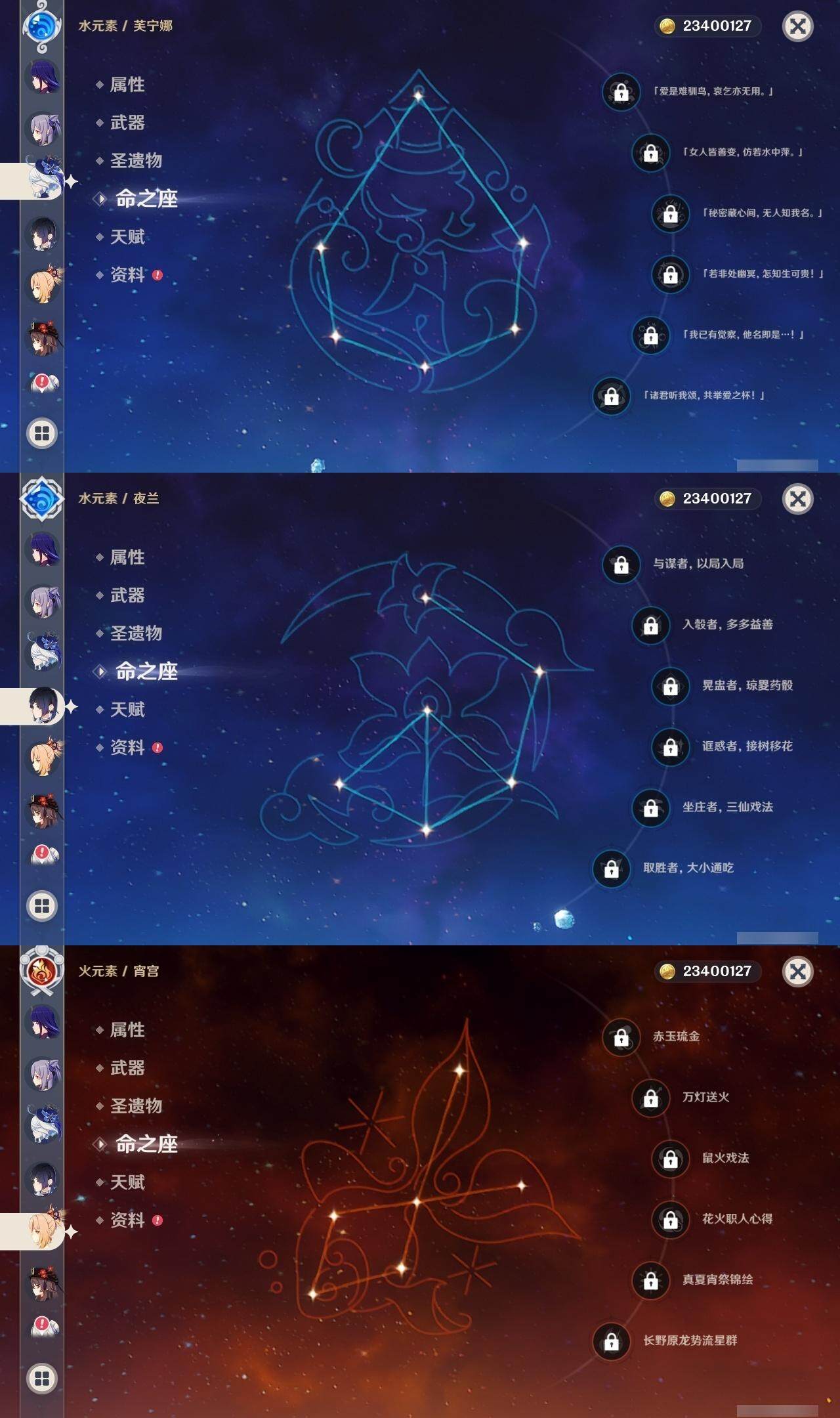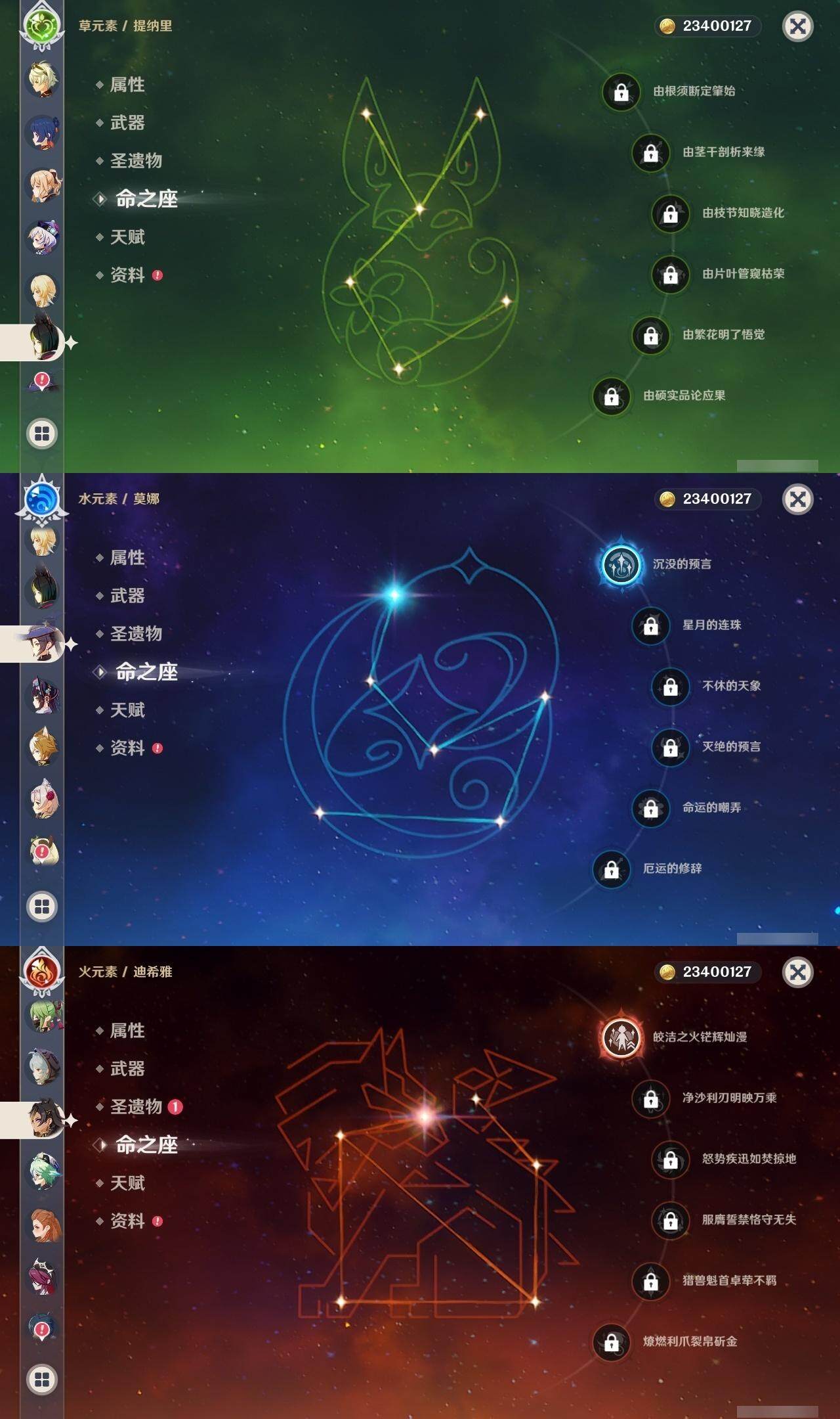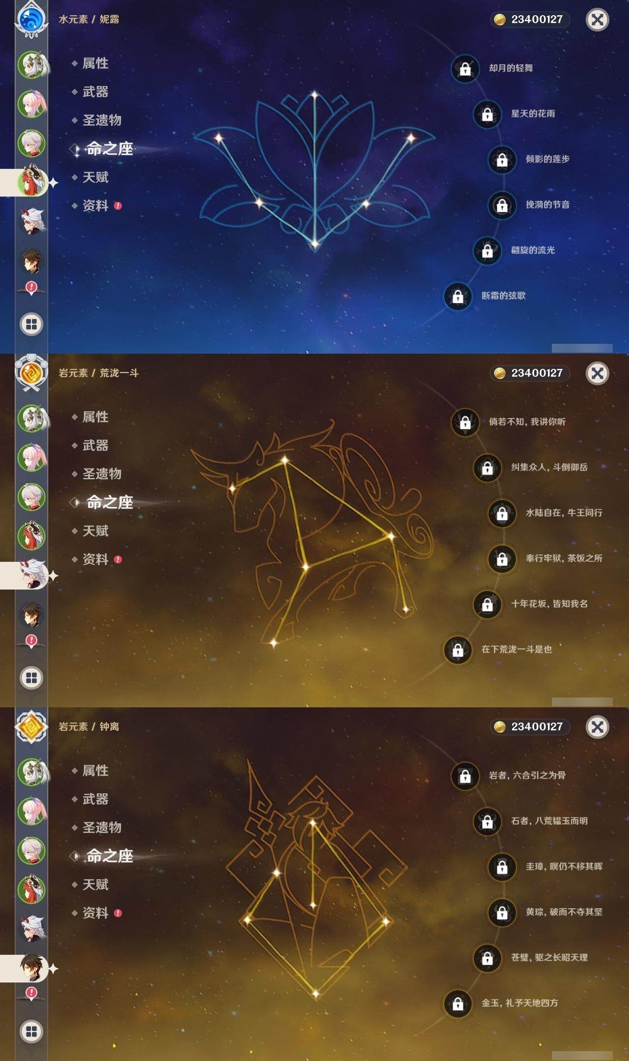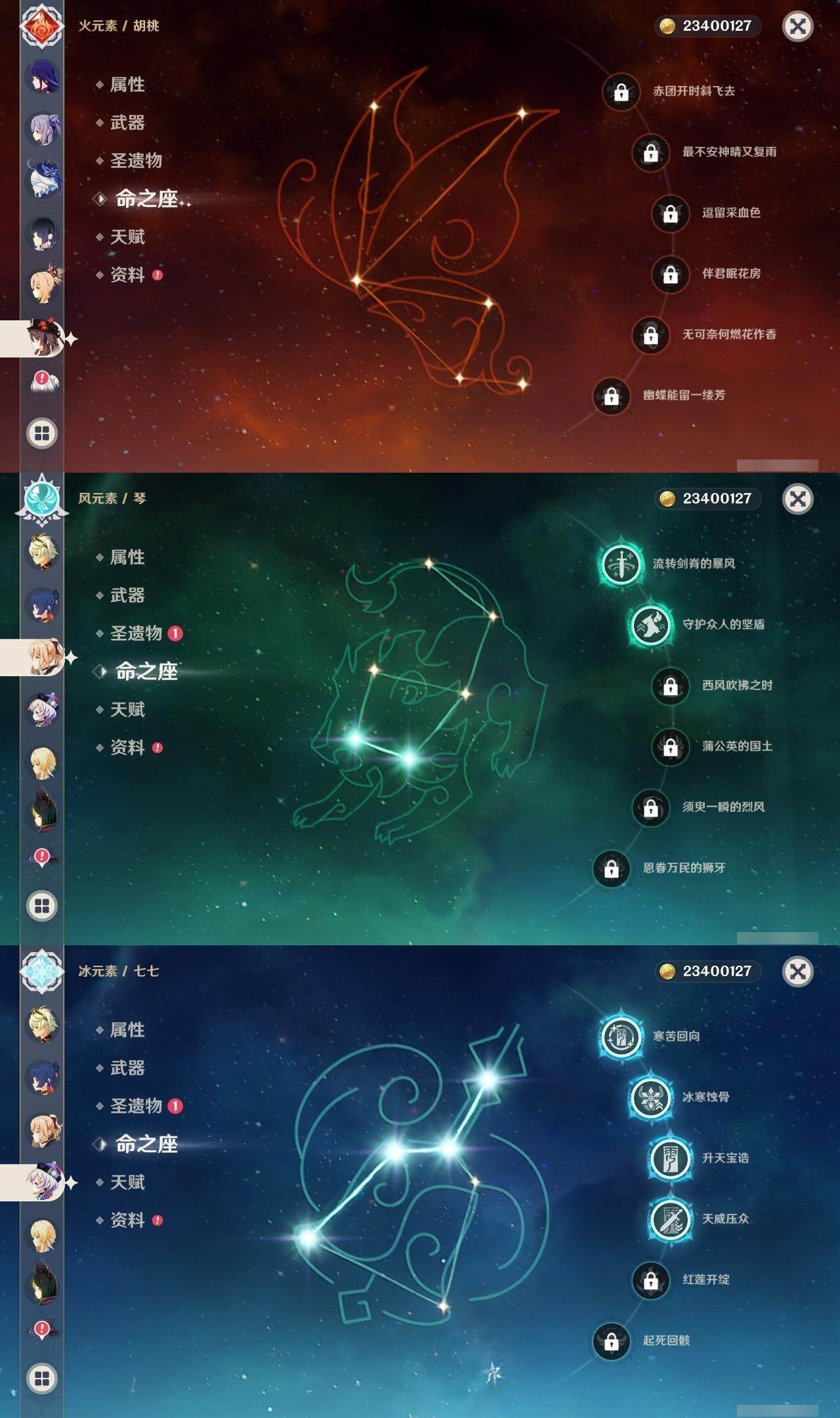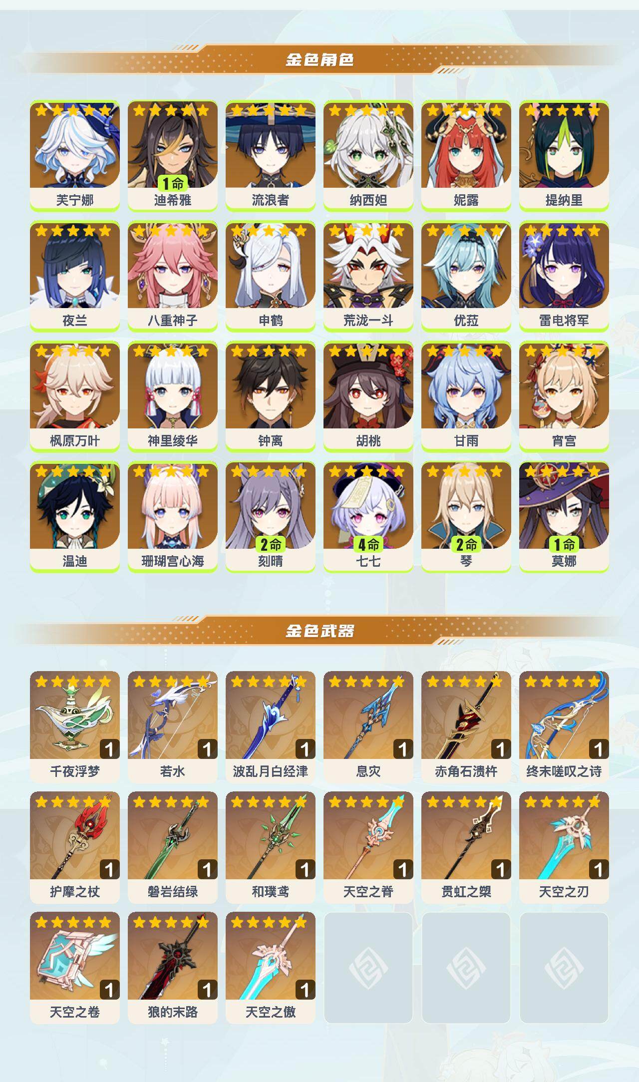 0命芙宁娜,1命迪希雅,0命流浪者,0命纳西妲,0命妮露,0命提纳里,0命夜兰,0命八重神子,0命申鹤,0命荒泷一斗,0命优菈,0命雷电将军,0命枫原万叶,0命神里绫华,0命钟离,0命胡桃,0命甘雨,0命宵宫,0命温迪,0命珊瑚宫心海,2命刻晴,4命七七,2命琴,1命莫娜,精1千夜浮梦,精1若水,精1波乱月白经津,精1息灾,精1赤角石溃杵,精