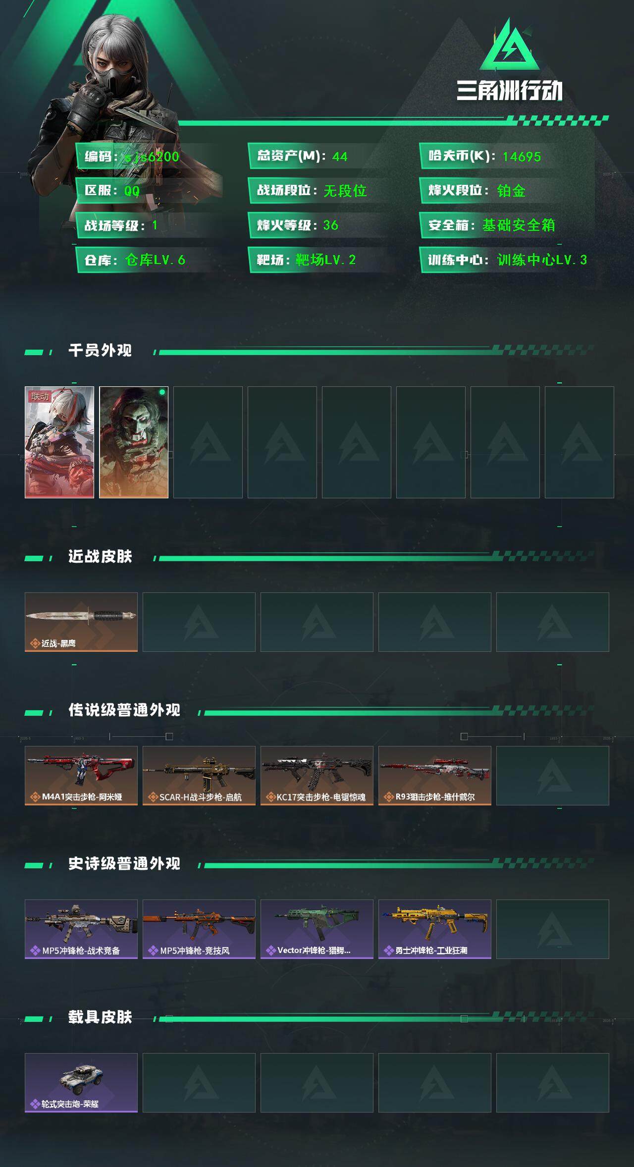 【sjs6200】0处罚 单维什戴尔小号 烽火地带段位: 铂金 全面战场段位: 无段位 总资产: 44000000 哈夫币: 14695000 sjs6200 传说武器皮肤: M4A1突击步枪-阿米娅,R93狙击步枪-维什戴尔,SCAR-H战斗步枪-启航,KC17突击步枪-电锯惊魂 史诗武器皮肤: Vector冲锋枪-猎鳄行动,勇士冲锋枪-工业狂潮,MP5冲锋枪-战术竞备 干员外观: 骇爪-维什戴尔,红狼-电锯惊魂 载具皮肤: 轮式突击炮-荣耀 亮点: 【sjs6200】总资产:44.7M 哈夫