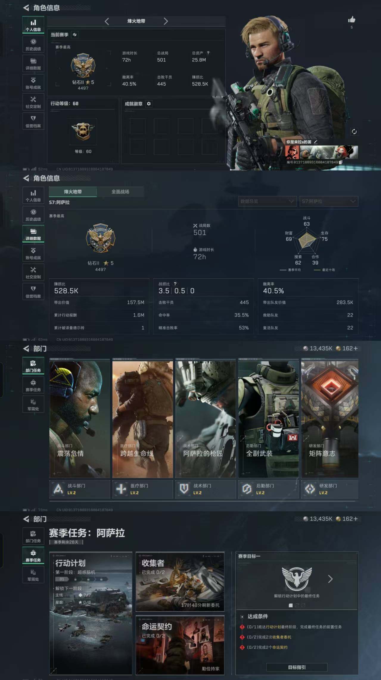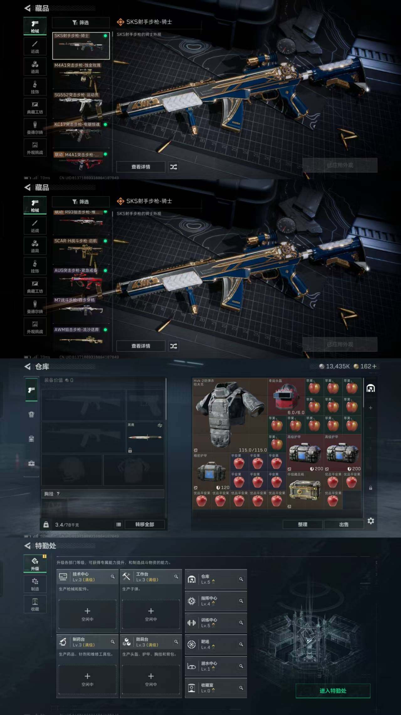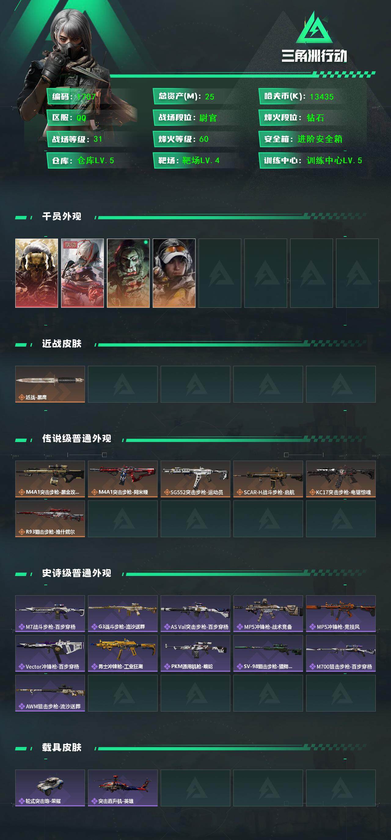 总资产(M):25M/哈夫币(K):13435K/哈夫币(K):13435K/传说枪皮数:6/全面战