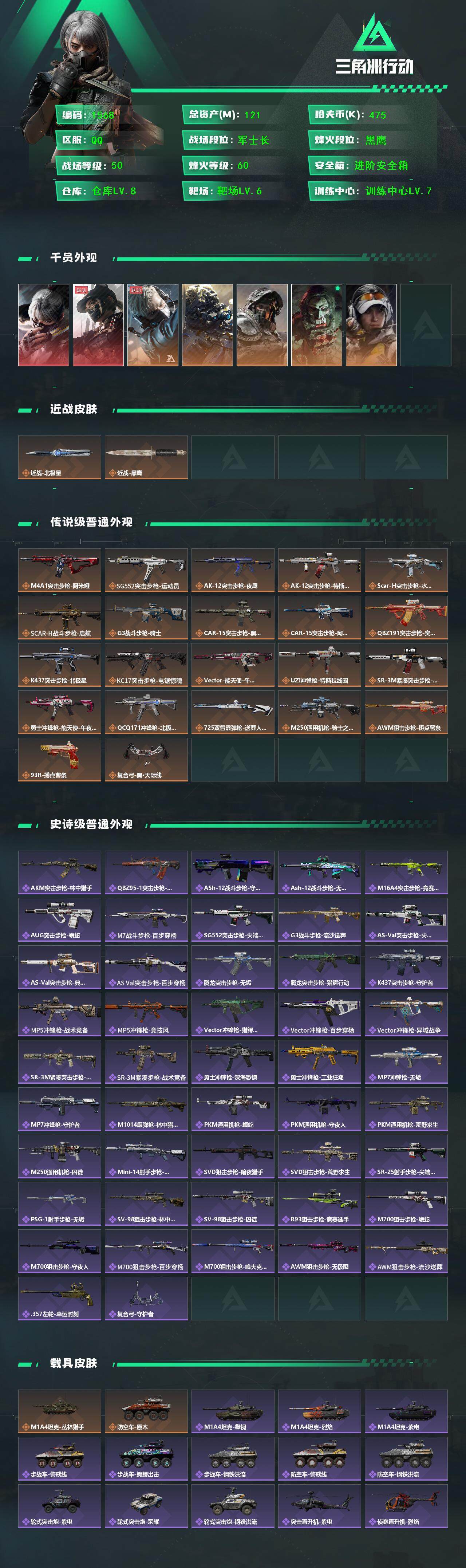 总资产(M):121M/哈夫币(K):475K/哈夫币(K):475K/传说枪皮数:22/全面战场等