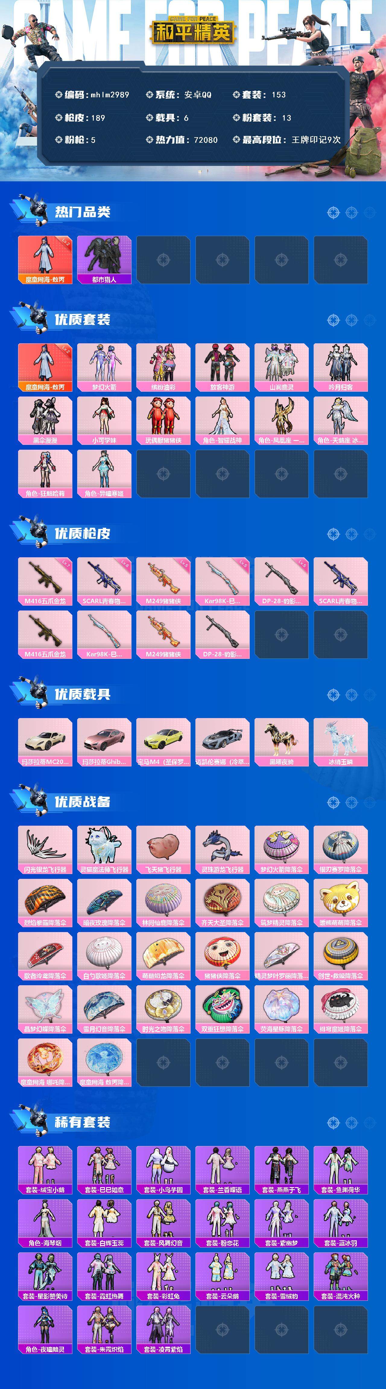 【mhlm2989】安卓 手Q-1神装-13粉装-5特效枪-6载具-6粉色飞行器-72080热力值-9王牌印记-153套装-189枪皮