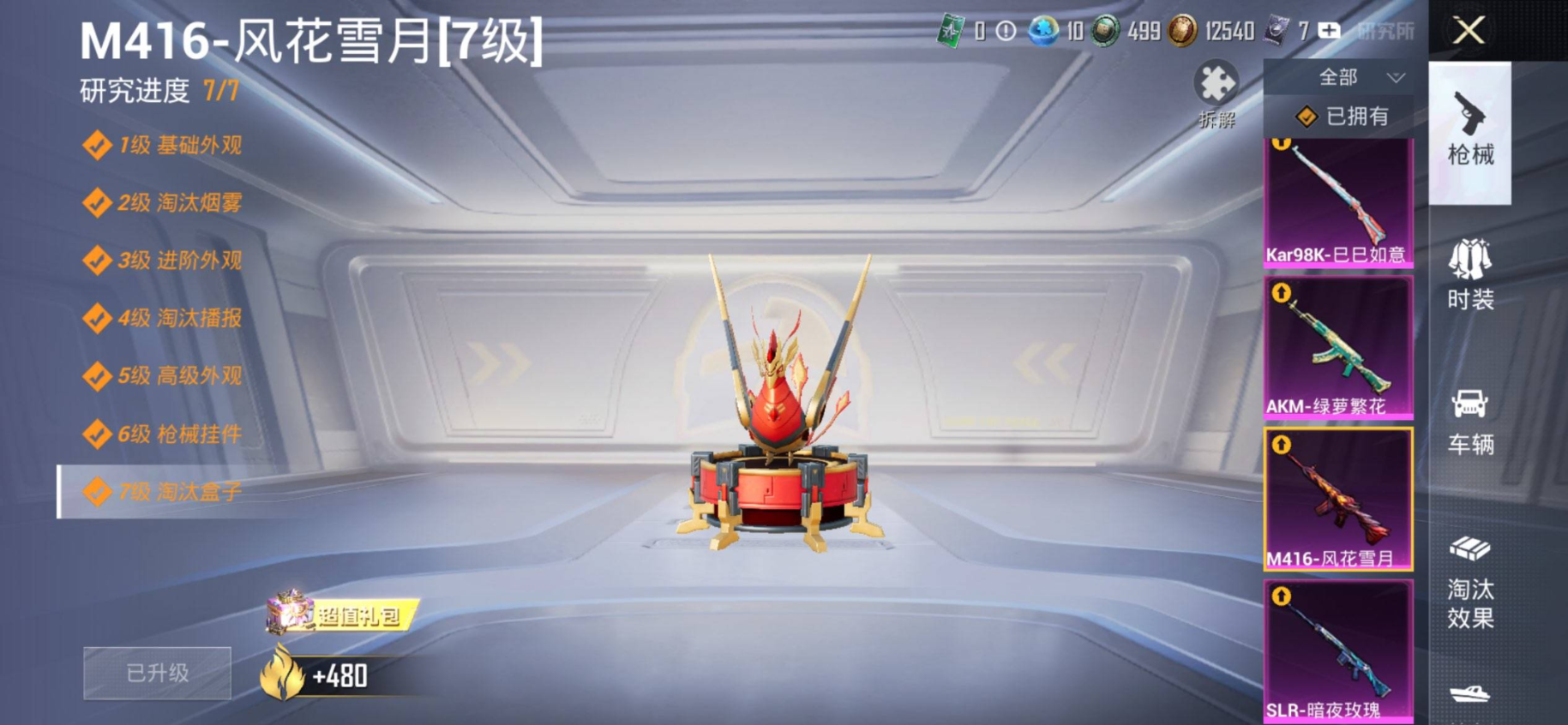 【5特效枪】SLR-暗夜玫瑰/7级,M416-风花雪月/7级,Kar98K-巳巳如意/5级,AKM-绿