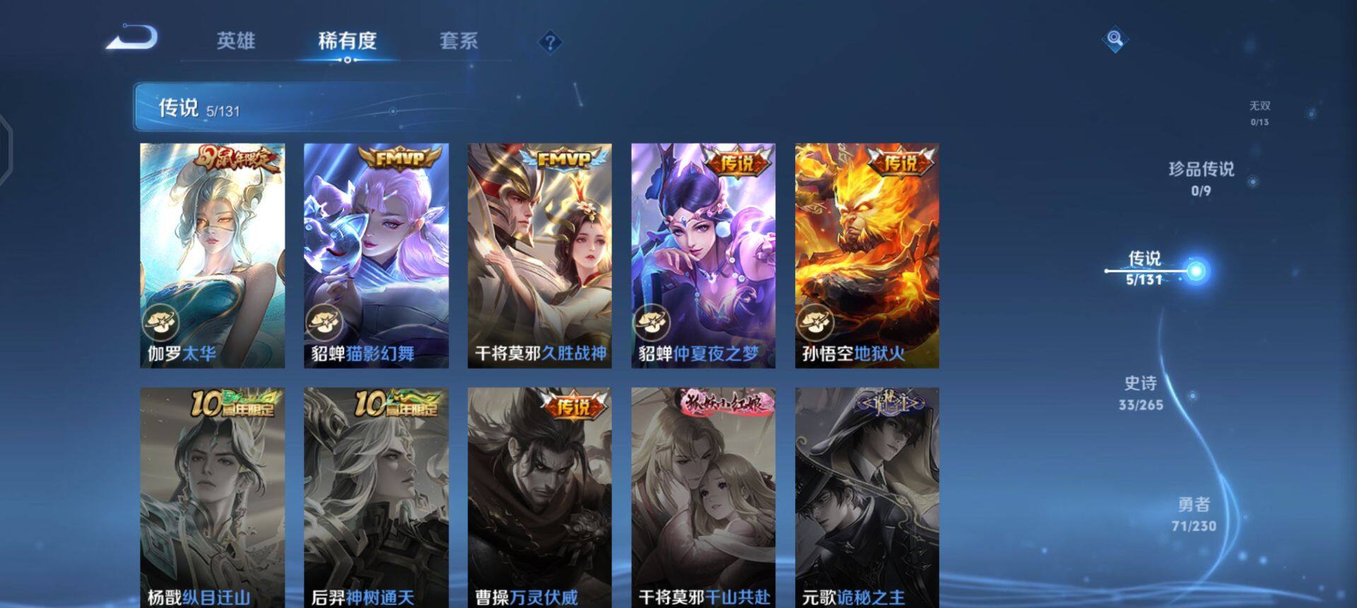 【传说皮肤】:伽罗太华,貂蝉猫影幻舞,干将莫邪久胜战神,貂蝉仲夏夜之梦,孙悟空地狱火
