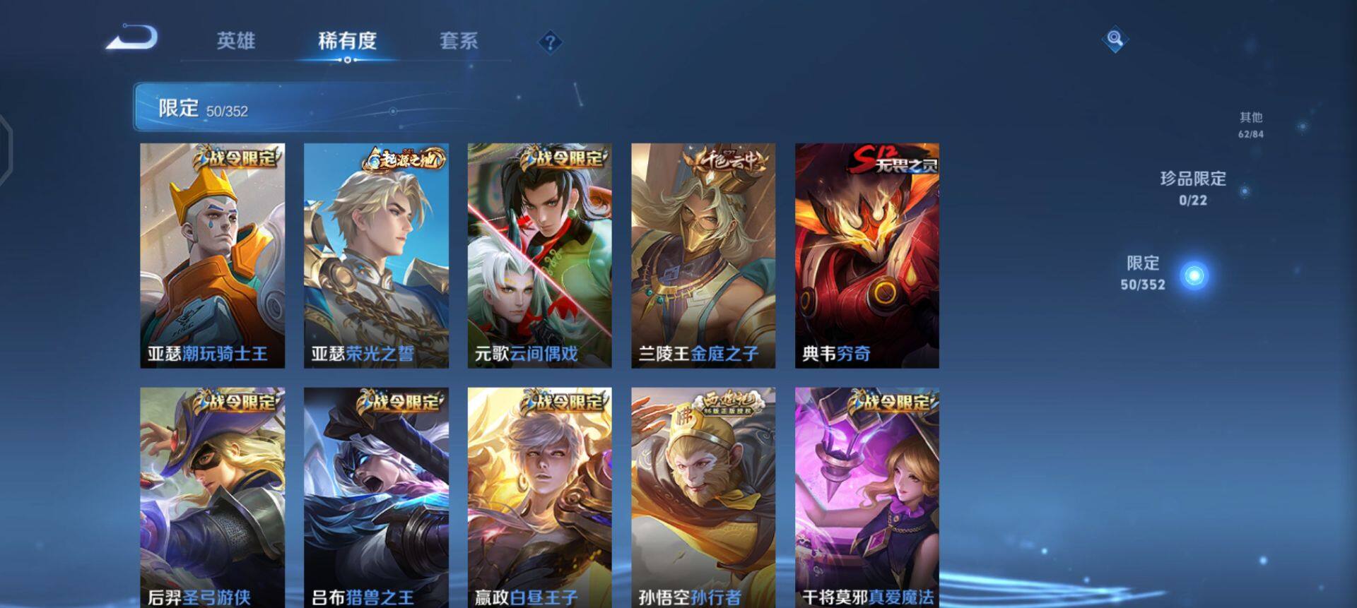 【限定皮肤】:白起狰,虞姬夏日便利店,狄仁杰阴阳师,赵云皇家上将,嬴政白昼王子,鲁班七号狮舞东方,庄周高山流水,高渐离玩趣恶龙,扁鹊炼金王,芈月重