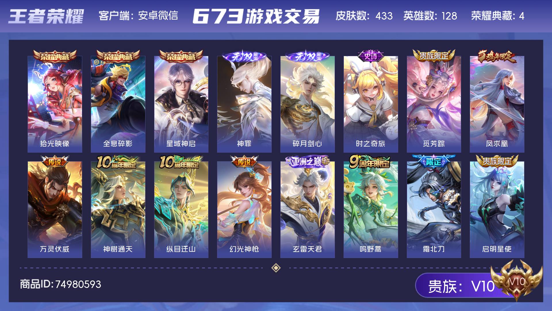 安卓微信 社交永久限制 皮肤433 英雄128 荣耀王者 荣耀典藏4 无双皮肤2 珍品传说1 传说27 其他皮肤164- 1小国9金标 433皮肤4典藏2无双3星元27传 社交永久限制