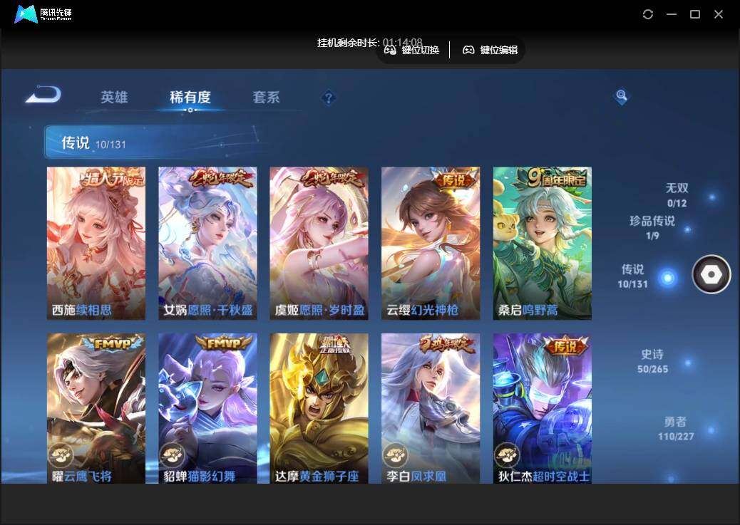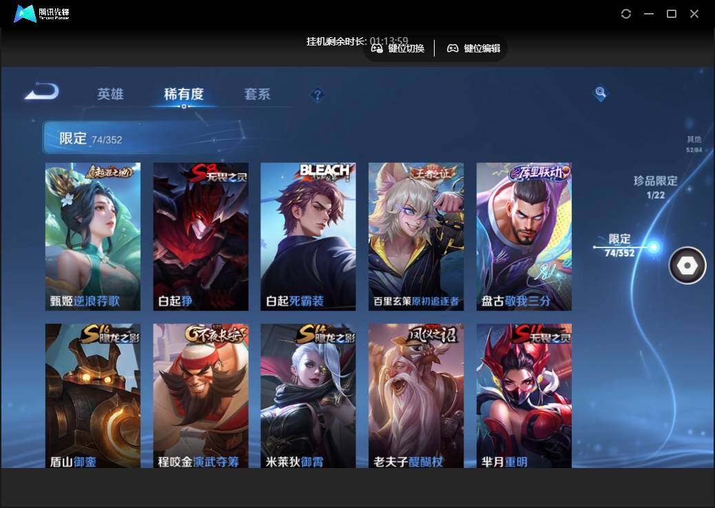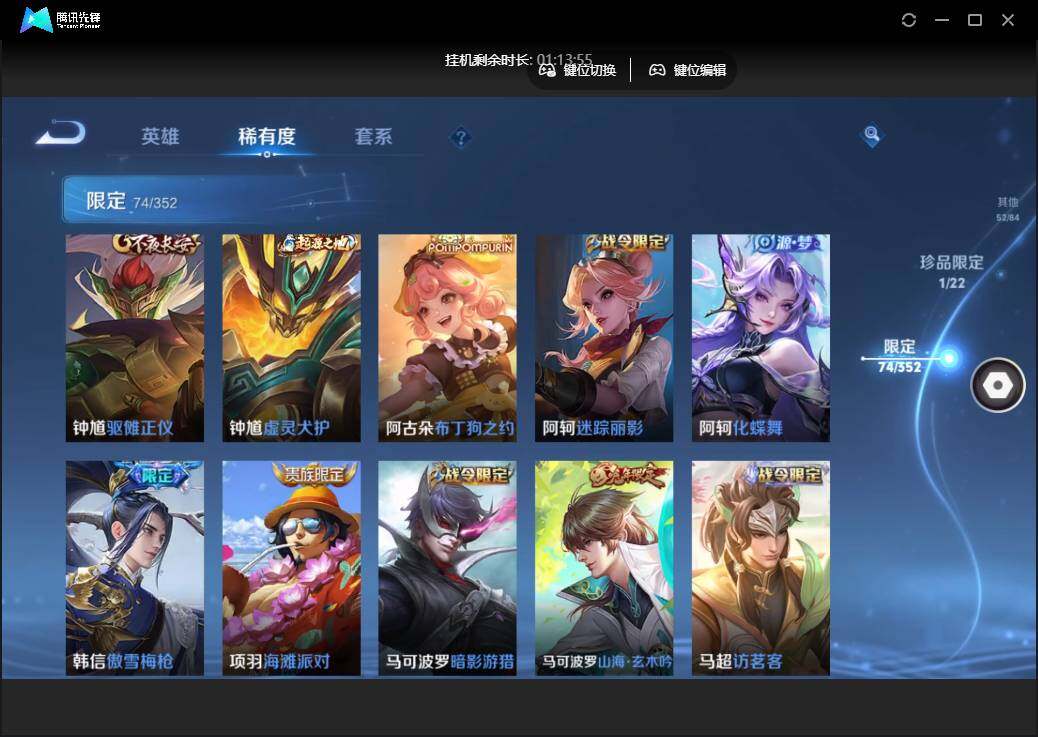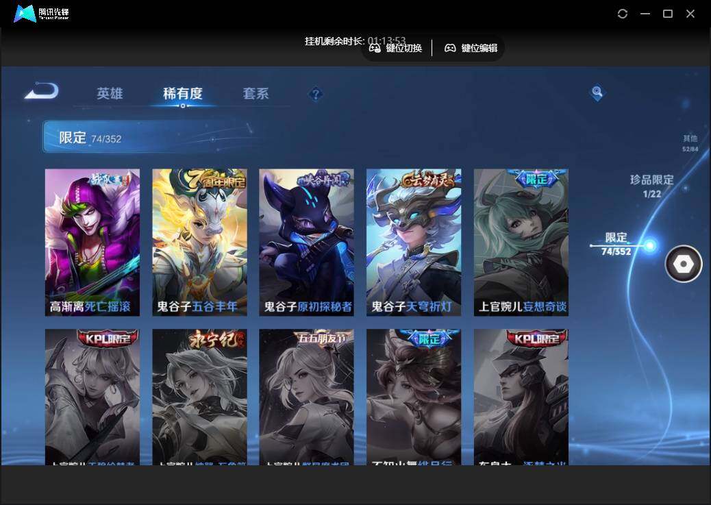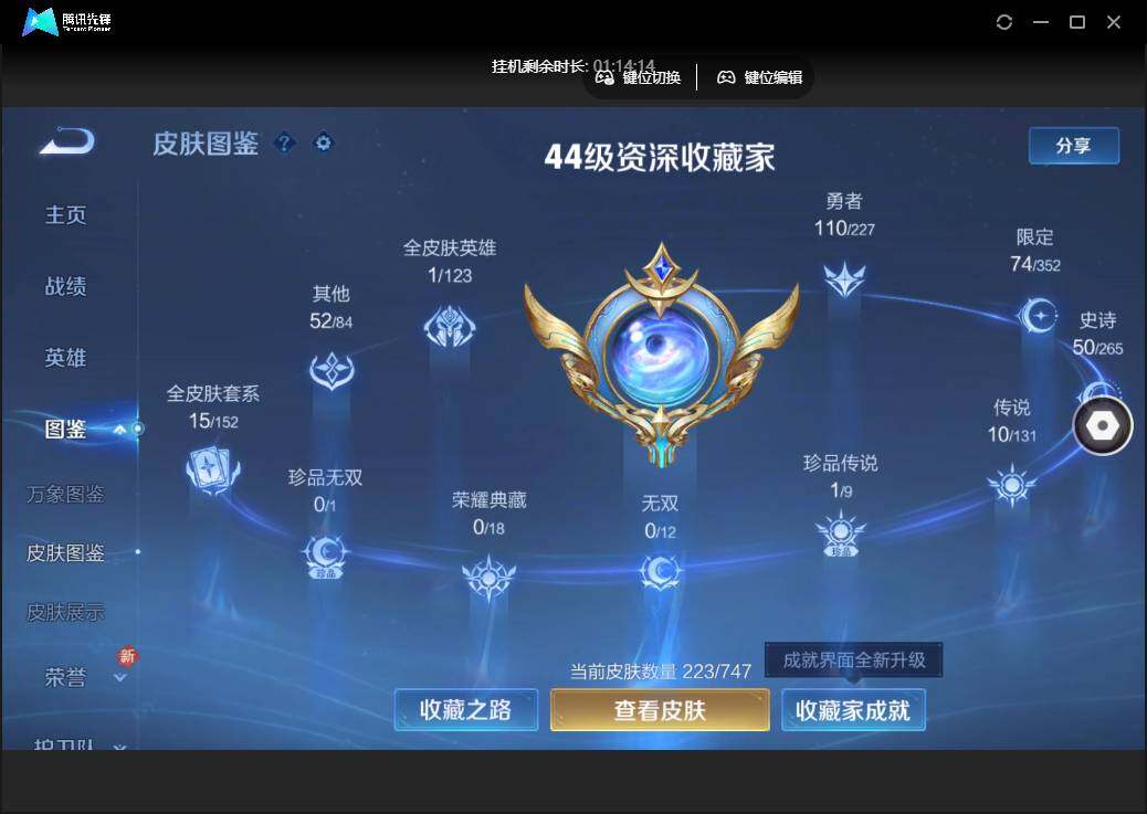 雄-223皮肤-1珍品传说-10传说-74限定-5个性按键.1天幕.贵族积分3.3万-