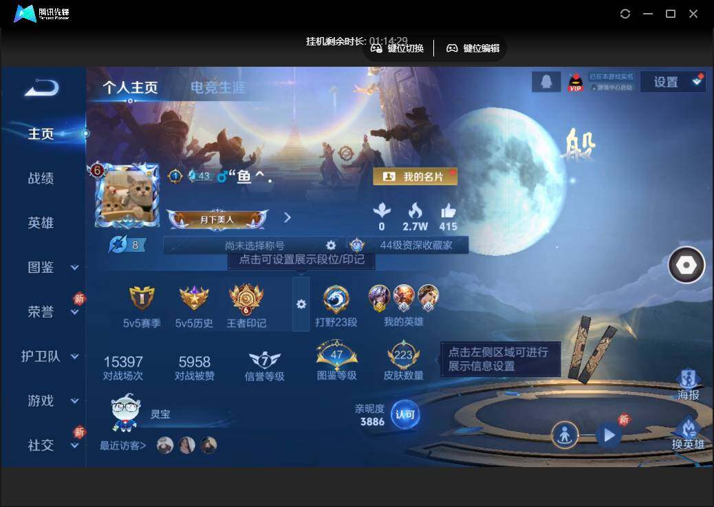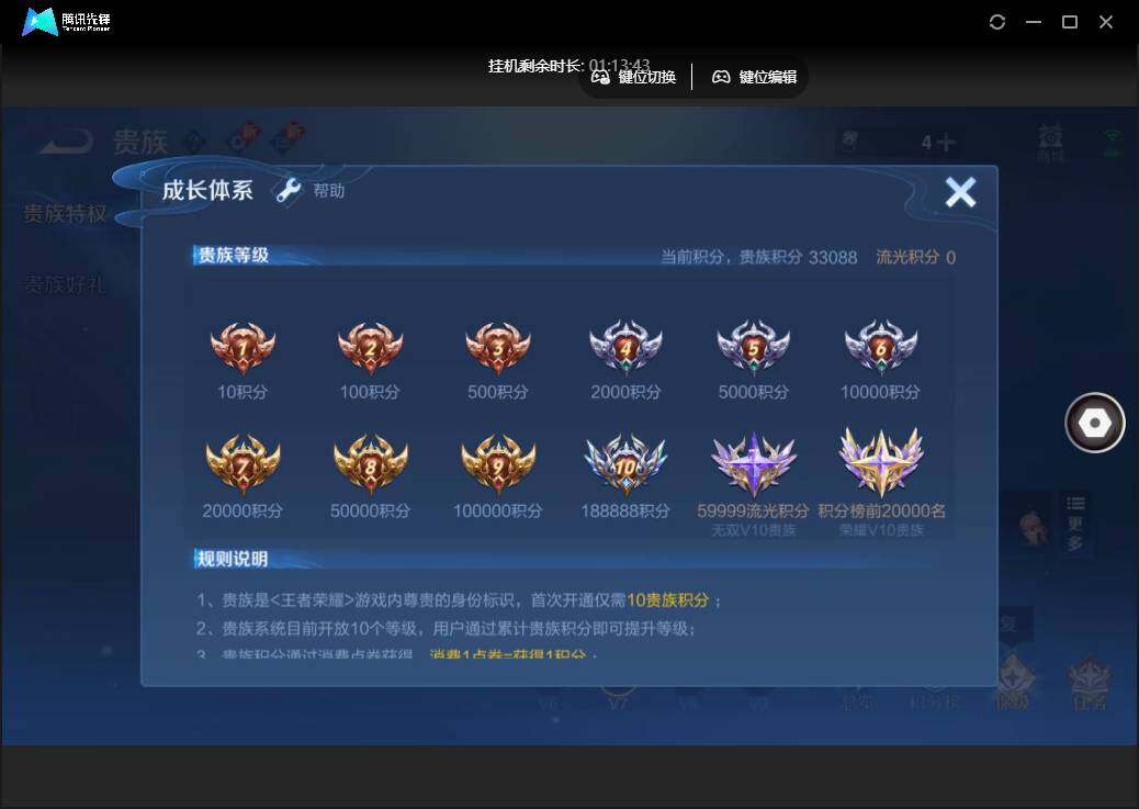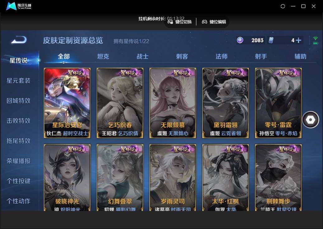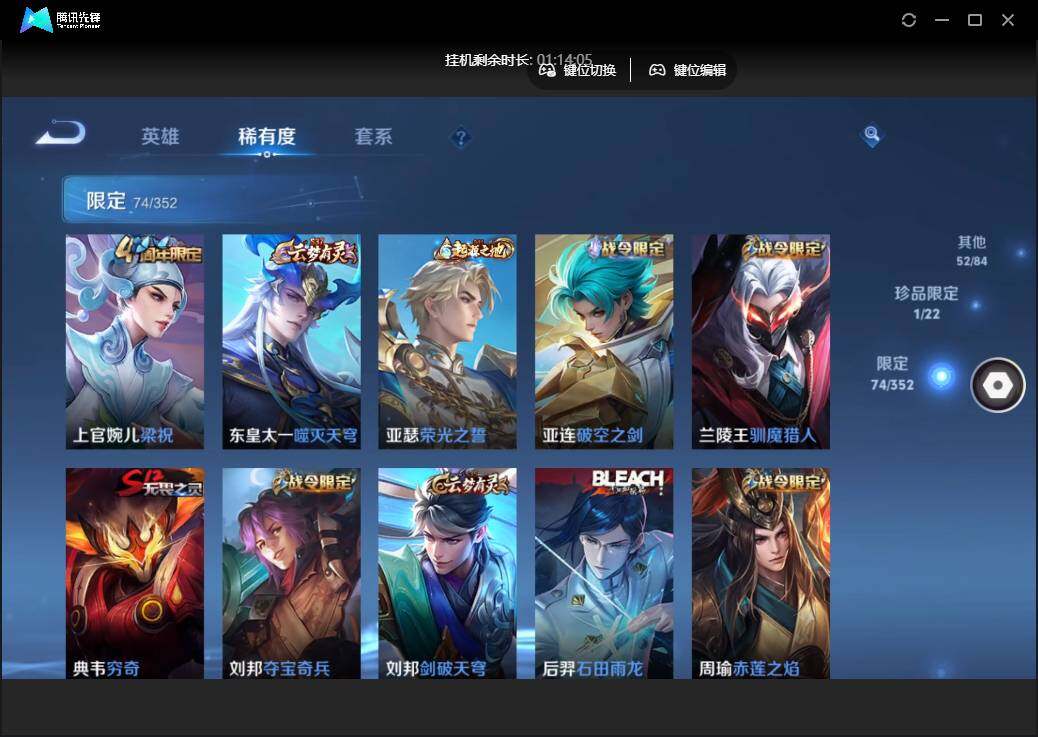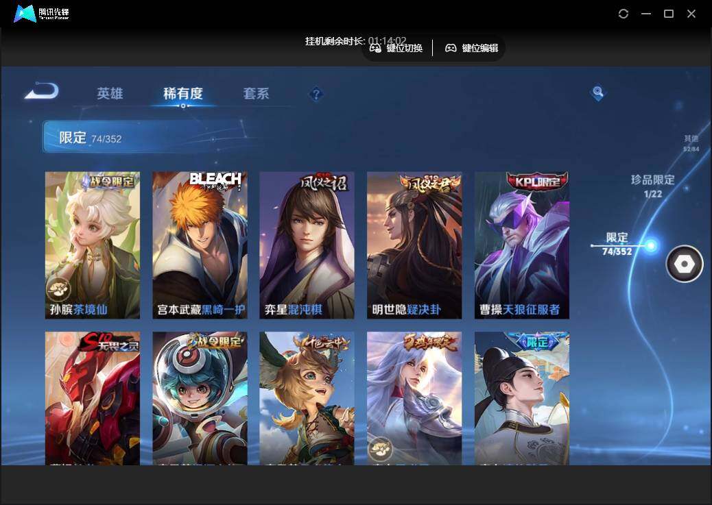 雄-223皮肤-1珍品传说-10传说-74限定-5个性按键.1天幕.贵族积分3.3万-