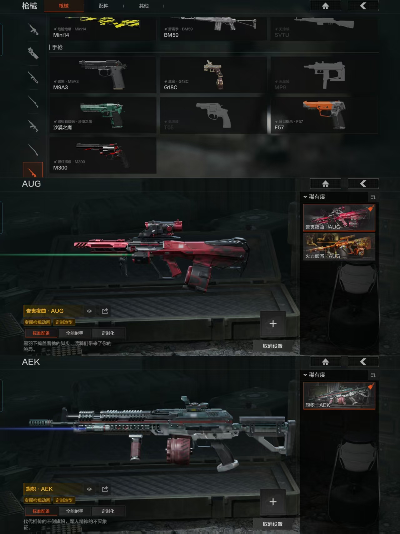 MWT4200安卓Q-等级30-仓库价值62k-科恩币36k-【套装】 使徒·欧瑞恩 【枪皮】 告丧夜曲·AUG 旗帜·AEK 告丧夜曲·AR57 旧王圣谕·QBZ191 利齿风暴·MPX 【近战武器】 裁决手杖剑 赢家匕首