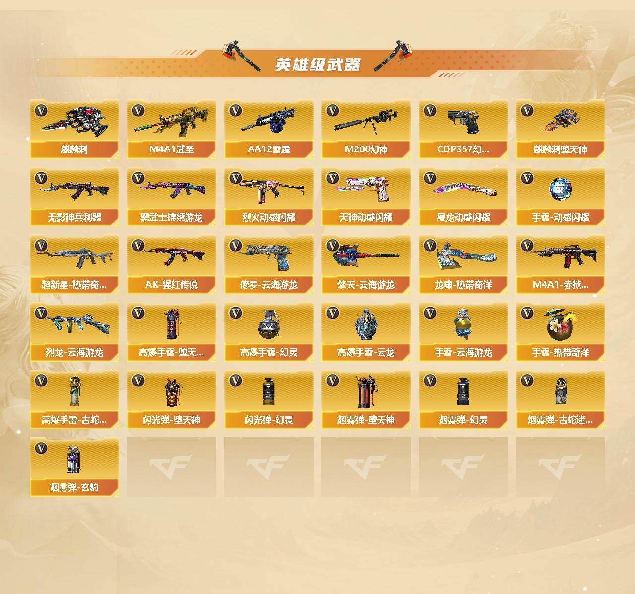【热门武器】:QBZ03-金色蔷薇,Scar Light-白虎,M4A1-青龙,M200-幻神,金色蔷薇-古蛇迷踪,修罗-古蛇迷踪,死亡之眼,M4A1-黑骑士,汤姆逊-烈龙*6,RPK-盘龙,COP 357-幻灵,沙鹰-修罗*2,黄金猫猫手套-白鲨