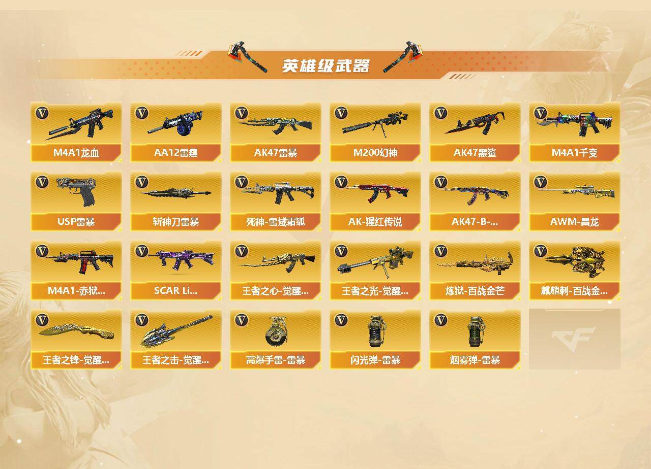 【热门武器】:QBZ03-金色蔷薇*2,M200-幻神,M4A1-黑骑士,加特林-炼狱*2,斯泰尔-蝴蝶,USP-雷暴*2,沙鹰-修罗*2
