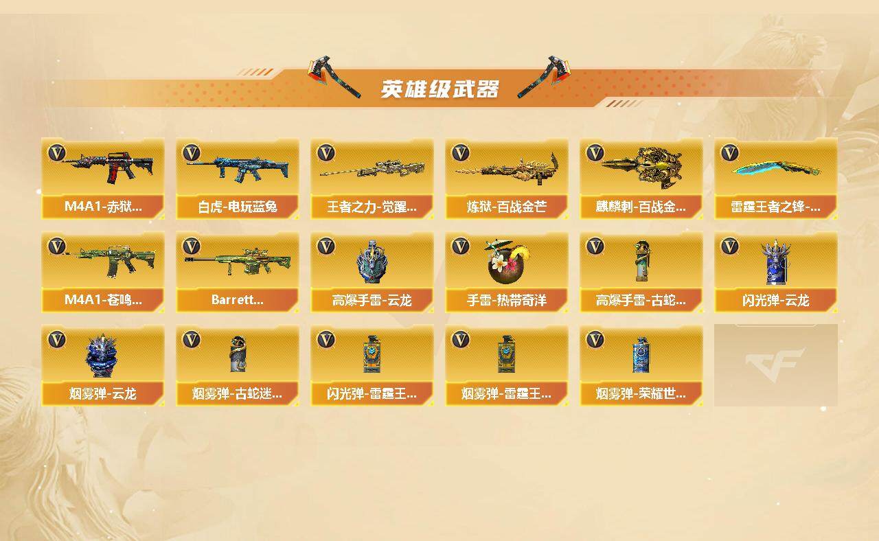 【热门武器】:QBZ03-金色蔷薇,M200-幻神,修罗-古蛇迷踪,死亡之眼,白虎-电玩蓝兔,M4A1-黑骑士,汤姆逊-烈龙,加特林-炼狱