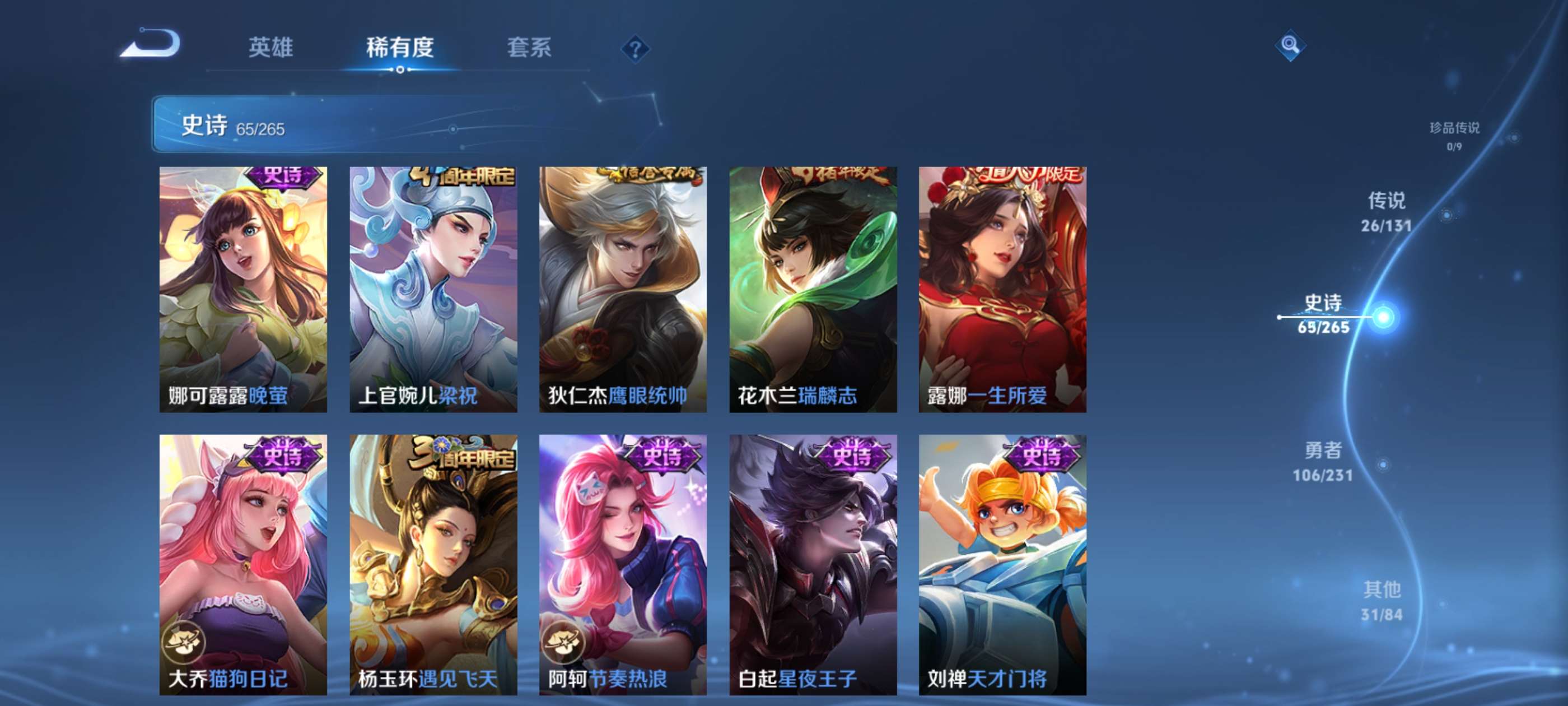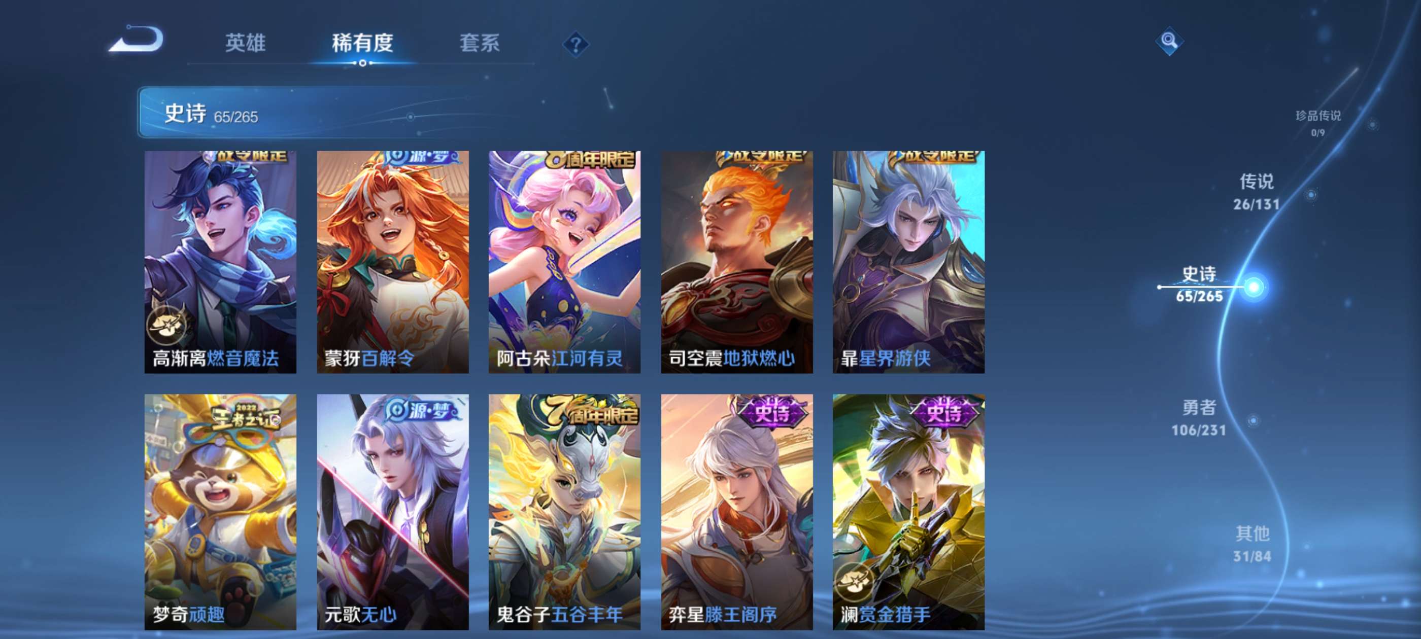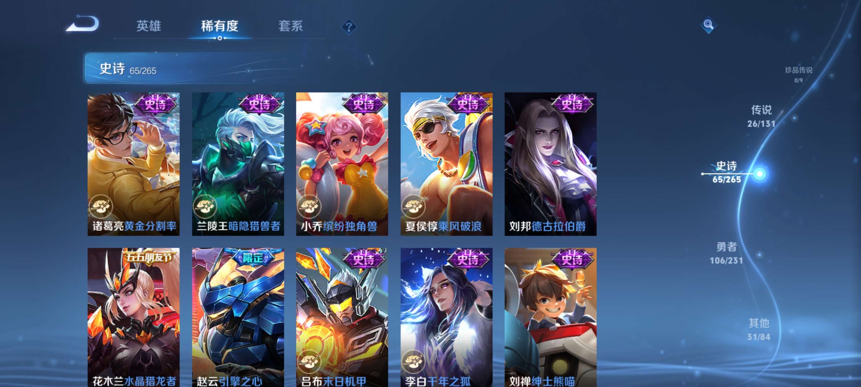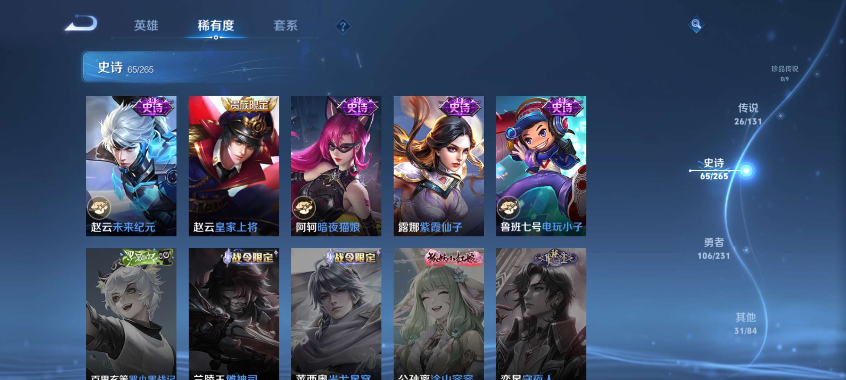 有意者来,虽然是贵族8但是限定皮肤数量还可以,喜欢玩打野射手对抗的可以考虑考虑,曜是全皮