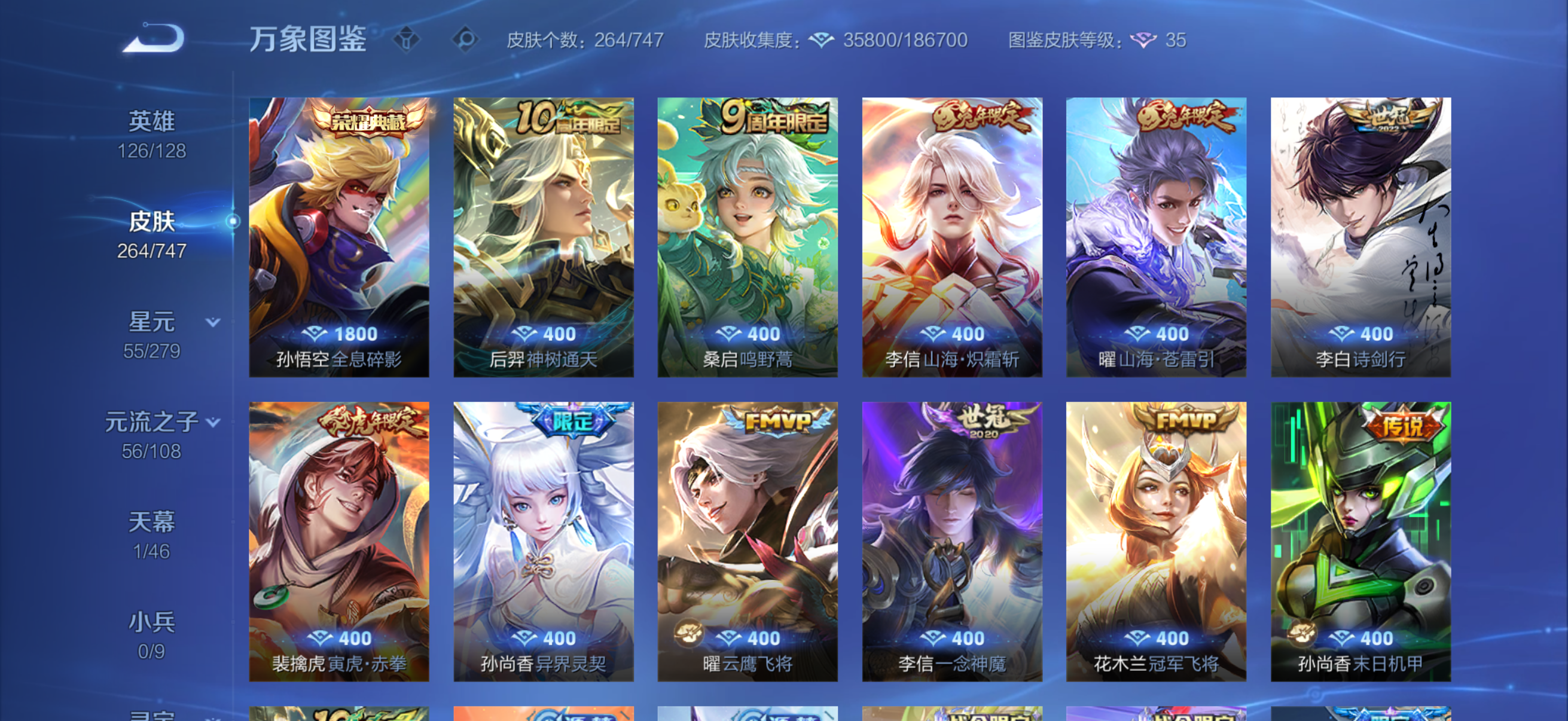 皮肤264 英雄126 无双王者 荣耀典藏1 传说11 其他皮肤105-急出11传说 70史诗